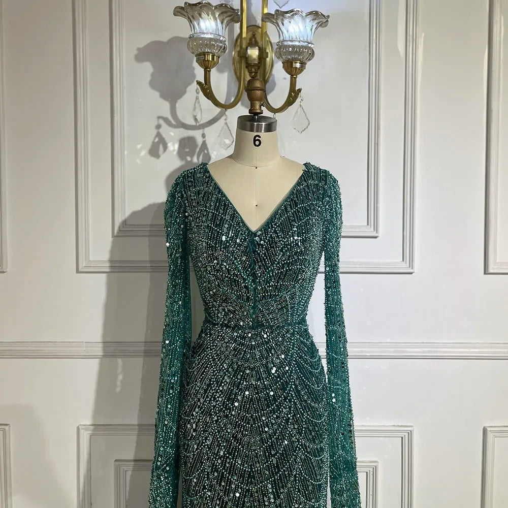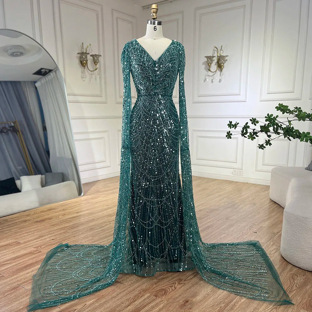 Serene Hill Arabic White Luxury Pearls Beaded Mermaid Cape Sleeves Evening Gowns 2024 For Women Wedding Party LA72160