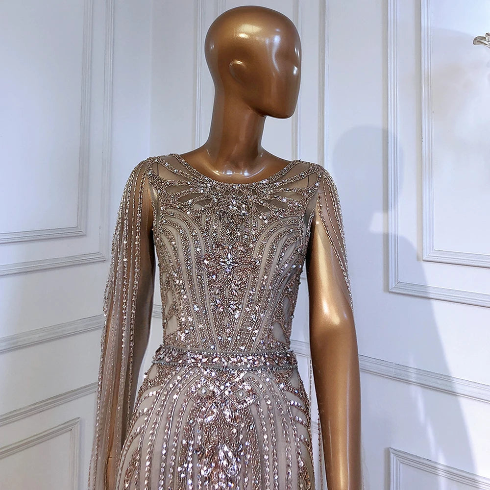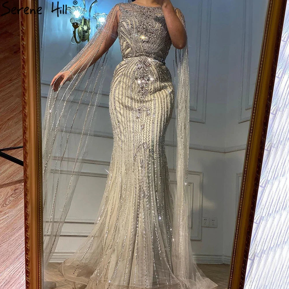 Serene Hill Brown Mermaid Elegant 2024 With Cape Sleeves Beaded Luxury Evening Dresses Gowns For Women Party LA70638