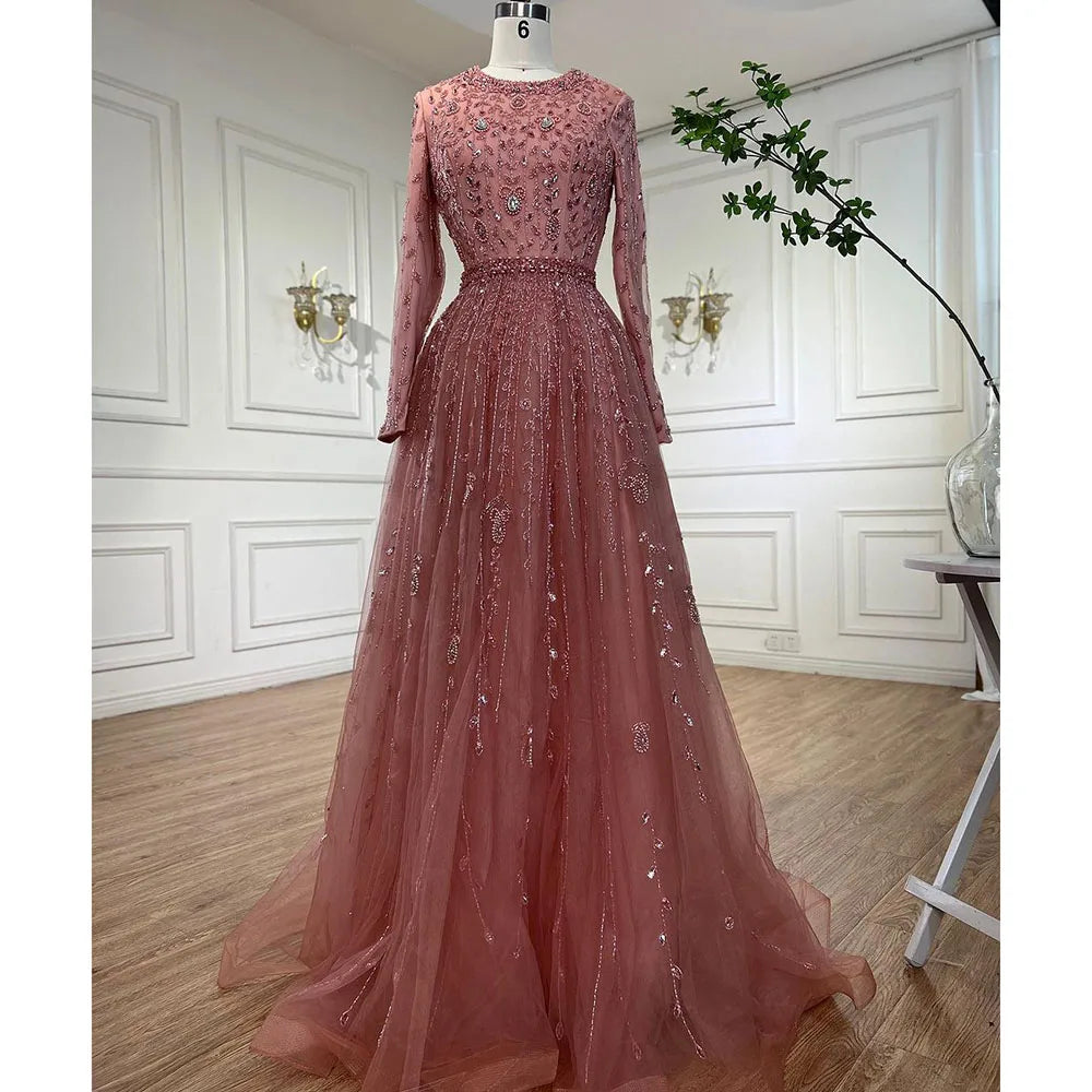Serene Hill Peach Long Sleeves A-line Muslim Evening Dresses Luxury Beaded Dubai Wedding Party Gowns 2024 For Women GLA71803C