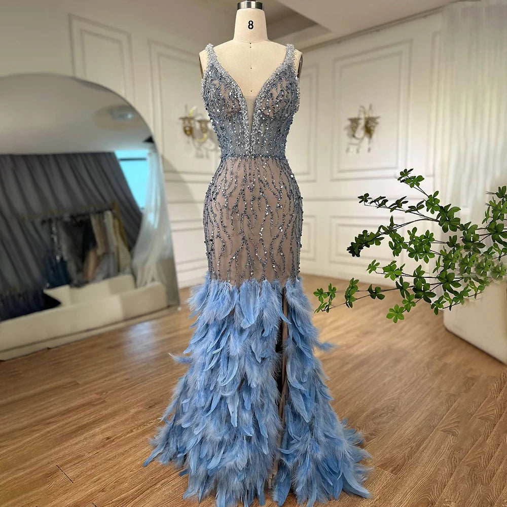 Serene Hill Pink Mermaid High Split Luxury Evening Dresses Feather Beaded Gowns Long 2024 For Women Wedding Party LA72152
