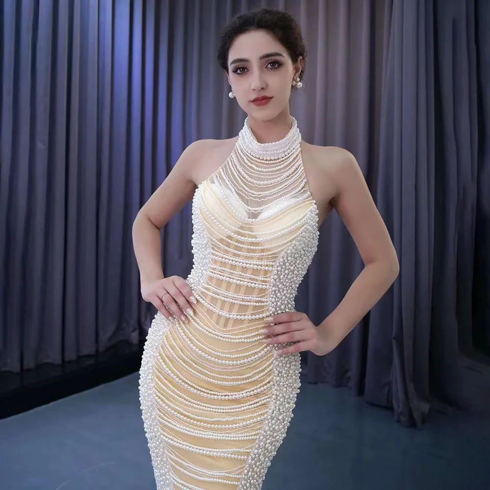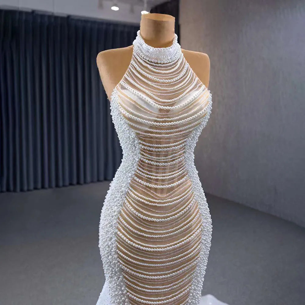Serene Hill White champagne Mermaid Lace Up Luxury Pearls Beaded Bride Gowns Wedding Dress 2024 High End Custom Made HM231033