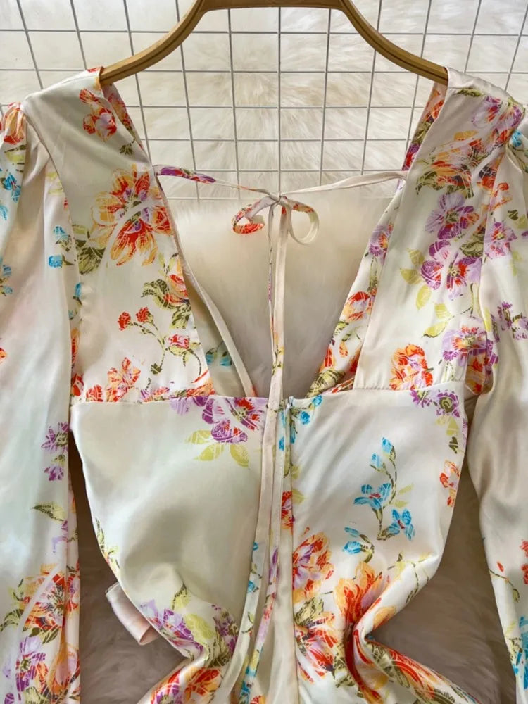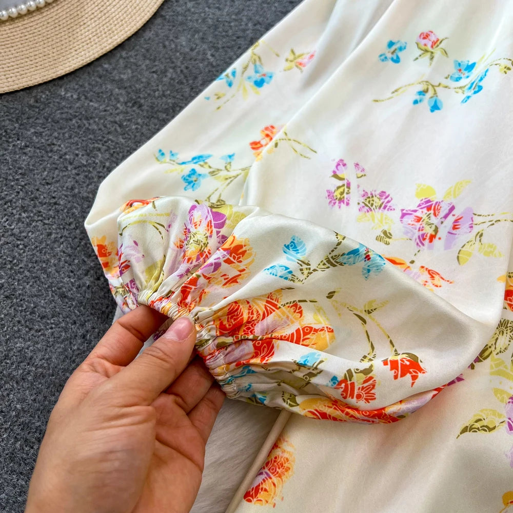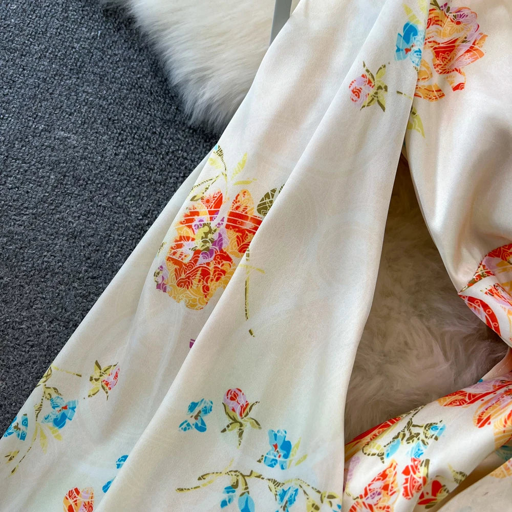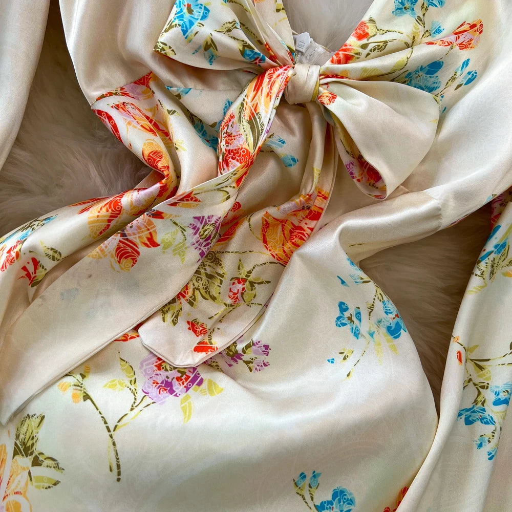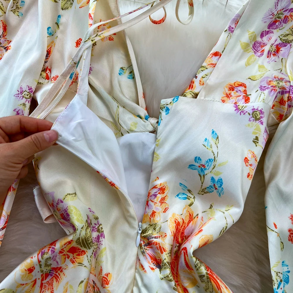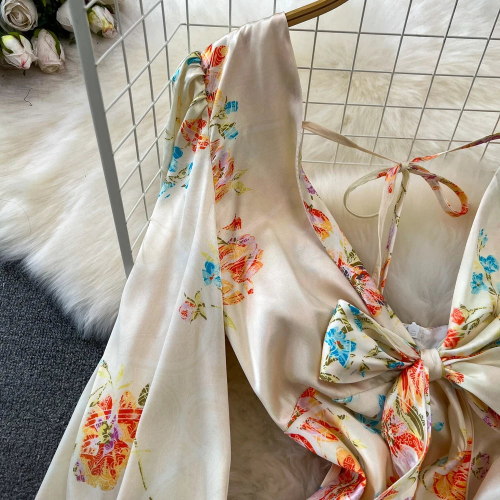 Sexy Bodycon Satin Floral Long Dresses for Women Lantern Sleeve V-Neck Slim Mermaid Evening Party Dress Prom Robe New Vestidos