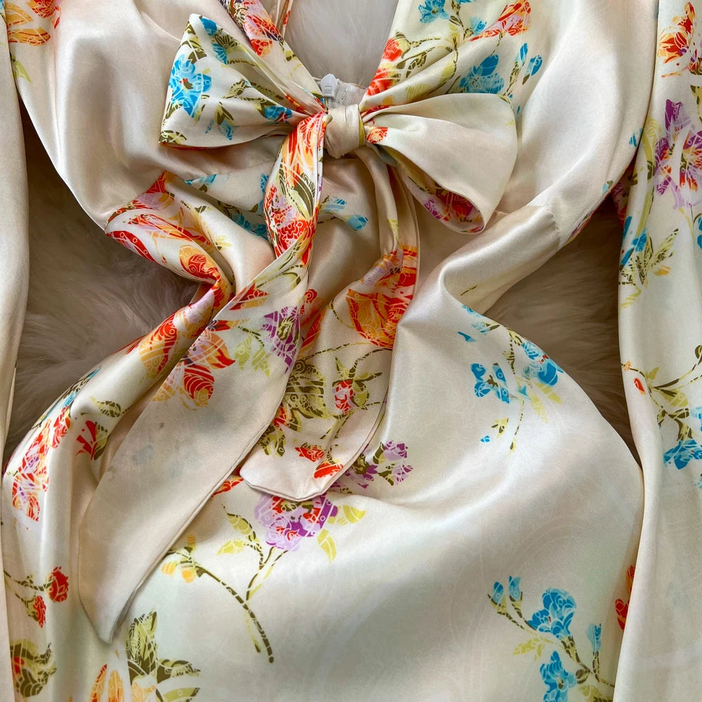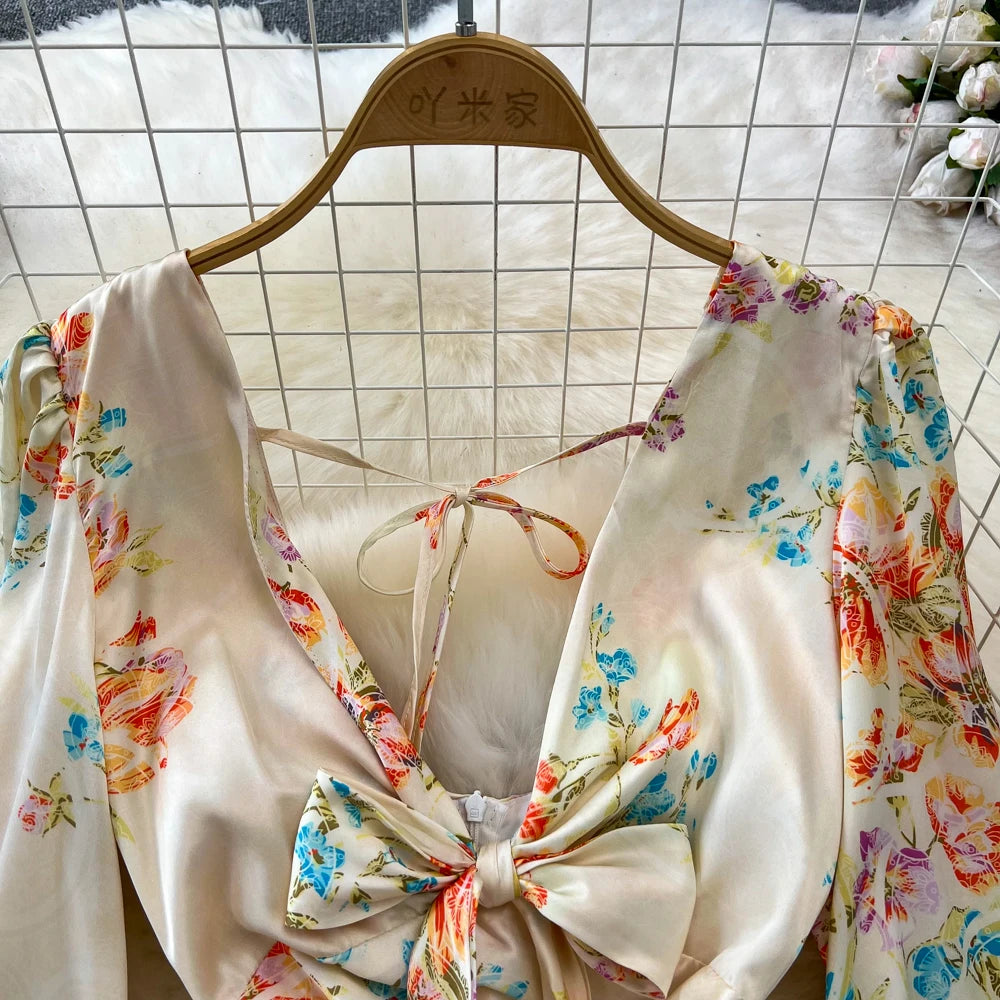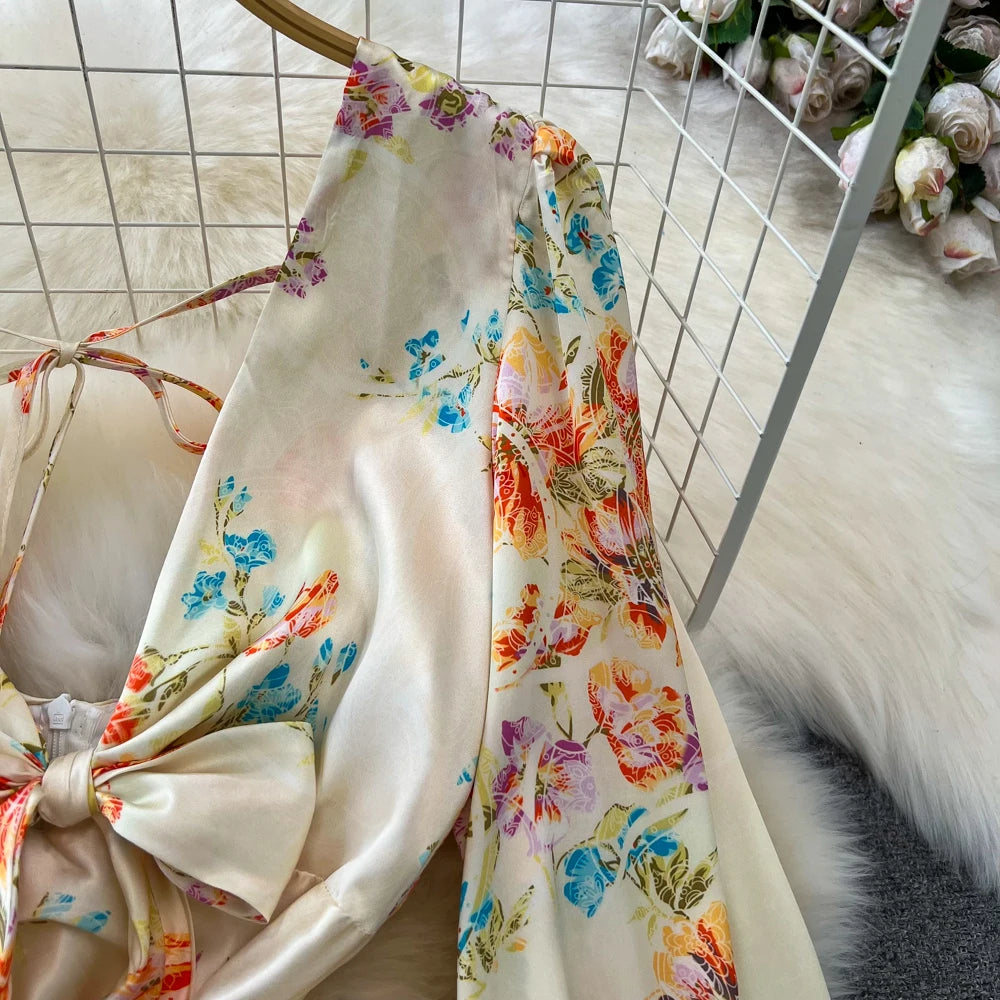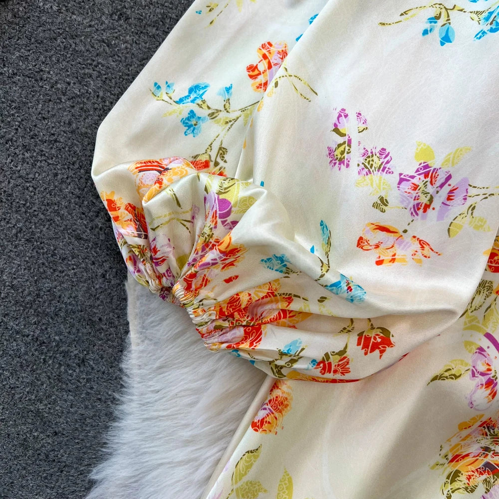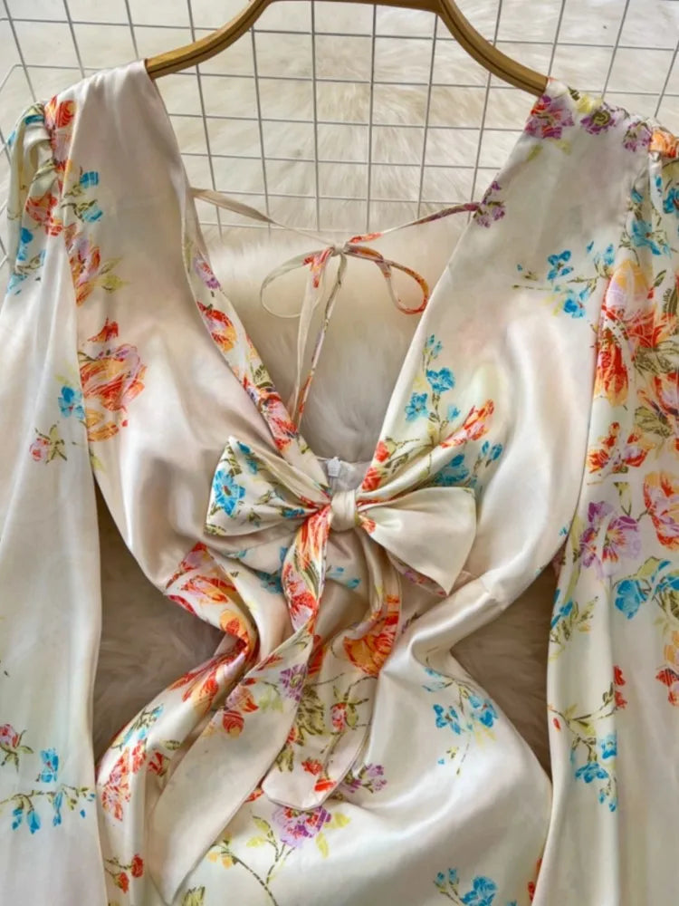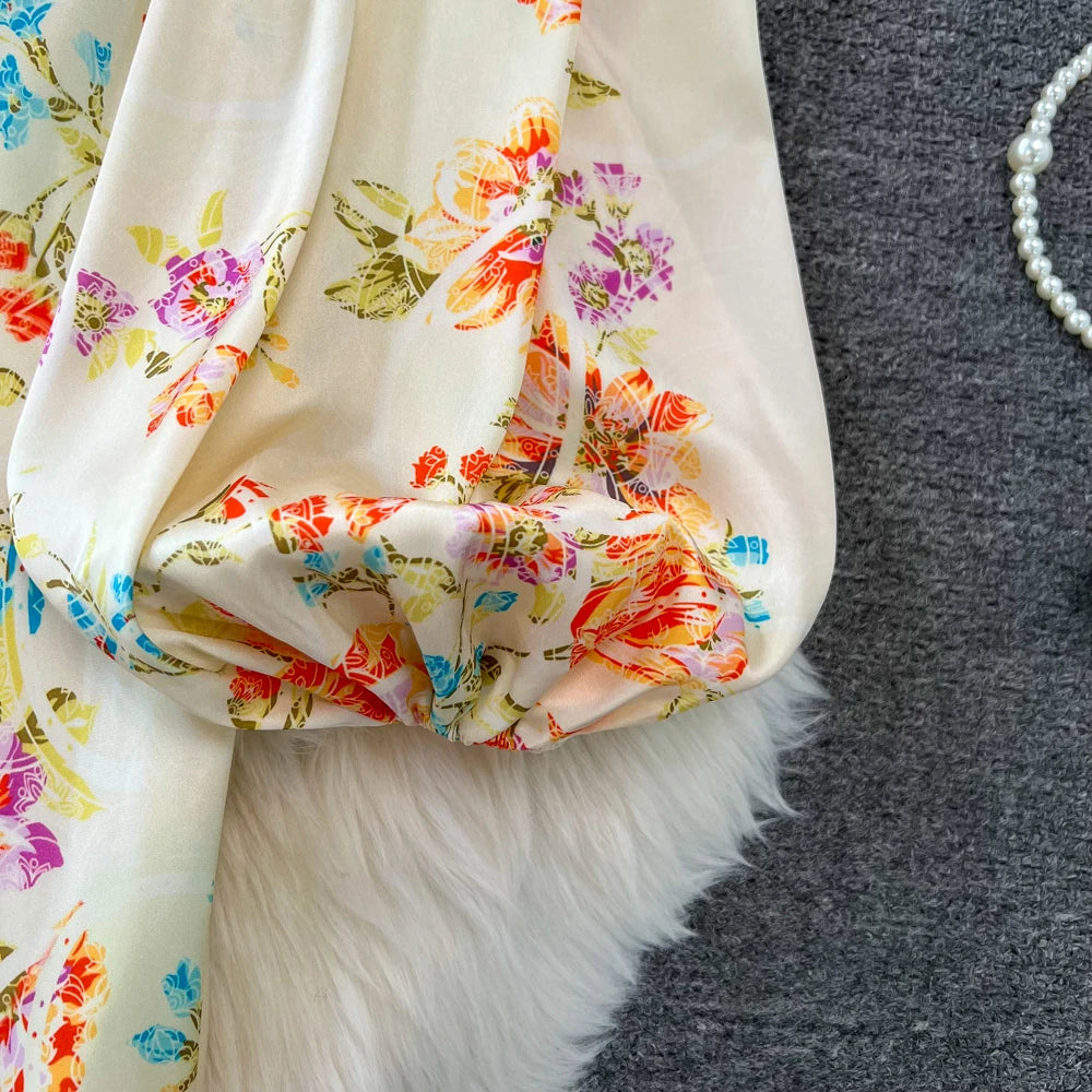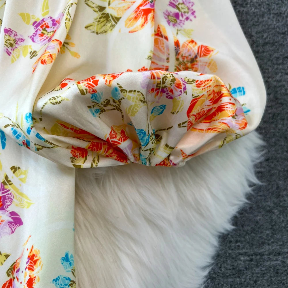 Sexy Bodycon Satin Floral Long Dresses for Women Lantern Sleeve V-Neck Slim Mermaid Evening Party Dress Prom Robe New Vestidos
