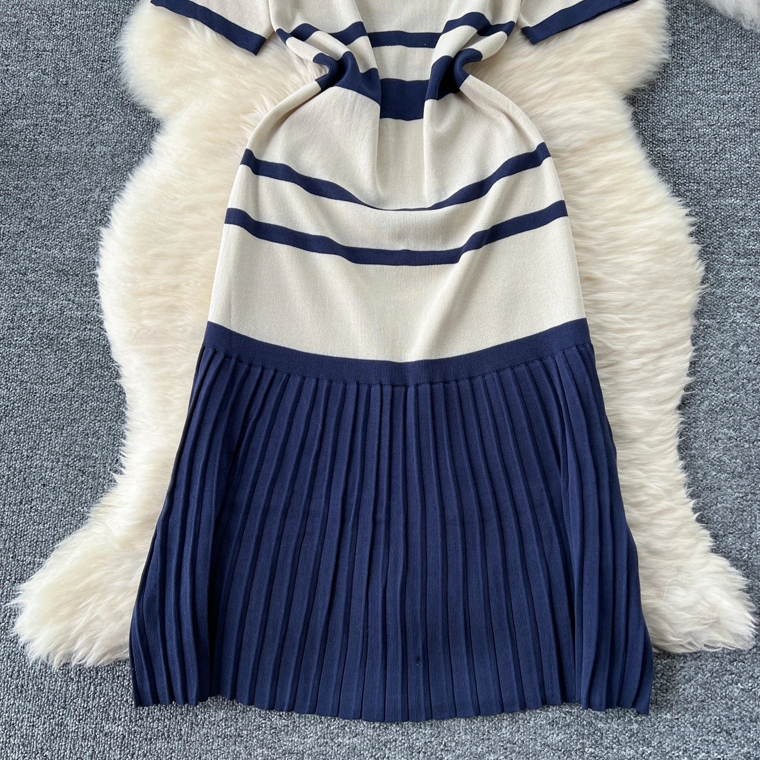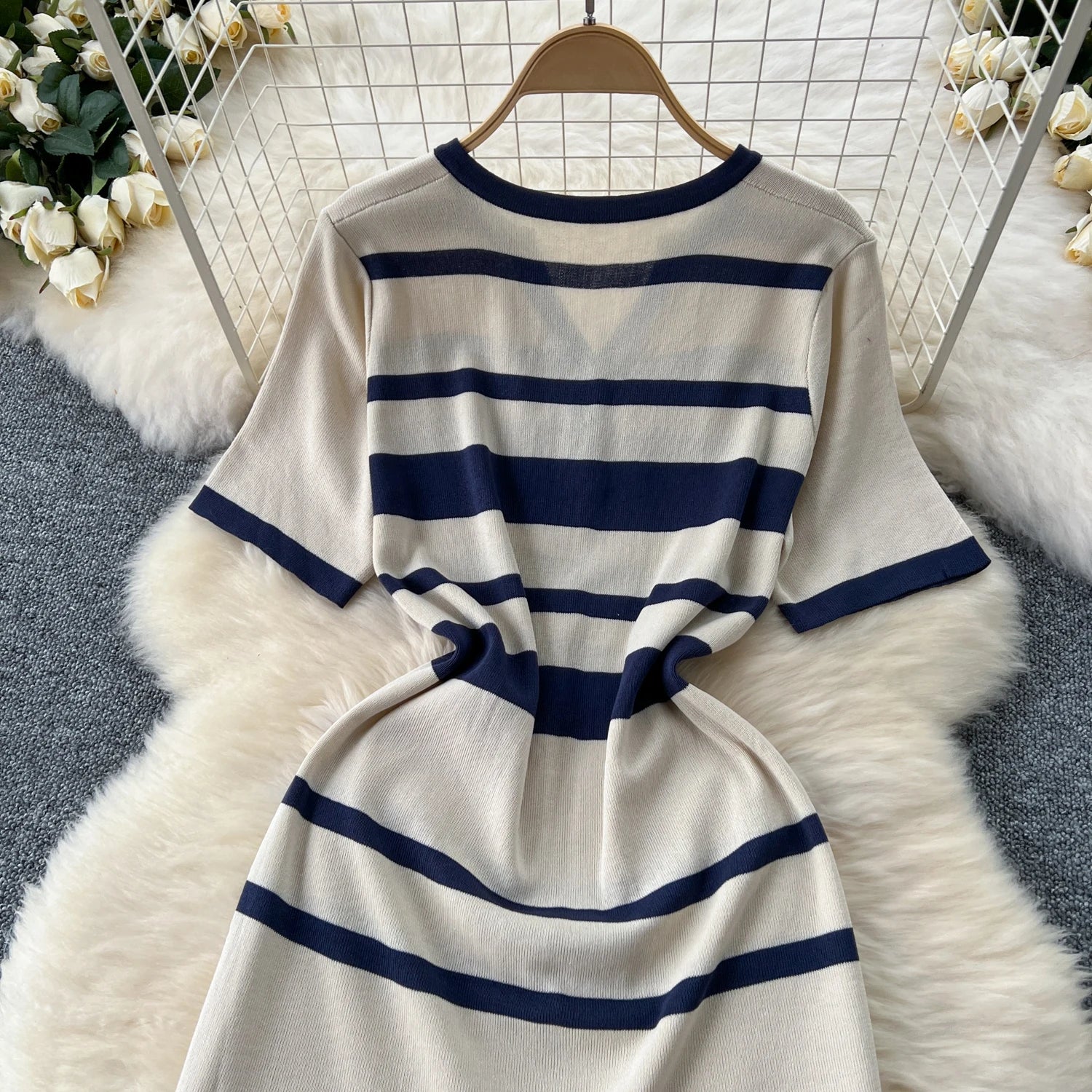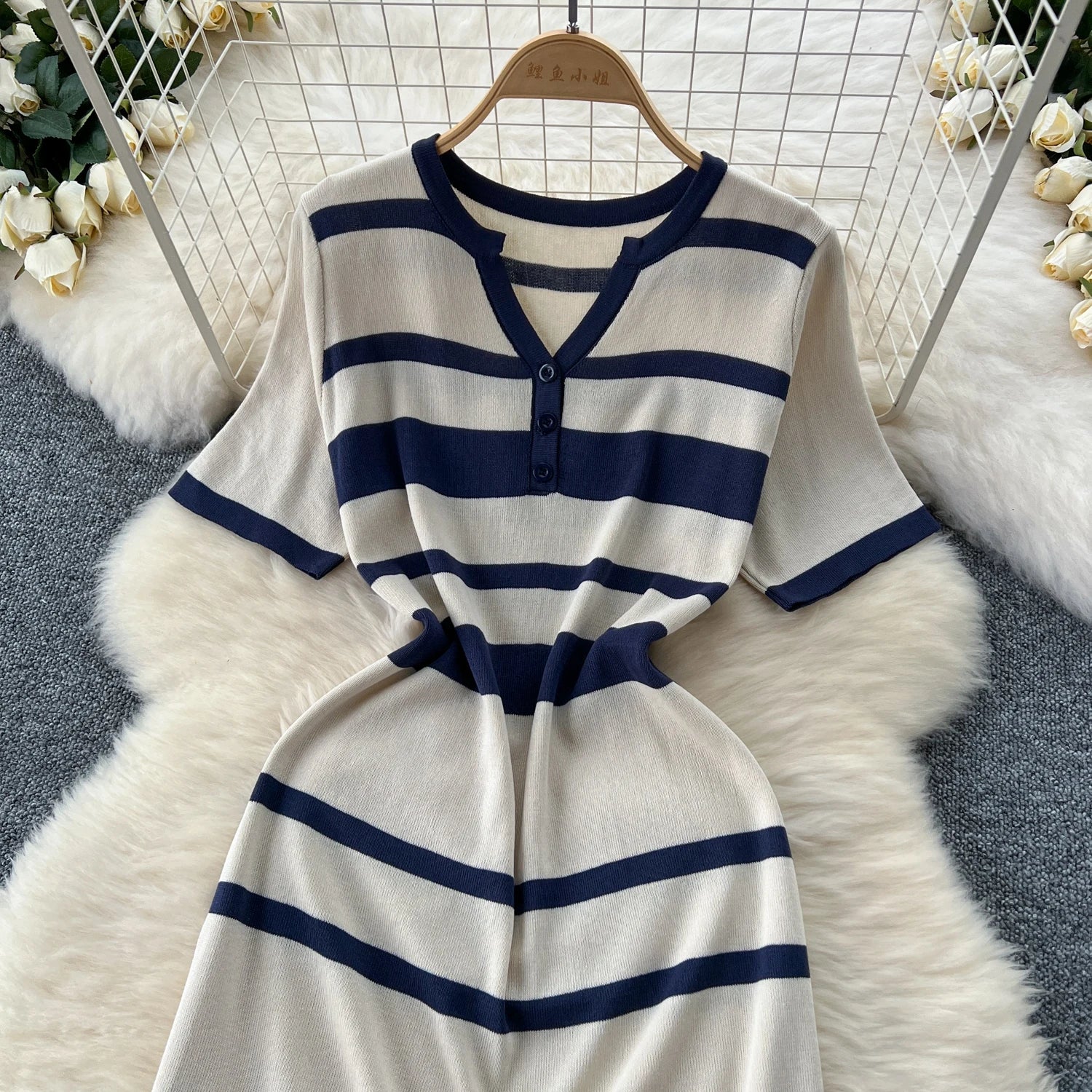 Sexy Chic short sleeve PATCHWORK v-Neck Striped Knit Dress Elegant Fashion Party Slim Summer A-line sweet dresses