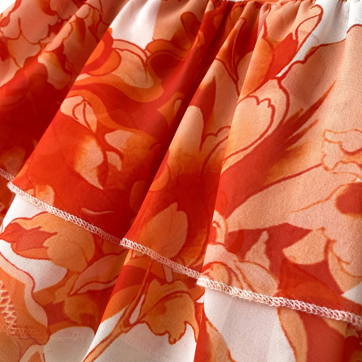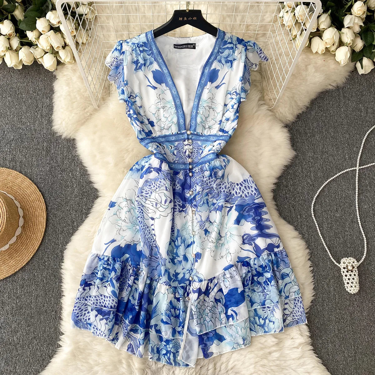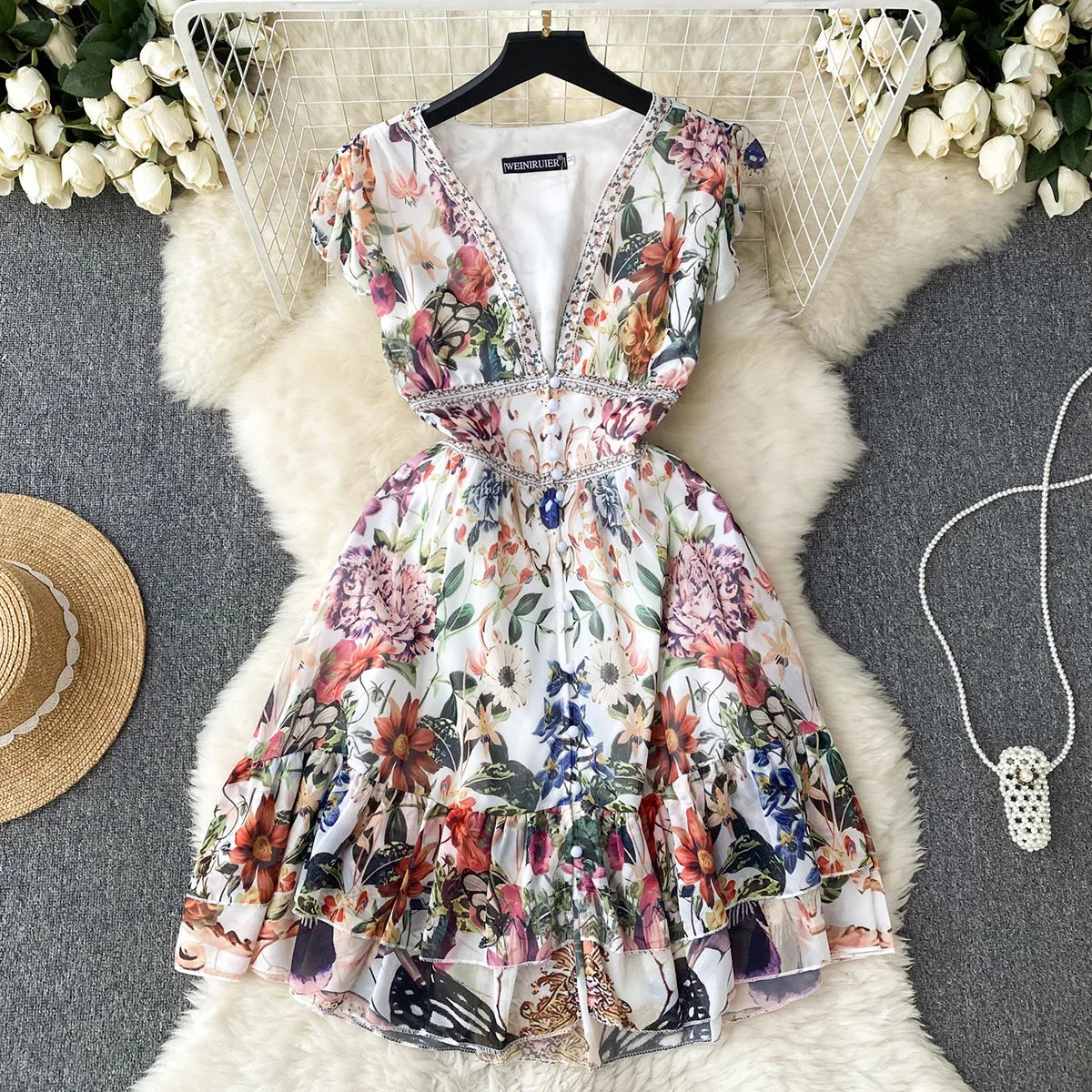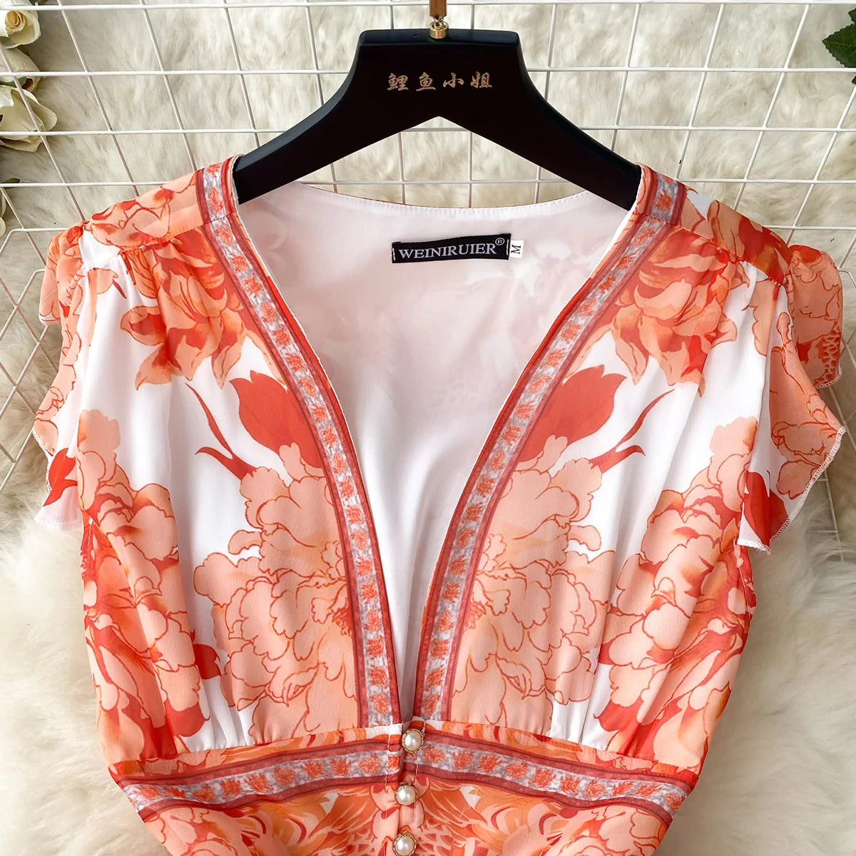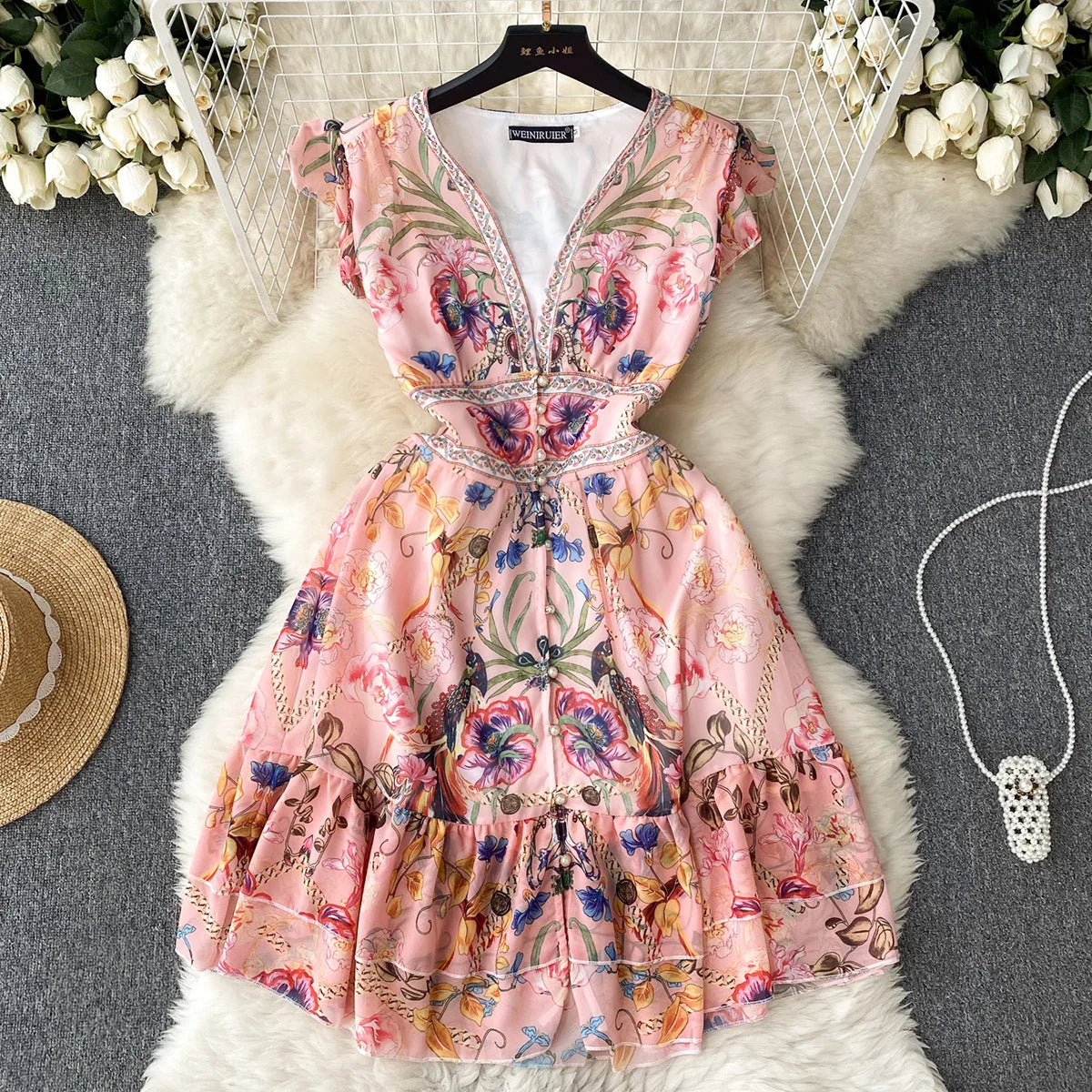 Short Dresses Women Cap Sleeve Vintage Print Chiffon Dress Faux Pearl Buttoned V Neck Ruffle Hem Wedding Elegant Party Dress