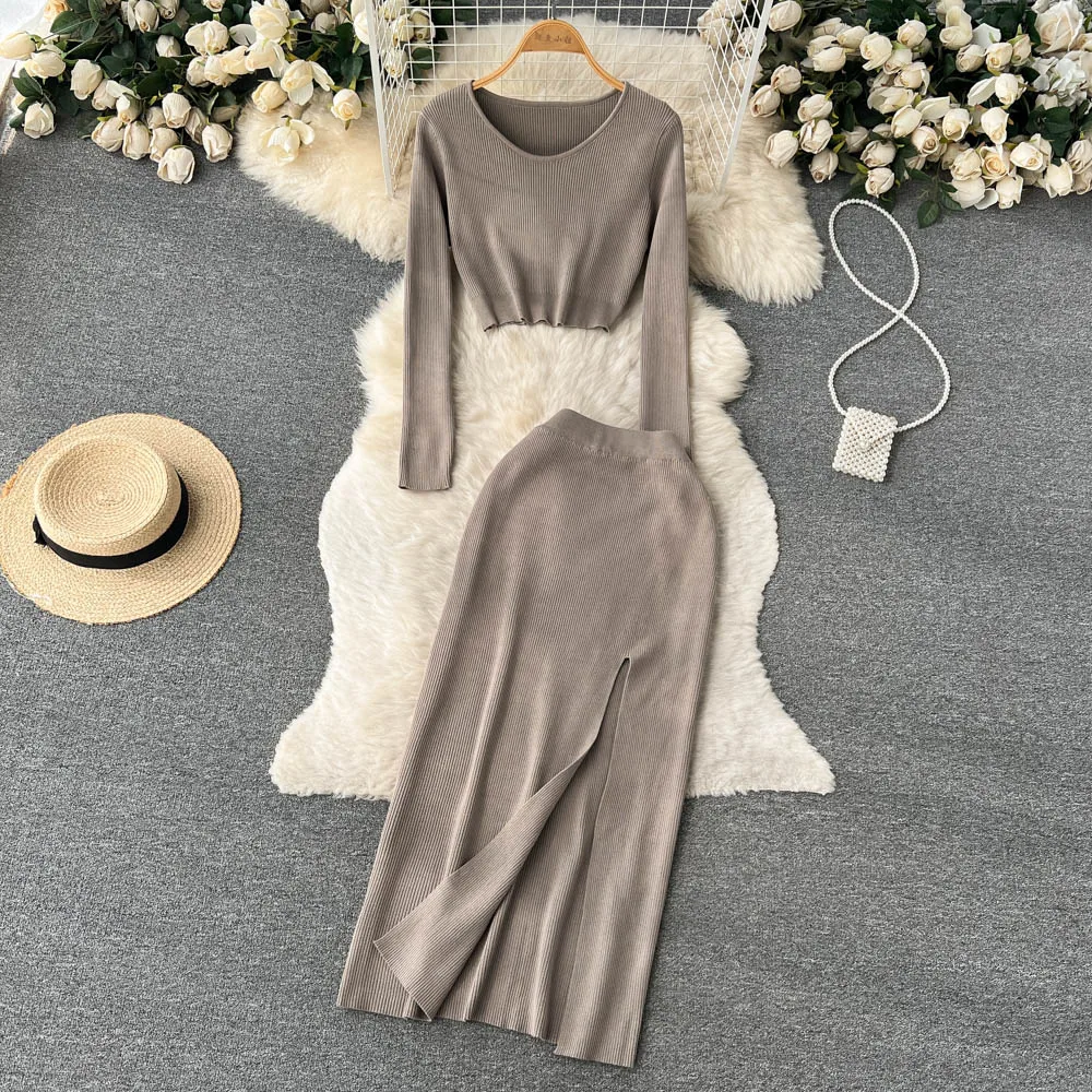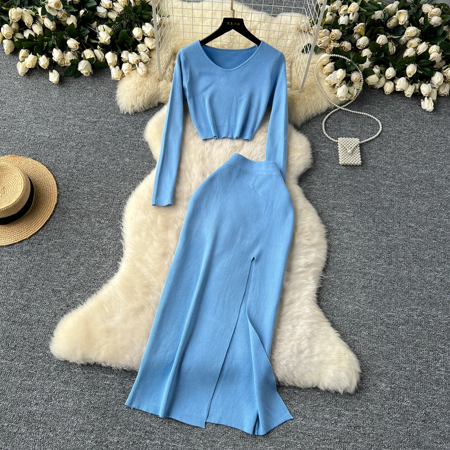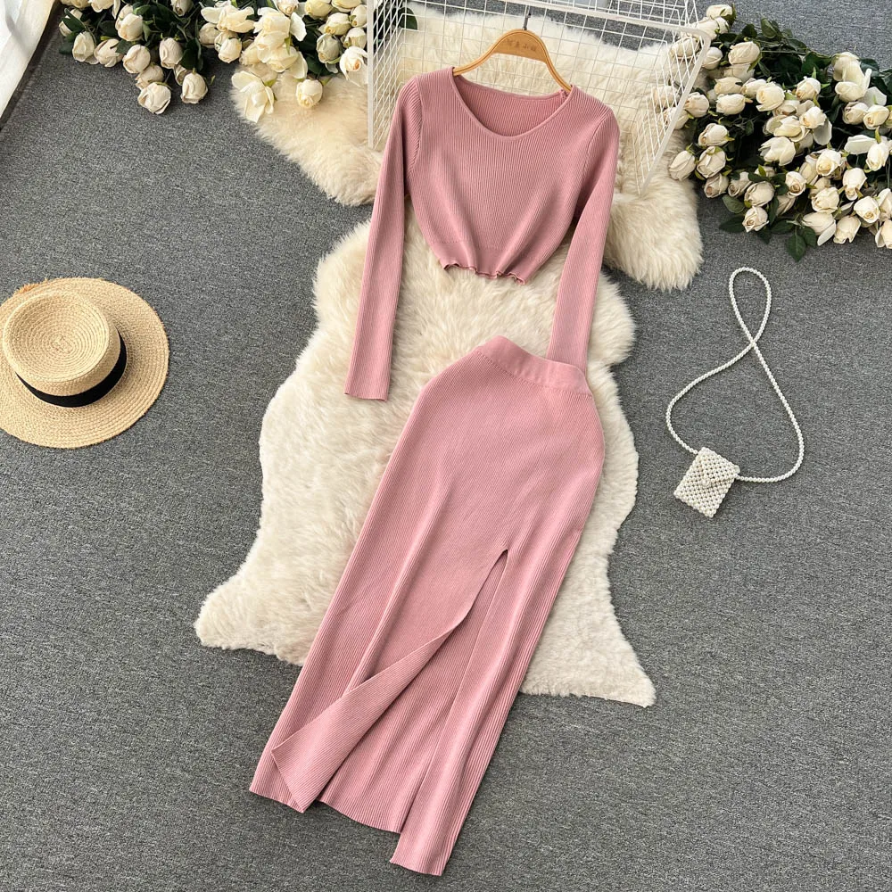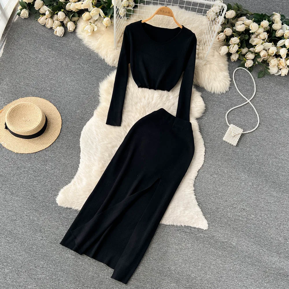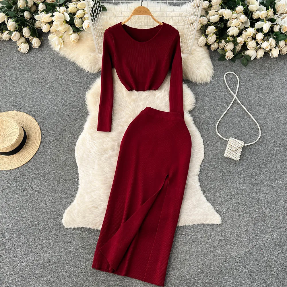 SINGREINY 2024 Autumn Skinny Knitted Sets Short Tops+Slim Long Split Skirt Women Korean Style Sweater Fashion Two Pieces Suits