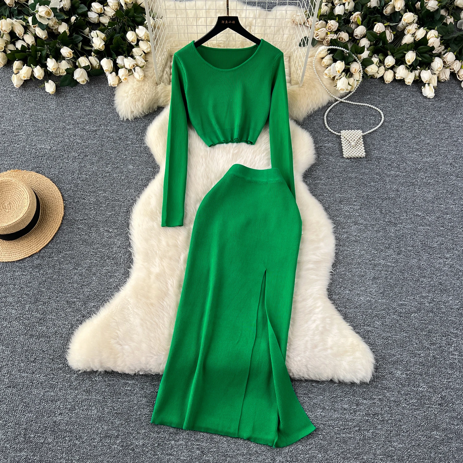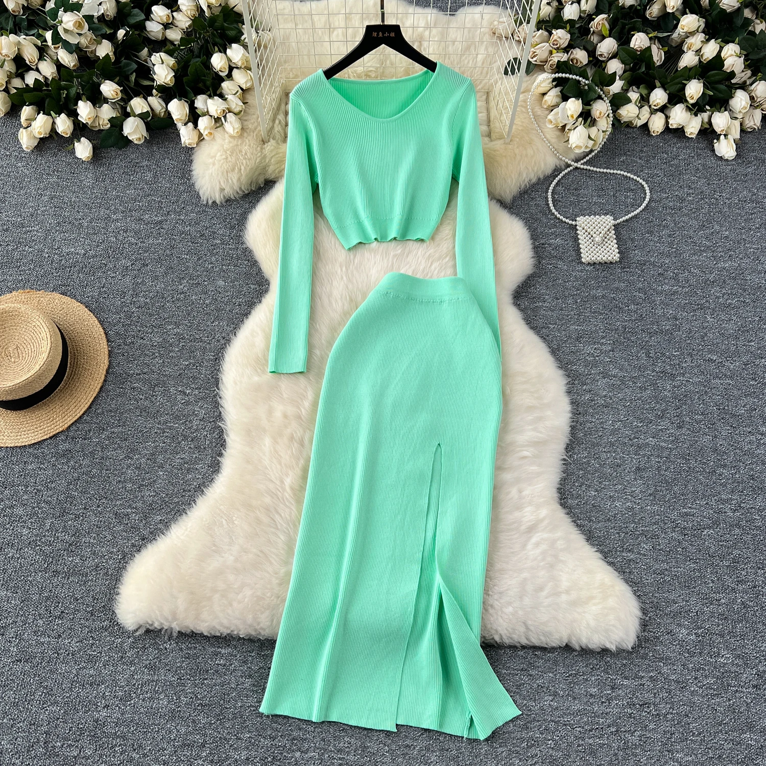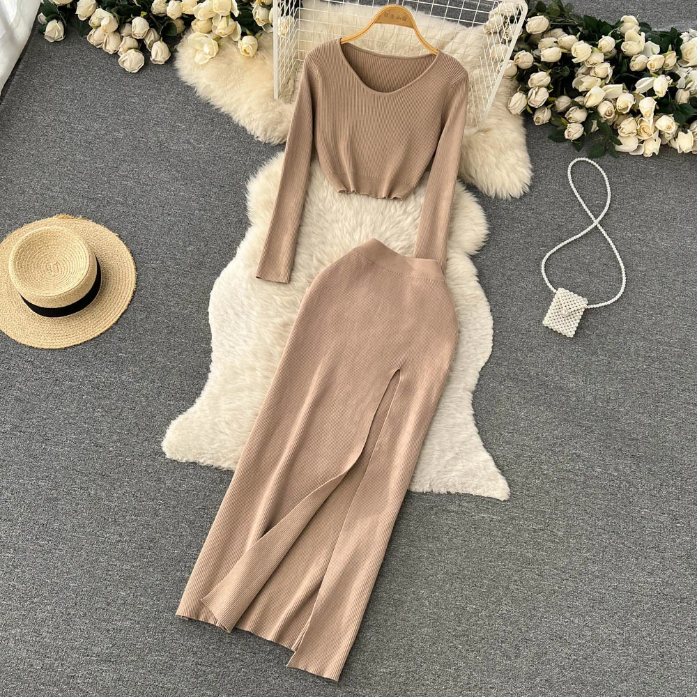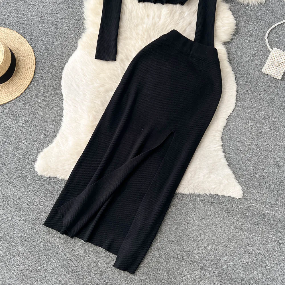 SINGREINY 2024 Autumn Skinny Knitted Sets Short Tops+Slim Long Split Skirt Women Korean Style Sweater Fashion Two Pieces Suits