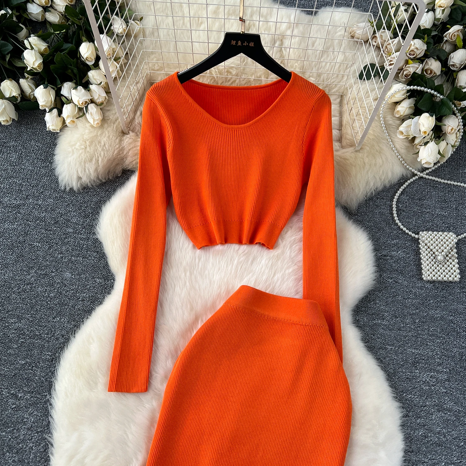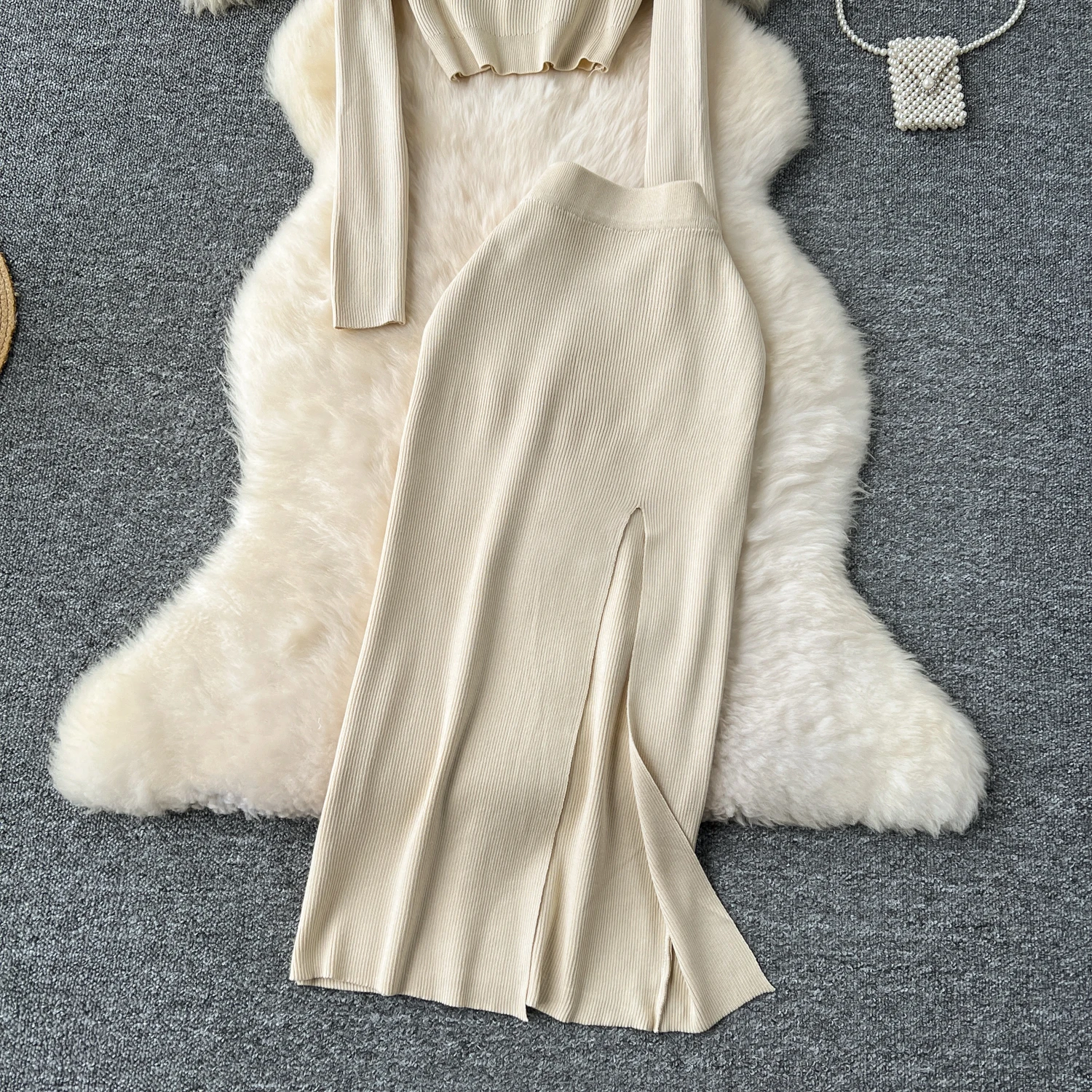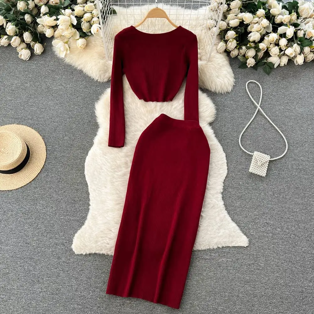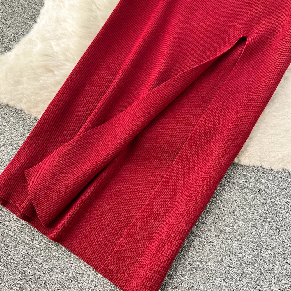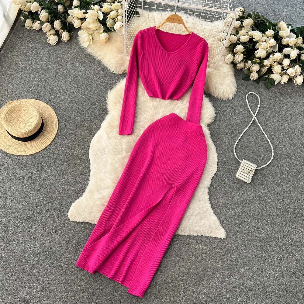 SINGREINY 2024 Autumn Skinny Knitted Sets Short Tops+Slim Long Split Skirt Women Korean Style Sweater Fashion Two Pieces Suits