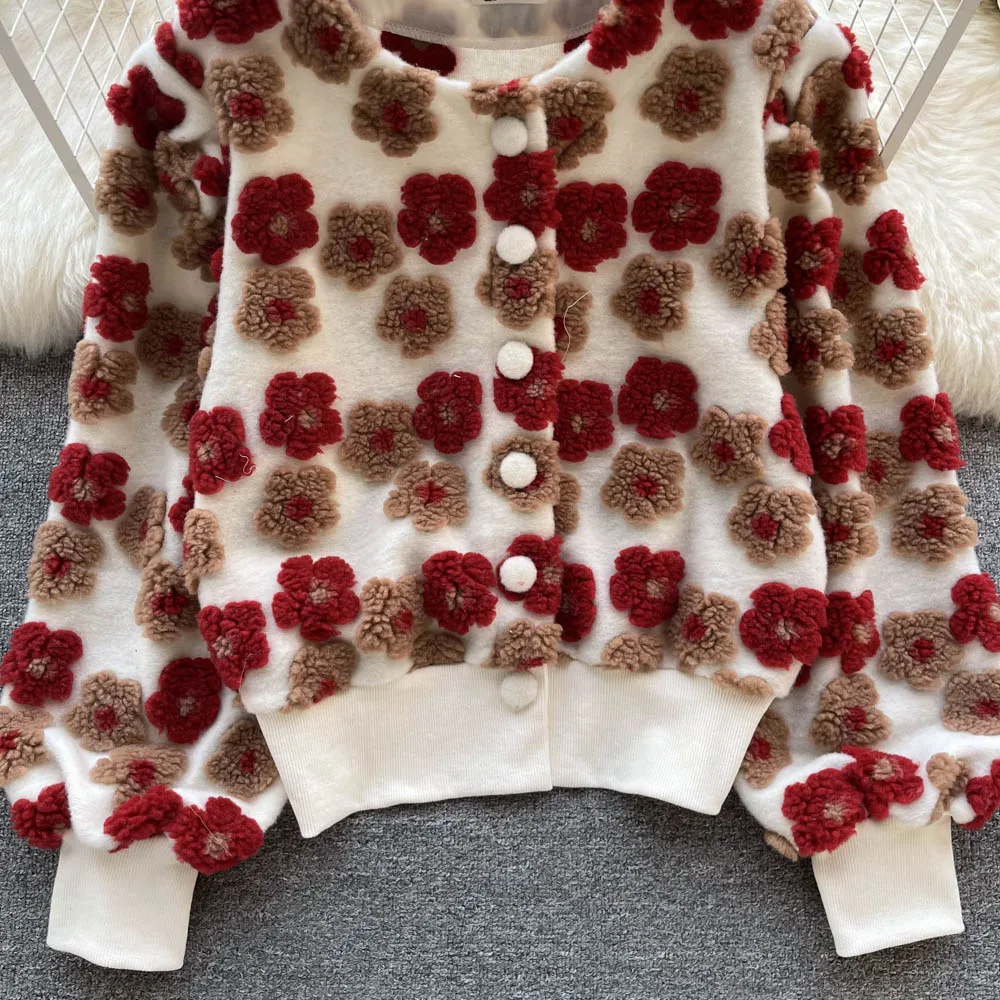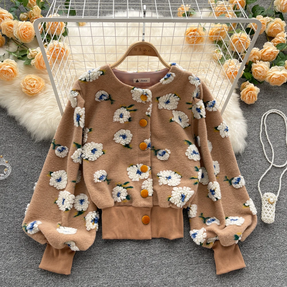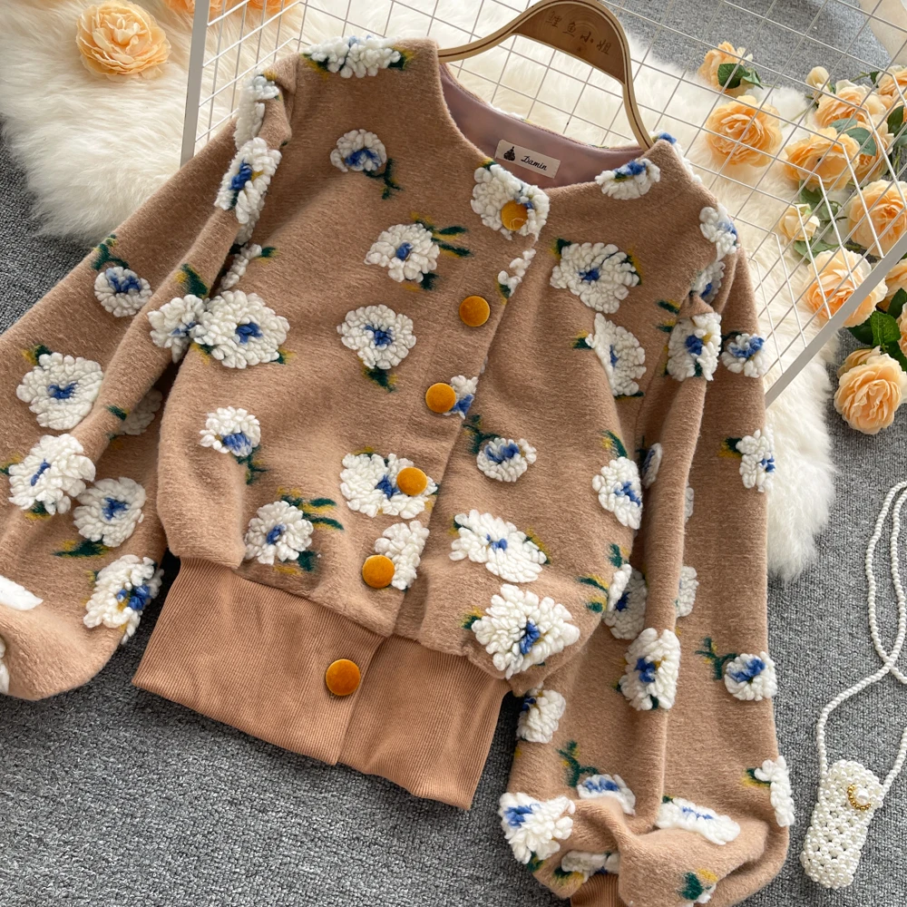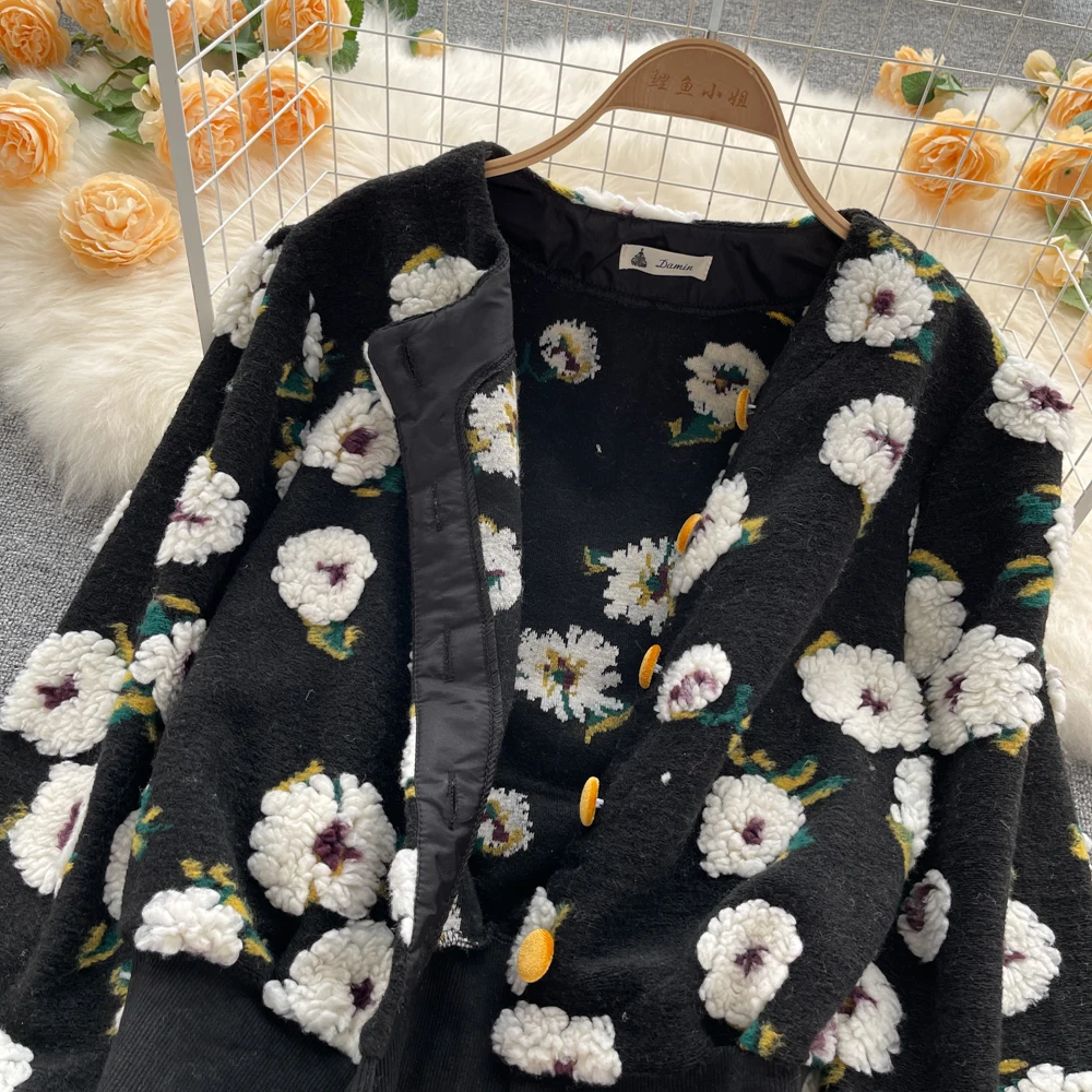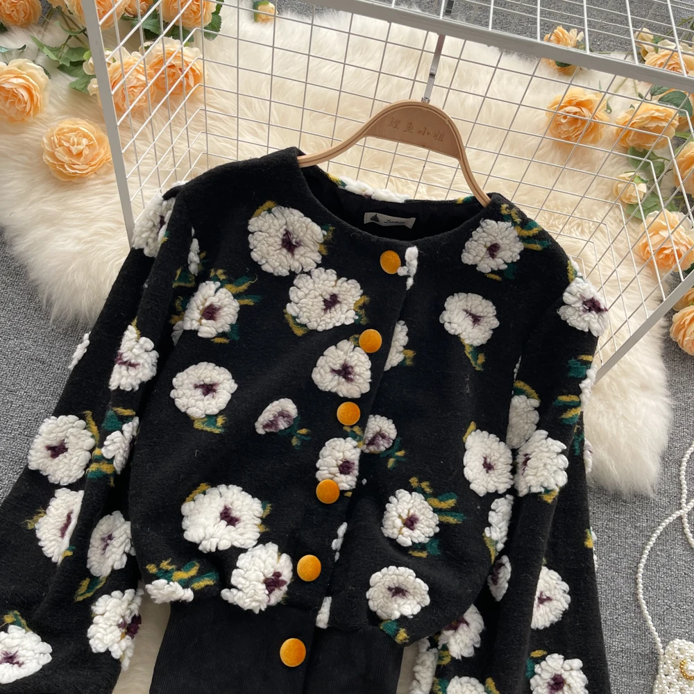 SINGREINY 3D Flower Vintage Cardigan Women Autumn Winter Single Breasted French Style Temperament Fashion Slim Chic Short Coat