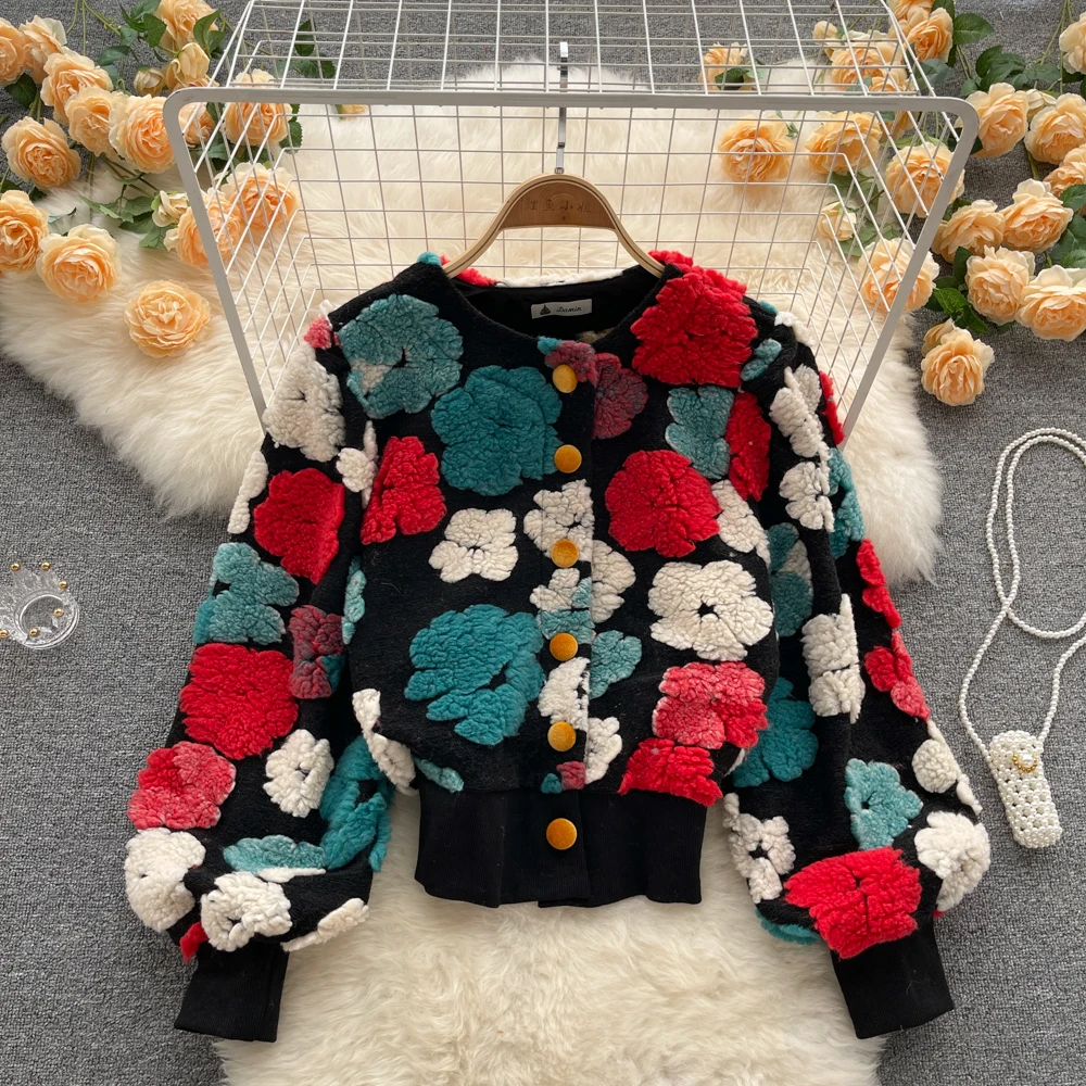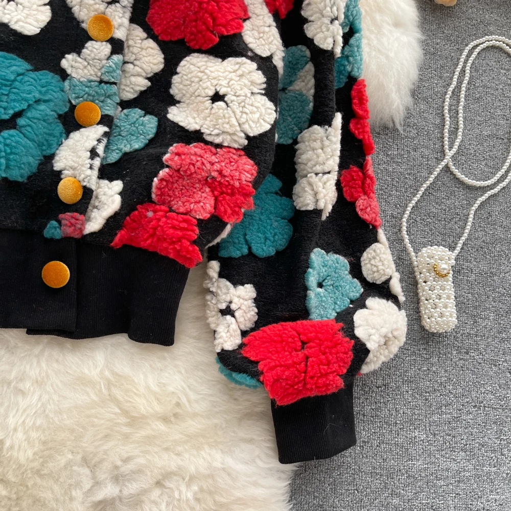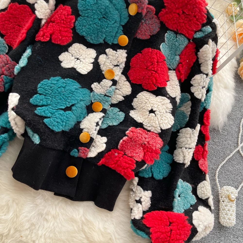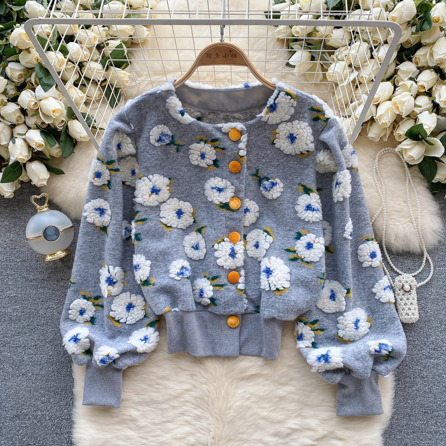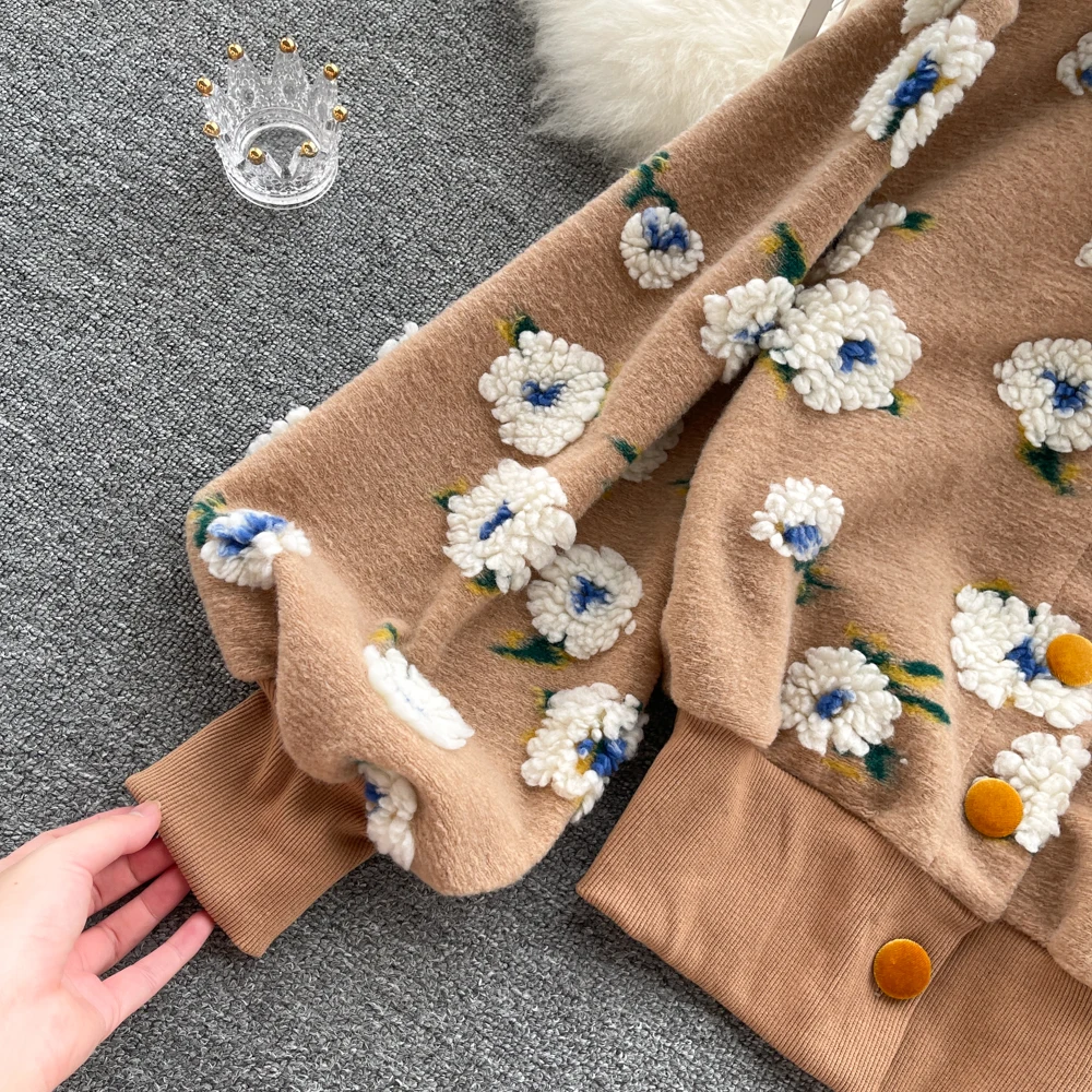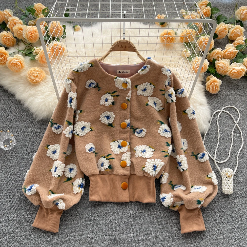 SINGREINY 3D Flower Vintage Cardigan Women Autumn Winter Single Breasted French Style Temperament Fashion Slim Chic Short Coat