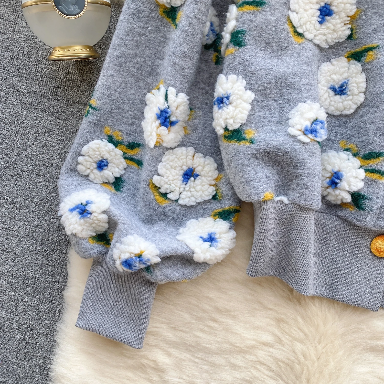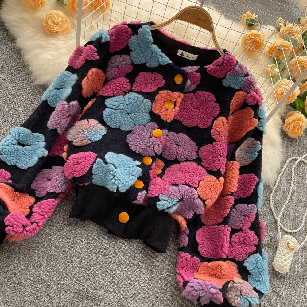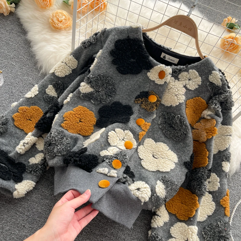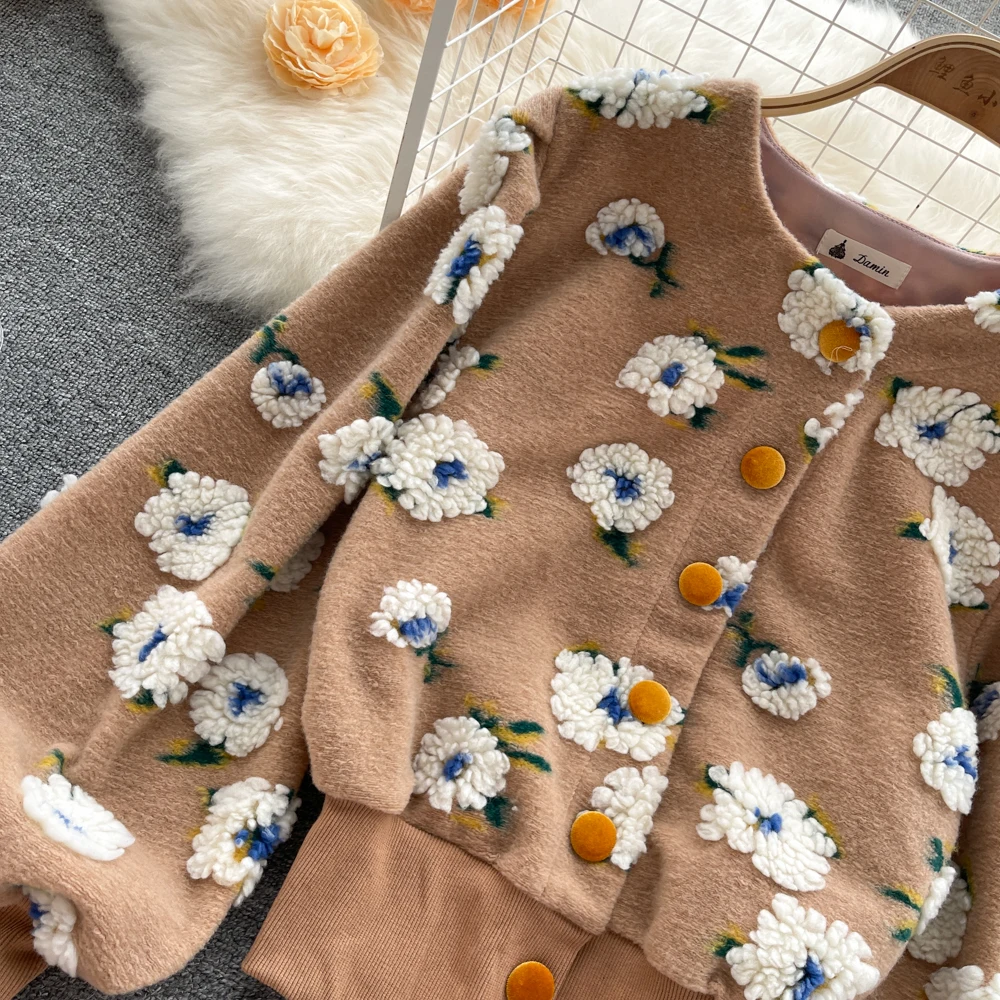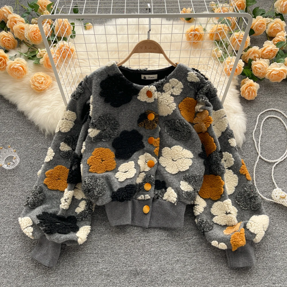 SINGREINY 3D Flower Vintage Cardigan Women Autumn Winter Single Breasted French Style Temperament Fashion Slim Chic Short Coat