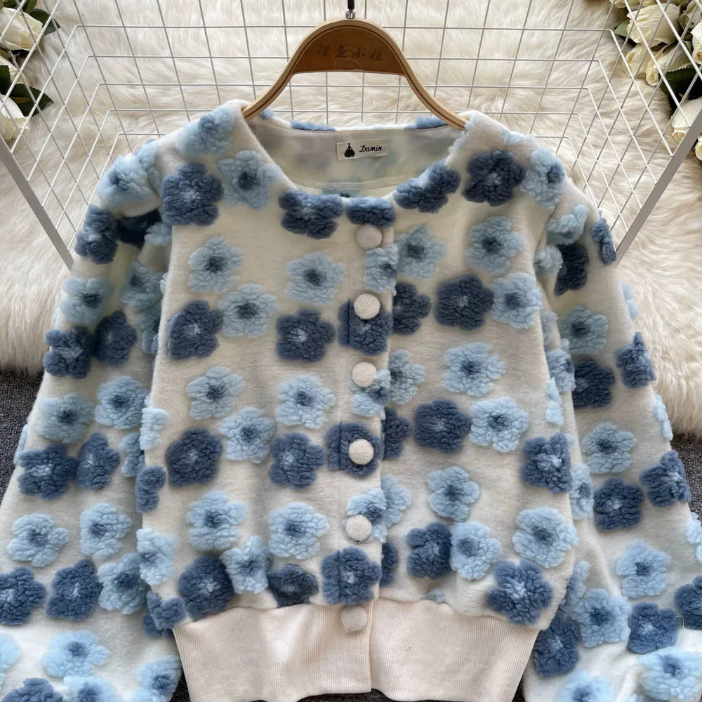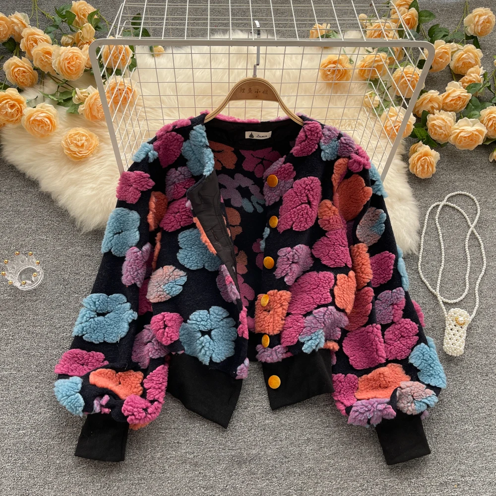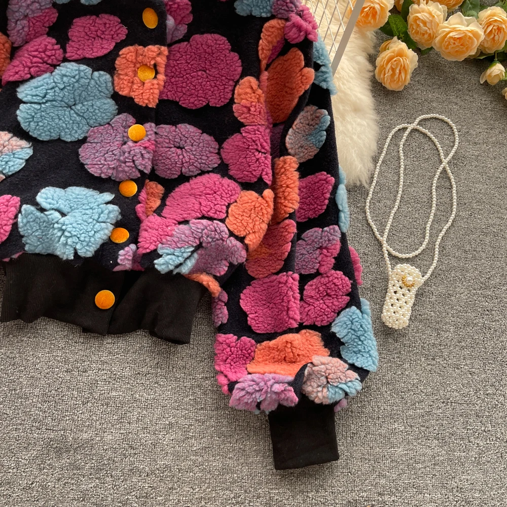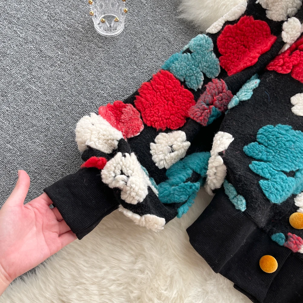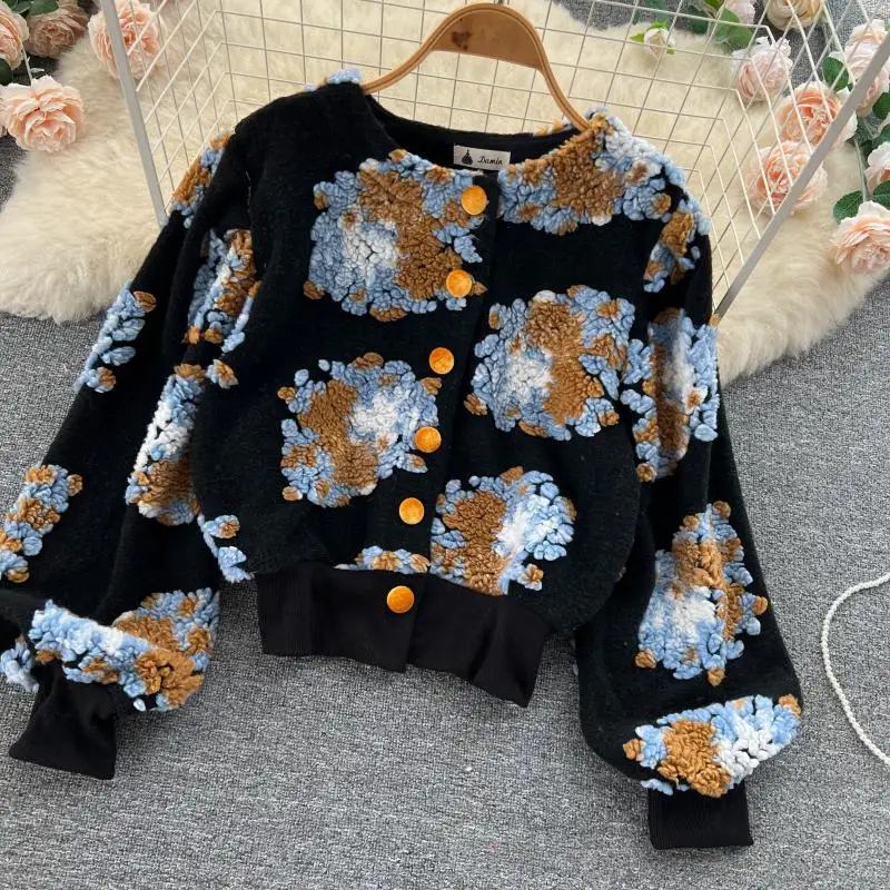 SINGREINY 3D Flower Vintage Cardigan Women Autumn Winter Single Breasted French Style Temperament Fashion Slim Chic Short Coat