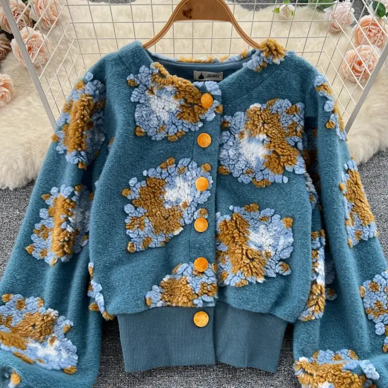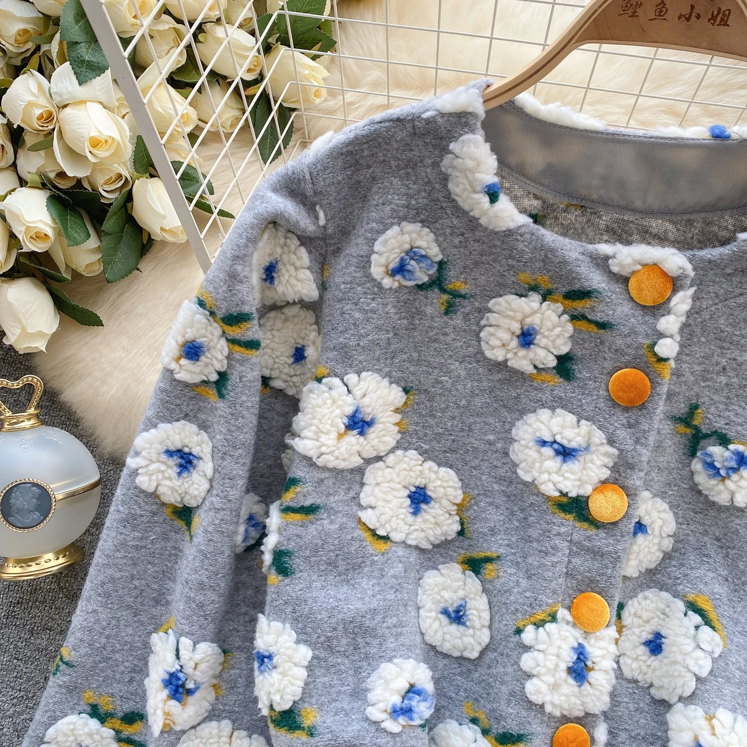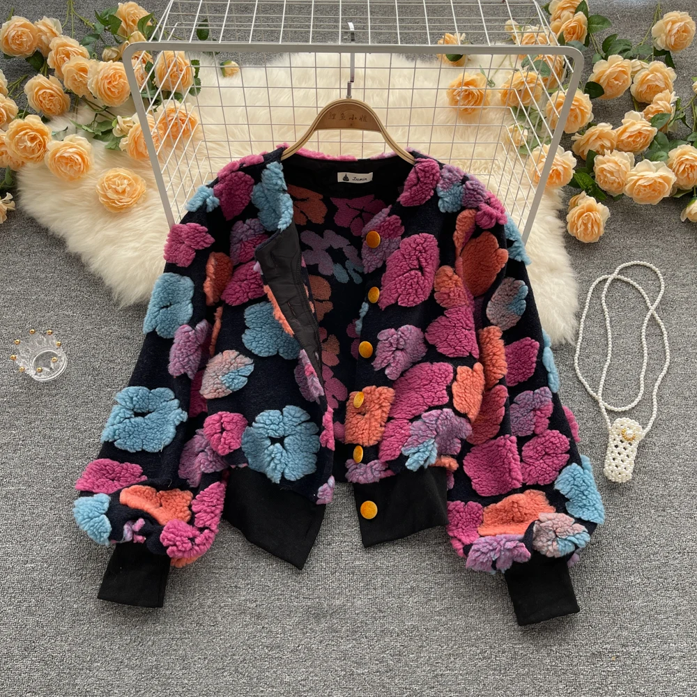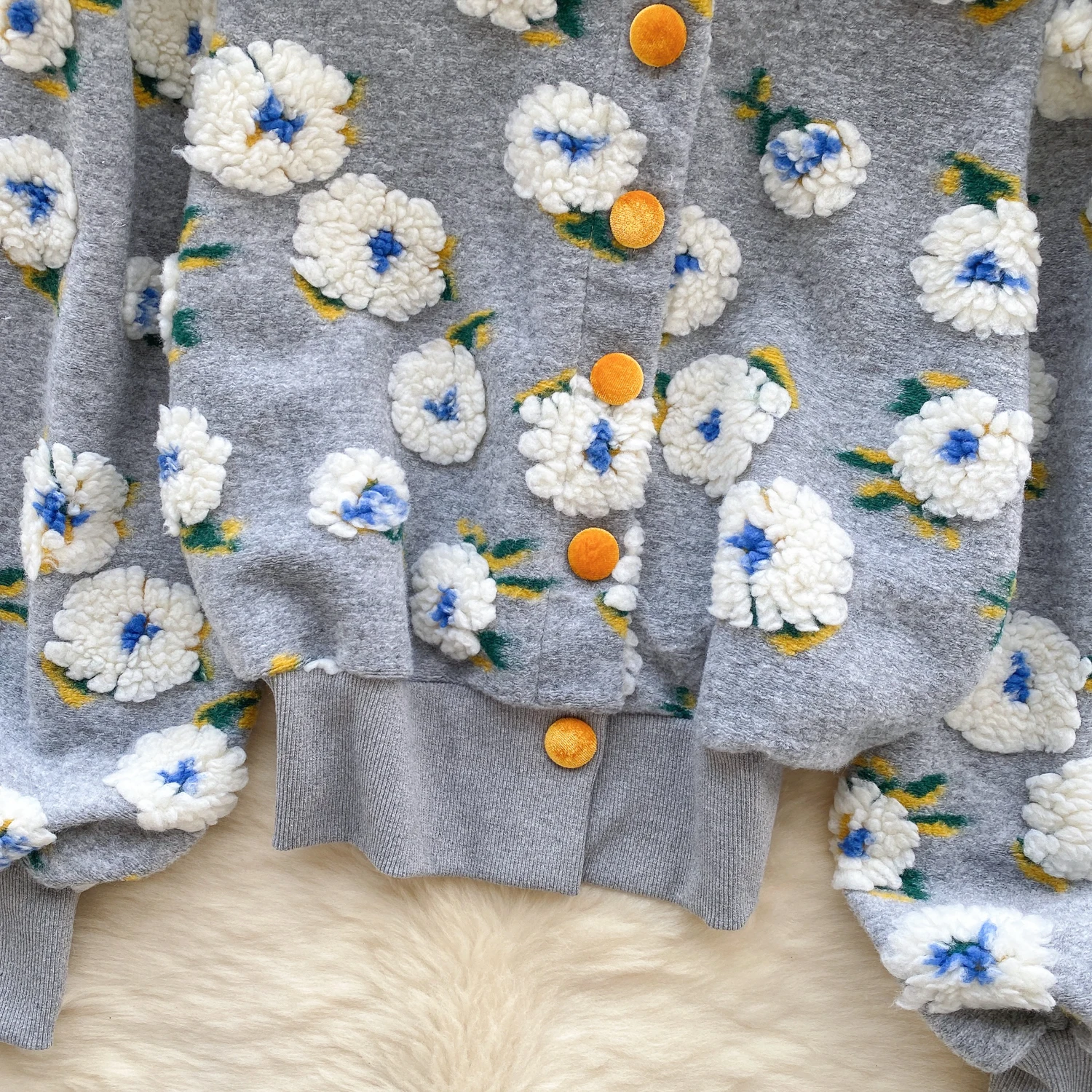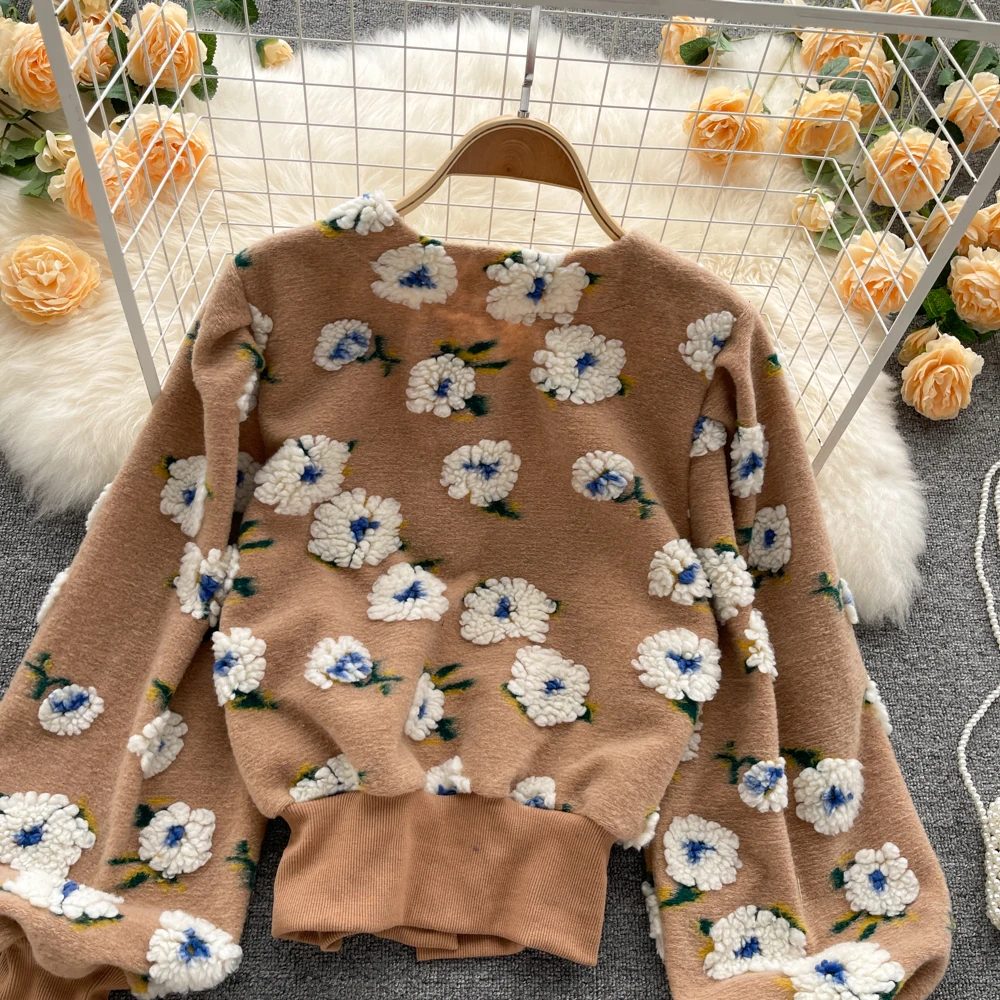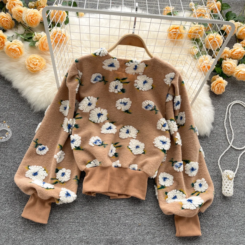 SINGREINY 3D Flower Vintage Cardigan Women Autumn Winter Single Breasted French Style Temperament Fashion Slim Chic Short Coat