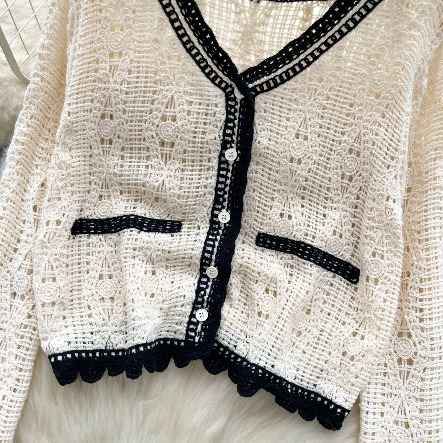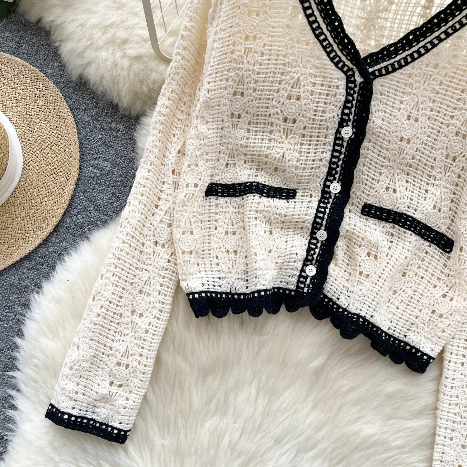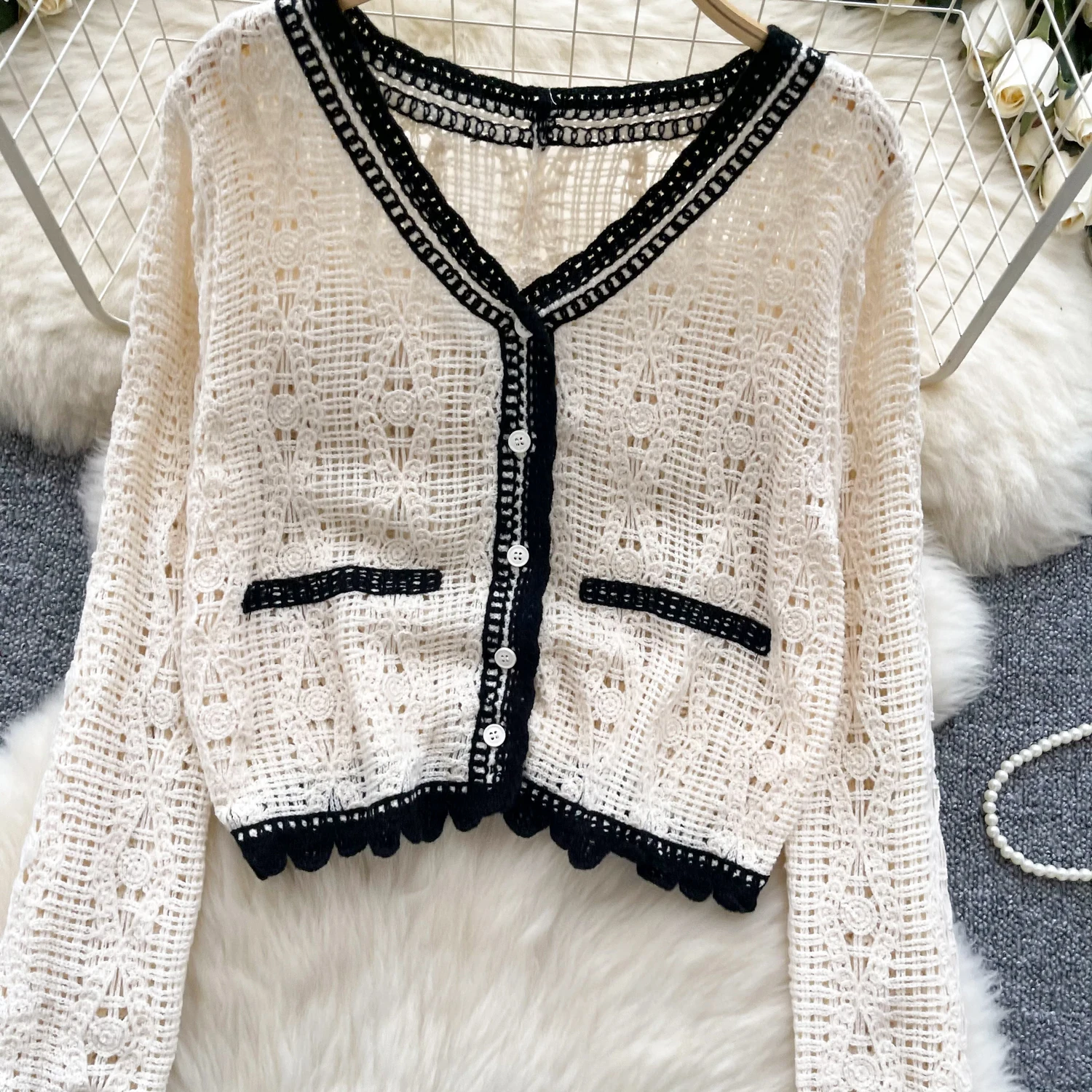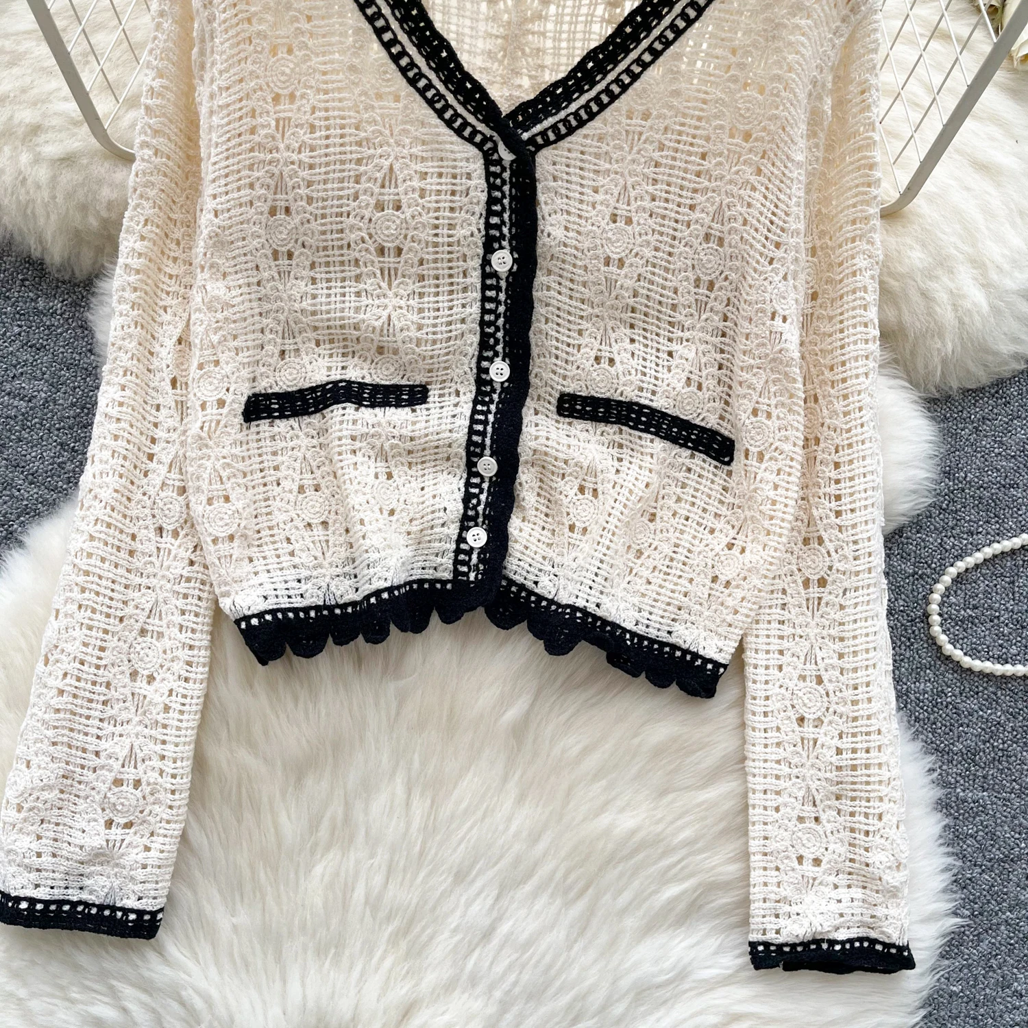 SINGREINY Autumn Color Block Knitting Cardigan Women V Neck Long Sleeve Single Breasted Design Hook Flower Hollow Basics Coat