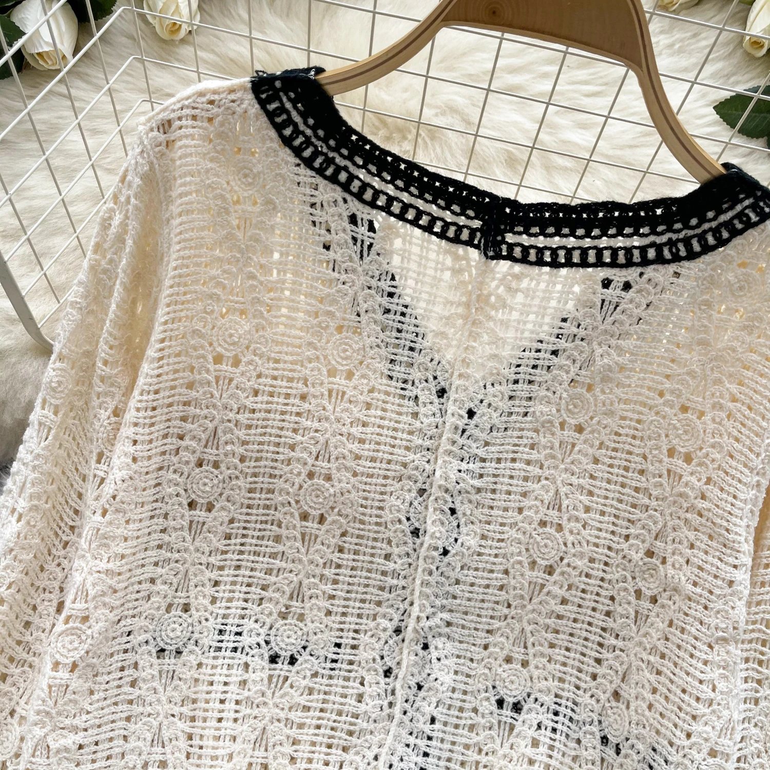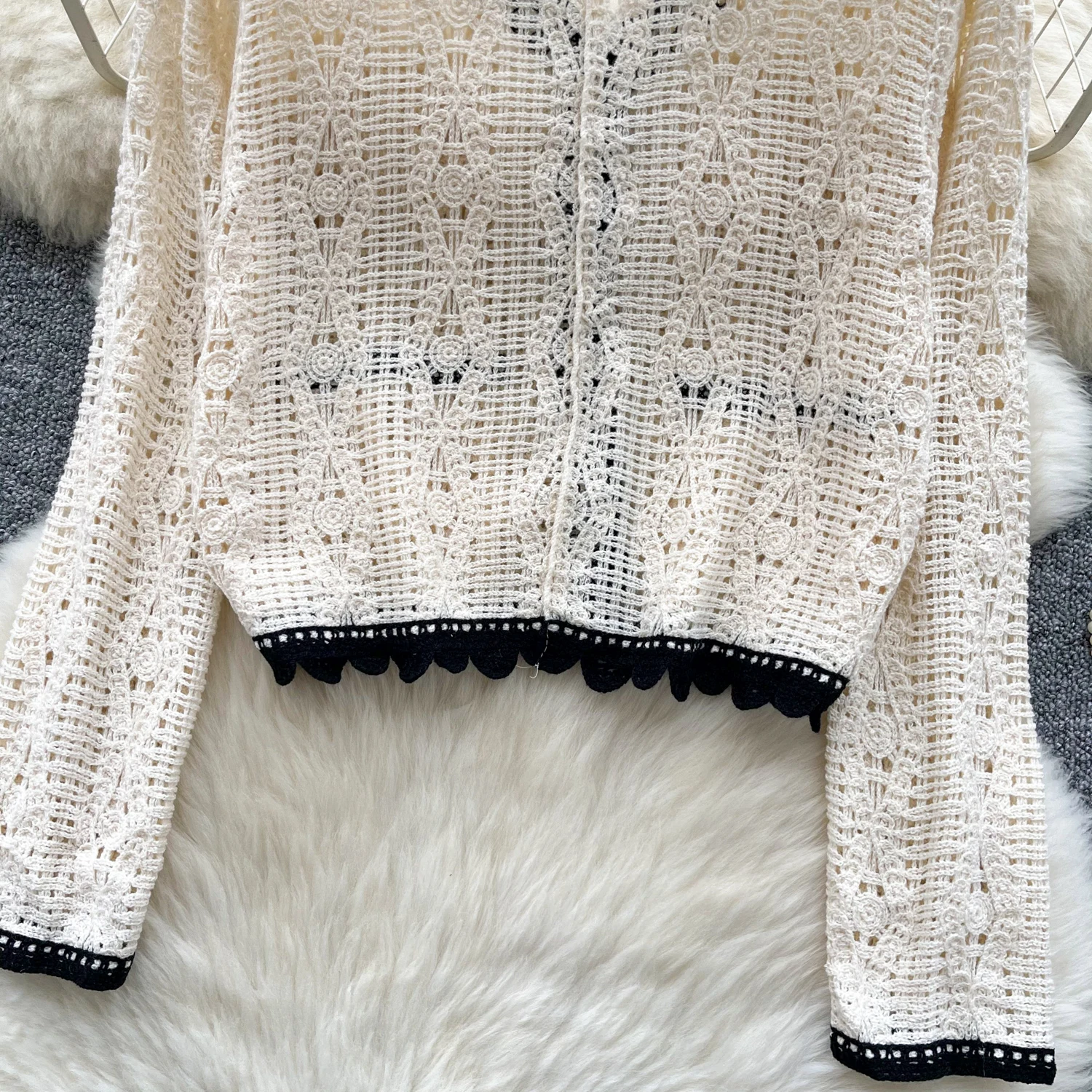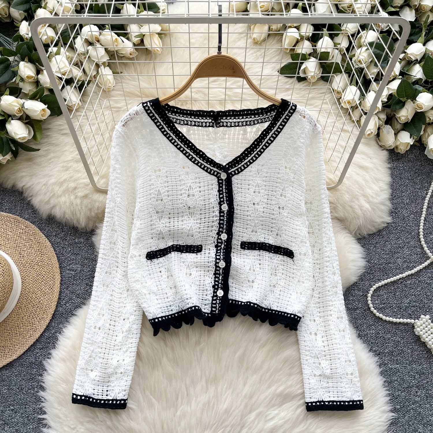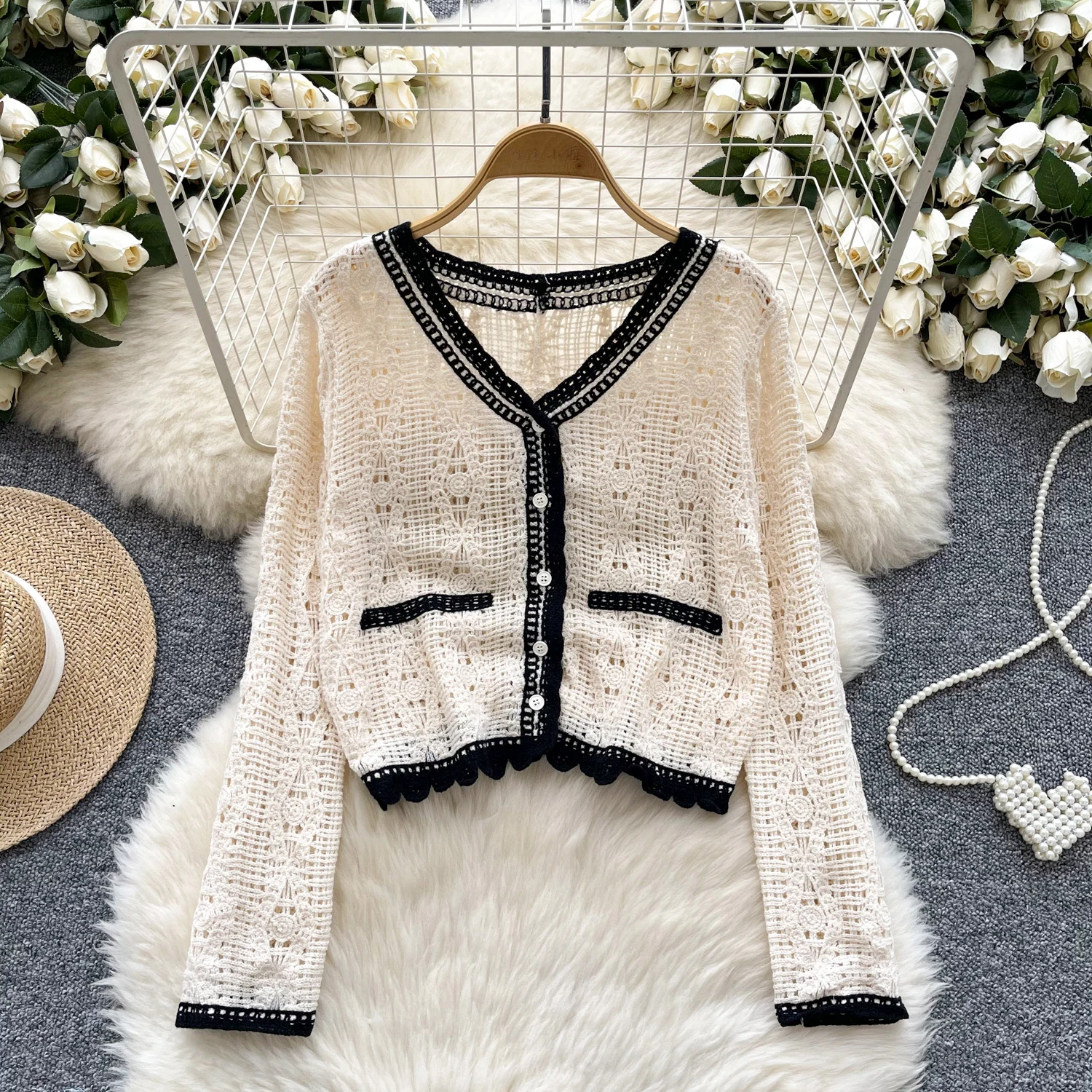 SINGREINY Autumn Color Block Knitting Cardigan Women V Neck Long Sleeve Single Breasted Design Hook Flower Hollow Basics Coat