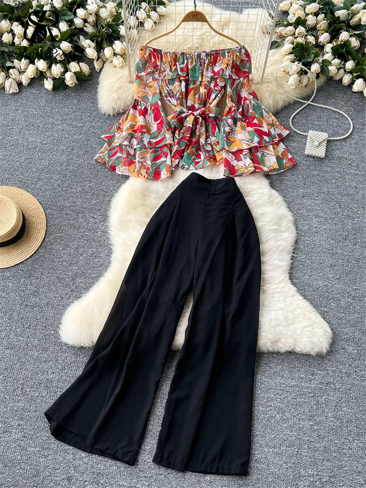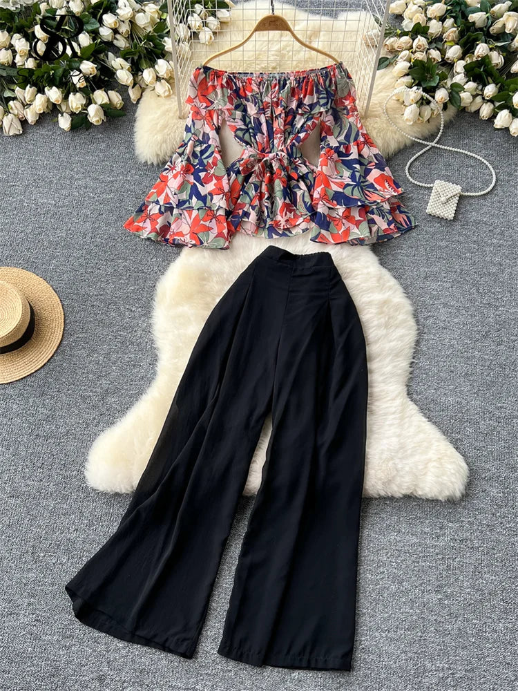 SINGREINY Design Fashion Print Suits Slash Neck Flared Sleeve Chiffon Tops+Zipper Wide Legs Long Pants Casual Two Pieces Sets