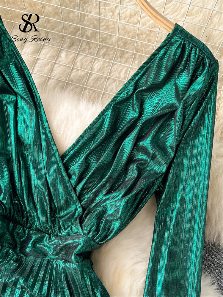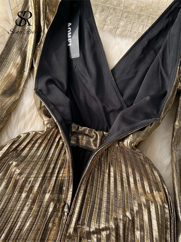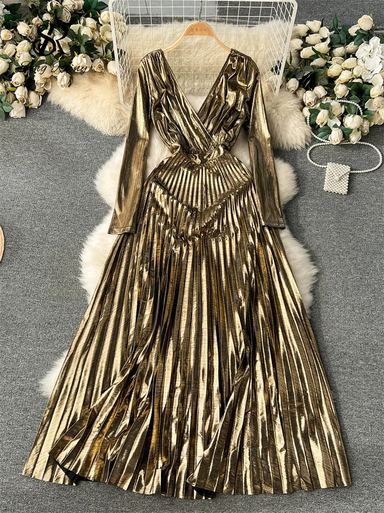 SINGREINY High Quality Spring Party Long Dress V Neck Long Sleeves Zipper Design A Line Pleated Chic Shiny Backless Dress
