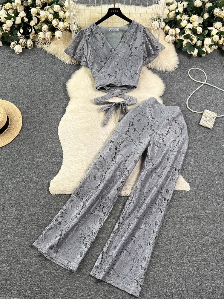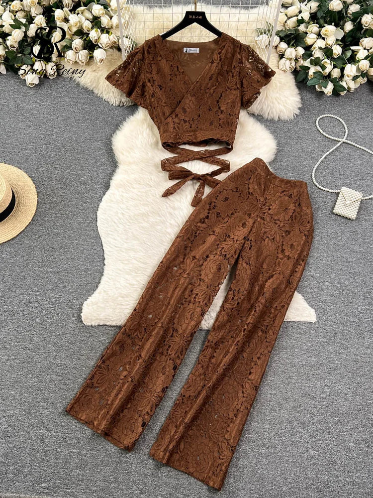 SINGREINY High Street Women Lace Slim Two Pieces Suits Summer Lace Up Short Top+Wide Legs Long Pants Set Retro Lace Floral Sets