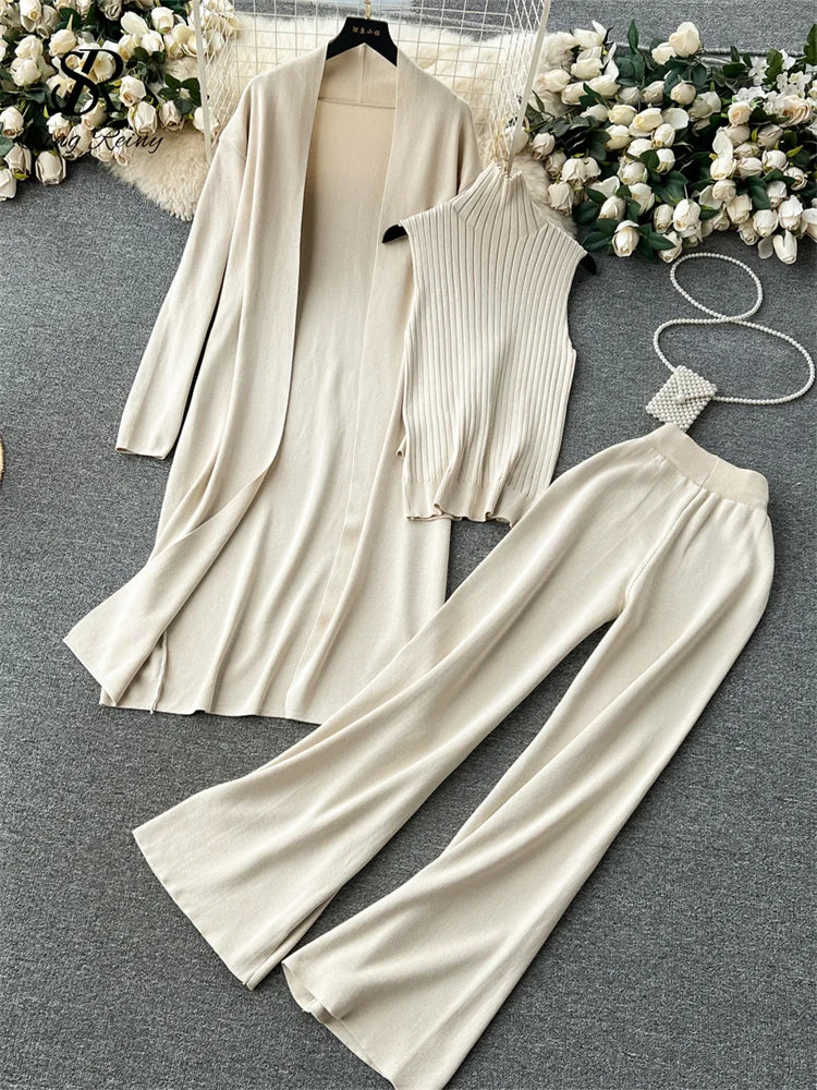 SINGREINY Winter Casual Knitted Three Pieces Suits Women Long Sleeve Cardigans+Turtleneck Knit Tank Top+Warm Long Pant Sets