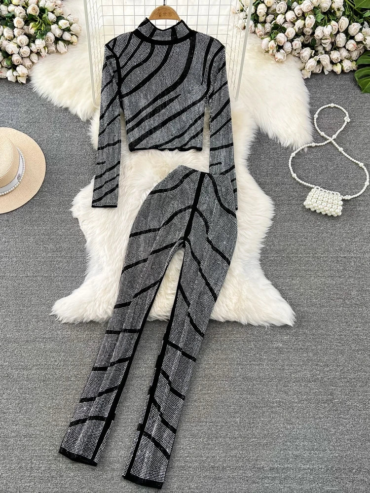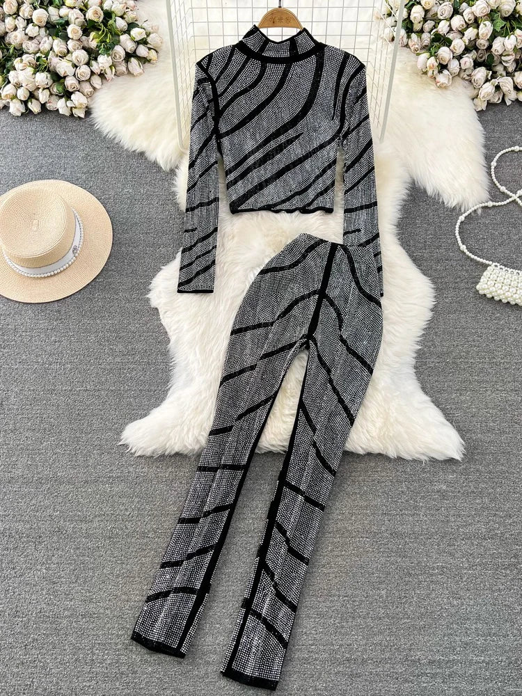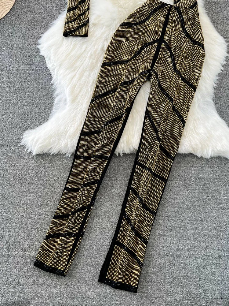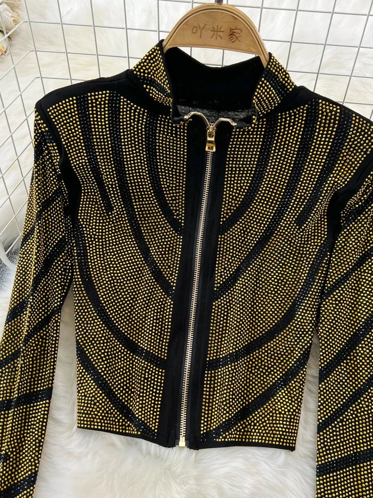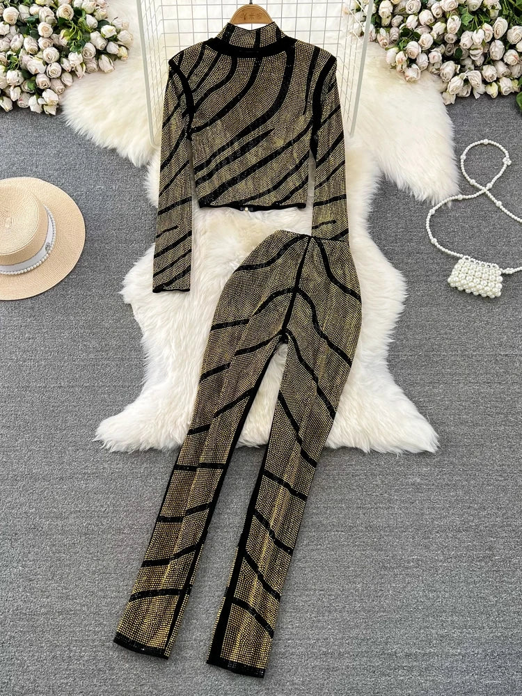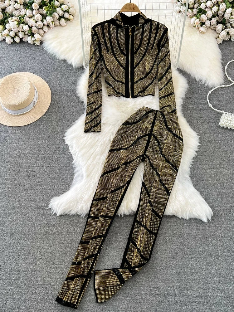 Spring Autumn Women Diamonds Striped Two Piece Set Gold/Silver/Black Stand Collar Long Sleeve Short Tops + Pants Suit 2Pcs New