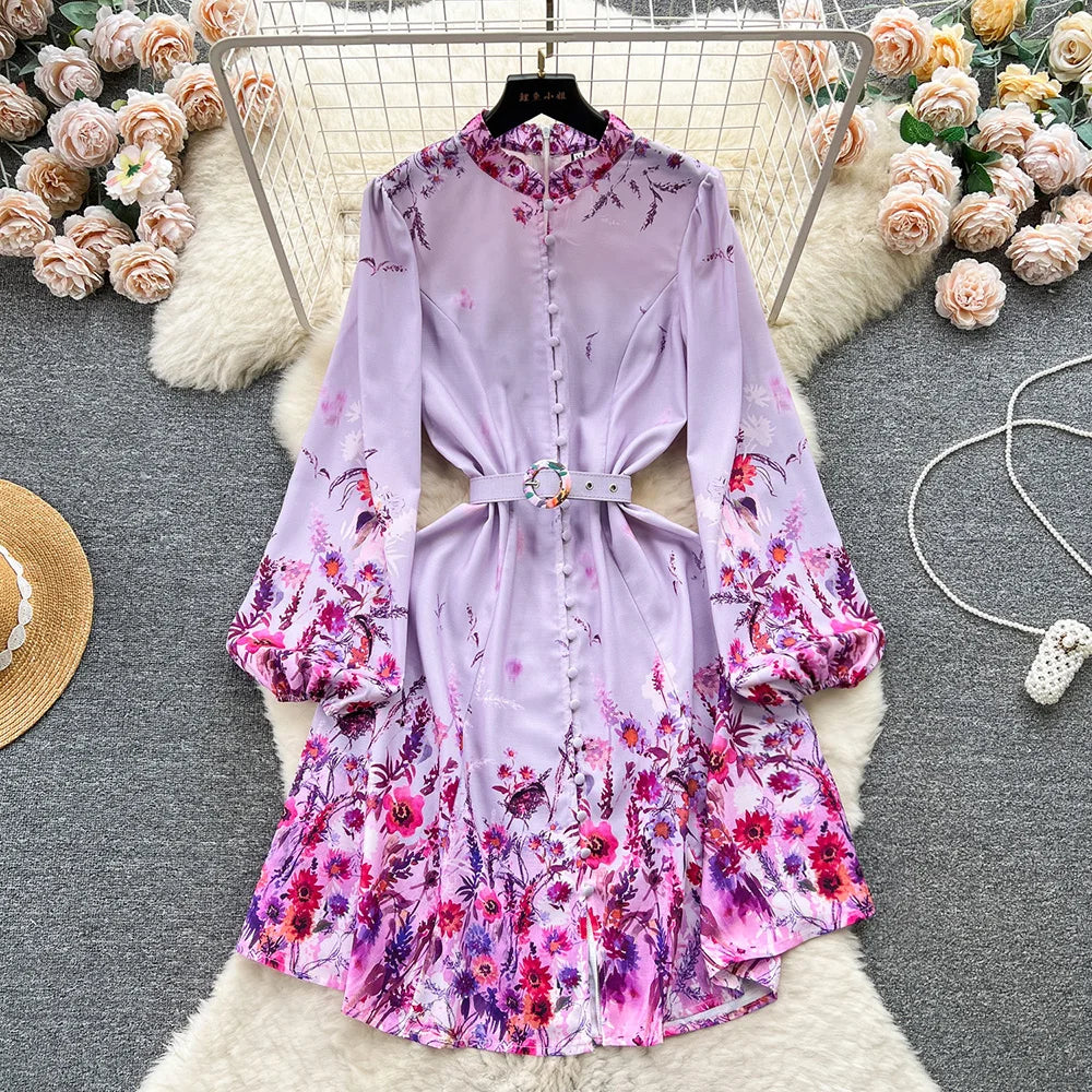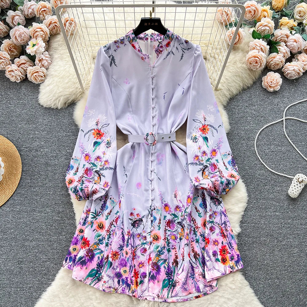 Spring Dresses 2024 Women Clothing Long Sleeve Party Elegant Dress With Belt Stand Collar Vintage Floral Print Holiday Dress