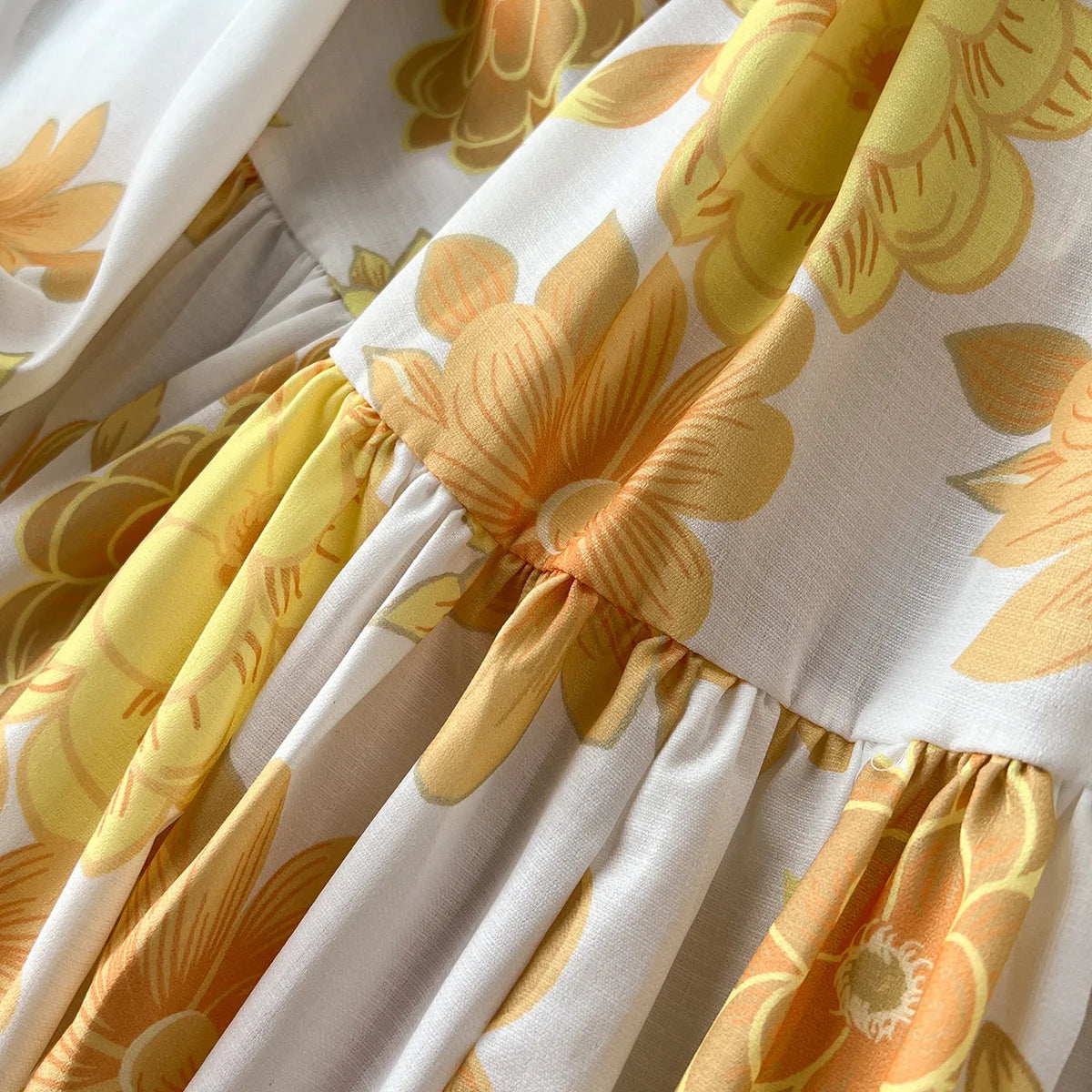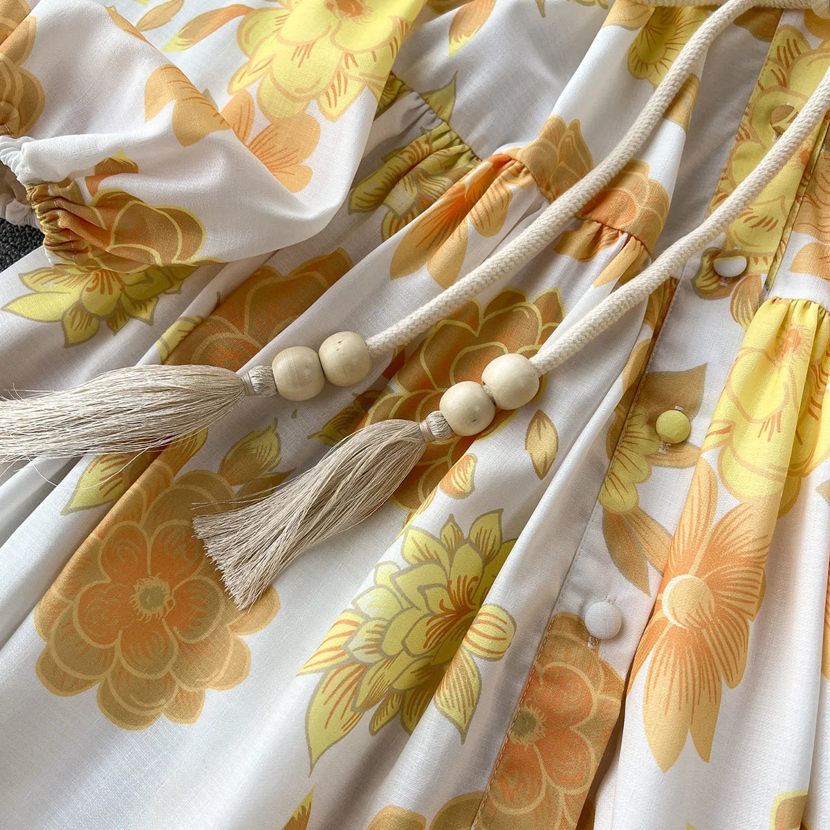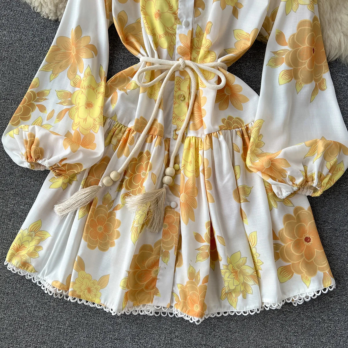 Spring Summer Holiday Dresses For Women 2023 Elegant Vintage Flower Print Dress Ruffle Trim Long Sleeve Mini Dress With Belt