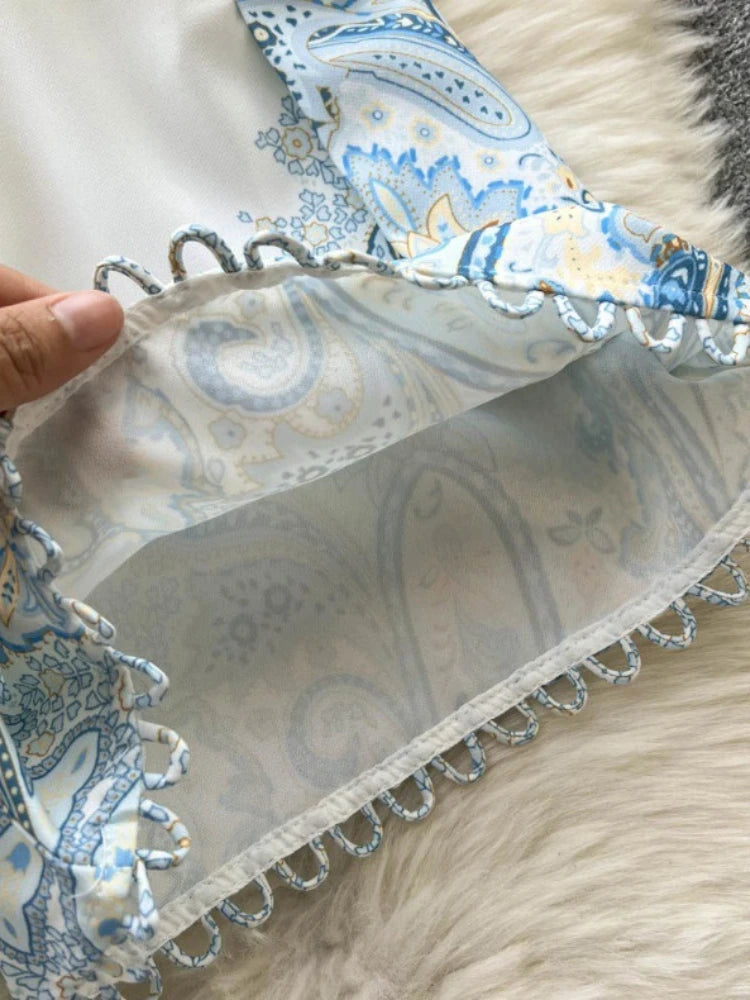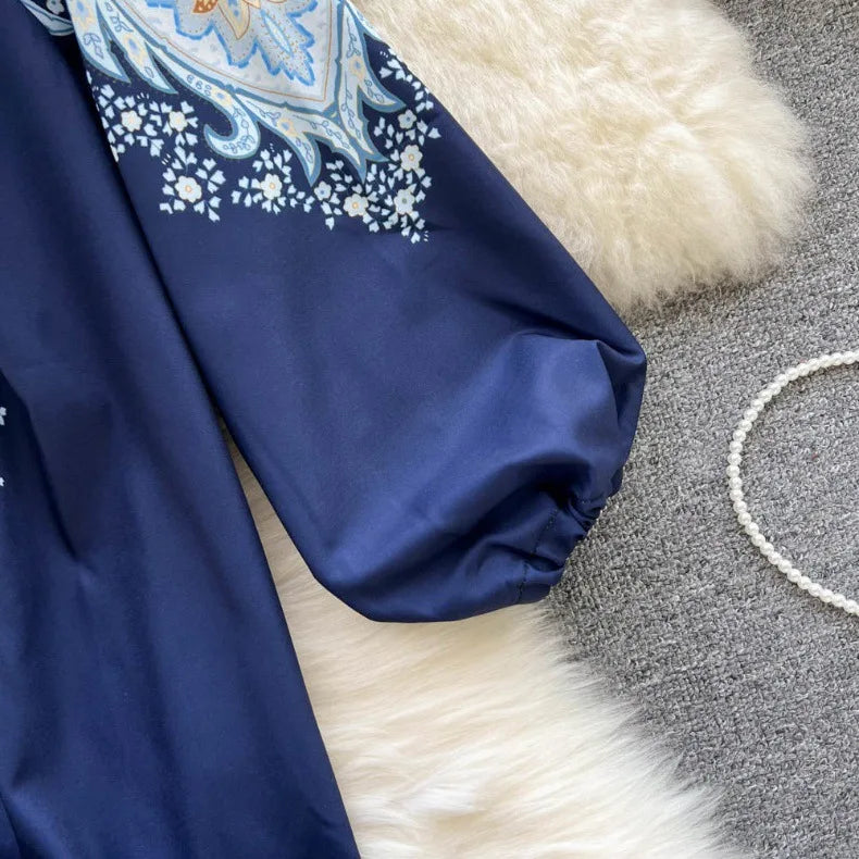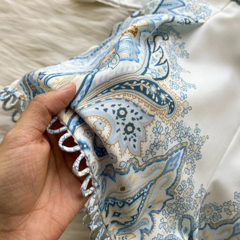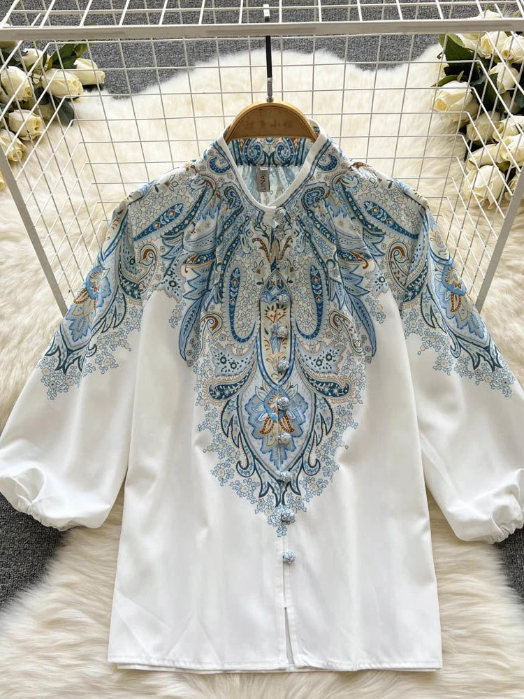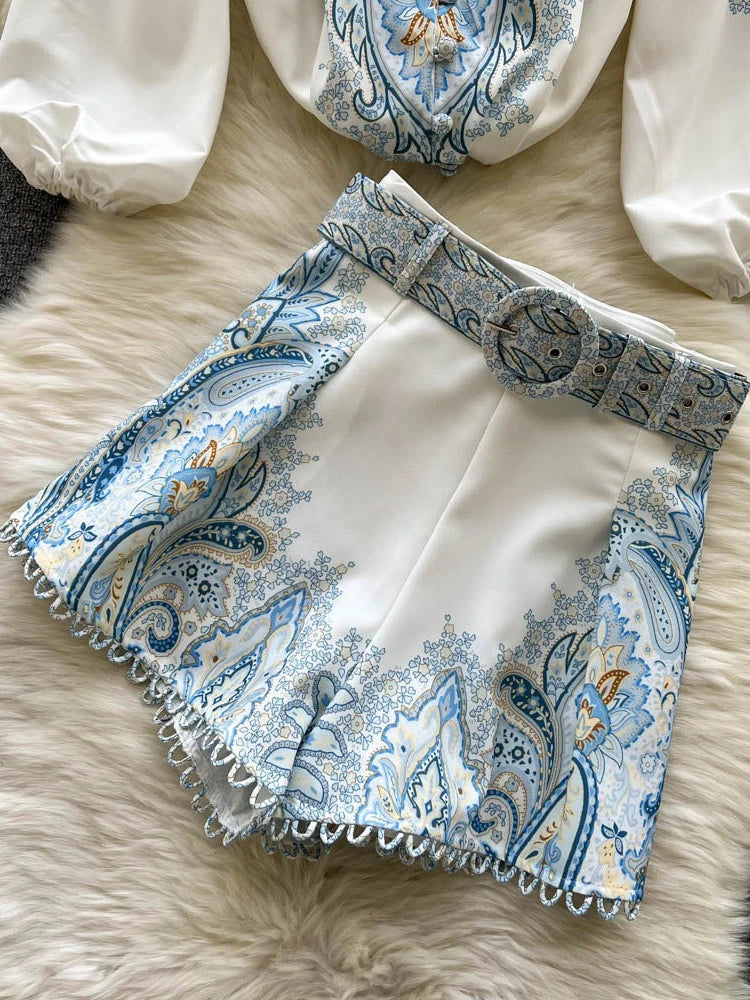 Spring Summer Retro Print Two Piece Set Women Lantern Sleeves Standing Neck Blouse Top+High Waist Wide Leg Shorts Elegant Suits