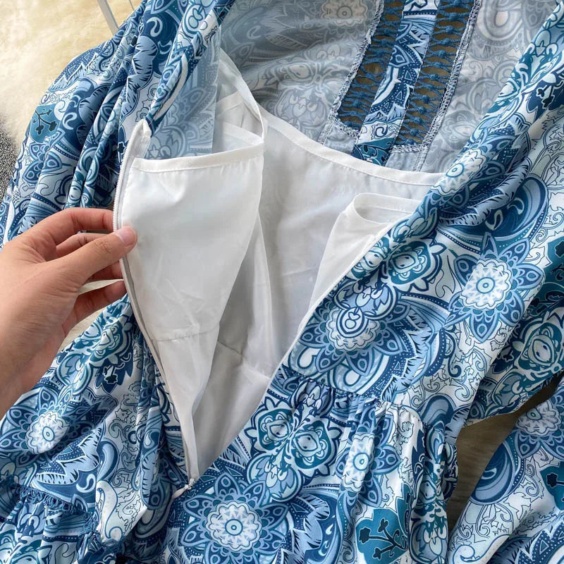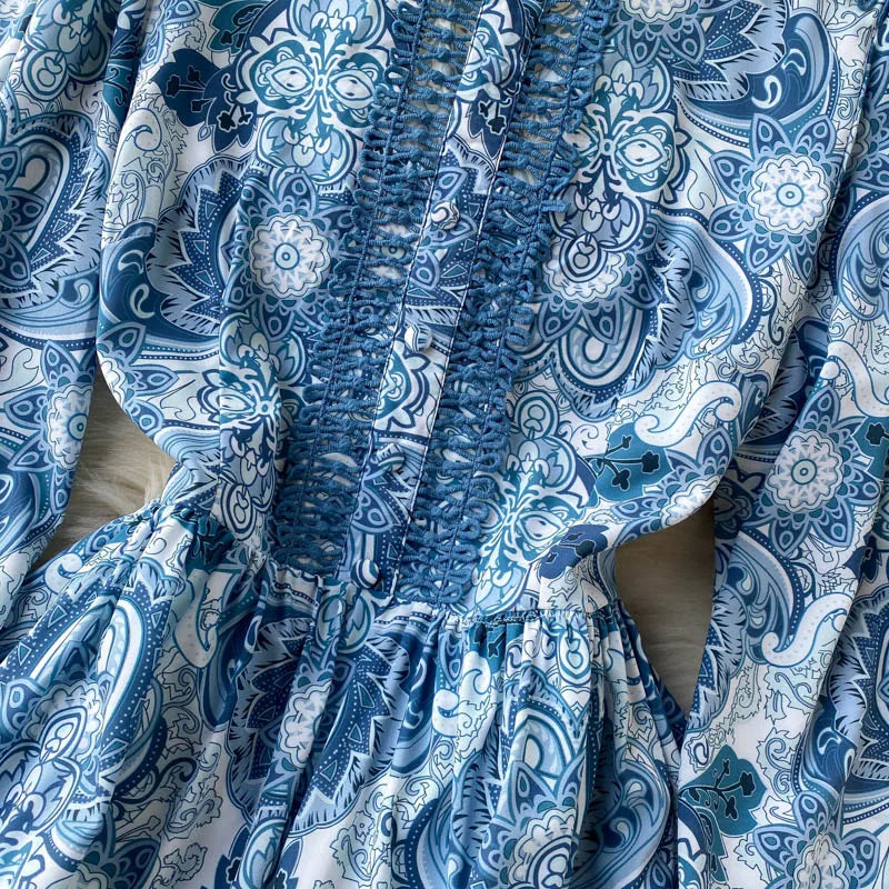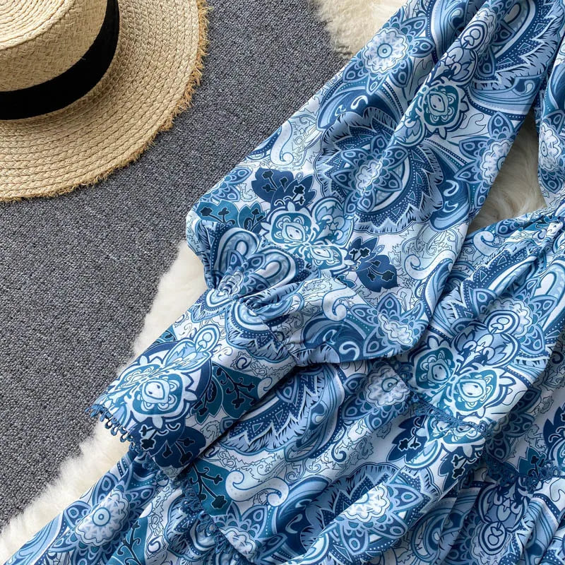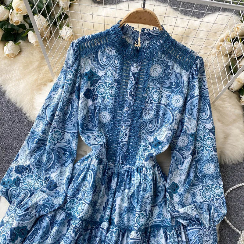Spring Summer Women Dresses Elegant Vintage Print Holiday Bohemian Beach Dress Stand Collar Long Sleeve Ruffle Tiered Mini Dress