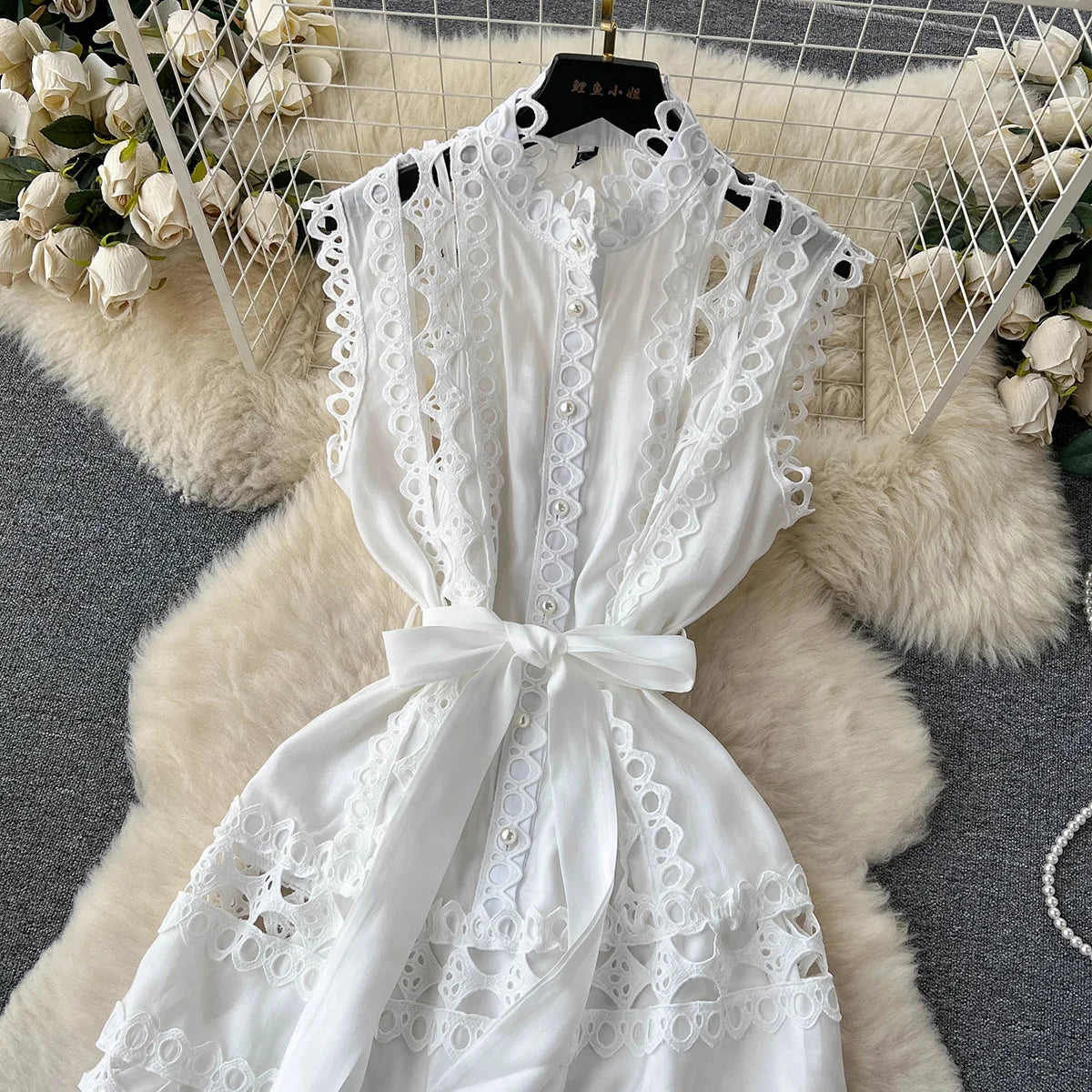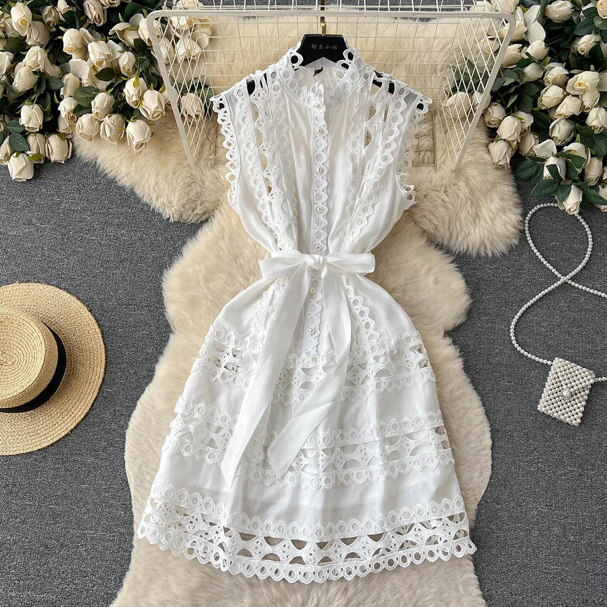 Summer Clothes Dresses For Women 2023 Elegant Vintage Embroidery Lace Dress Sleeveless Stand Neck Button Up Mini Dress With Belt
