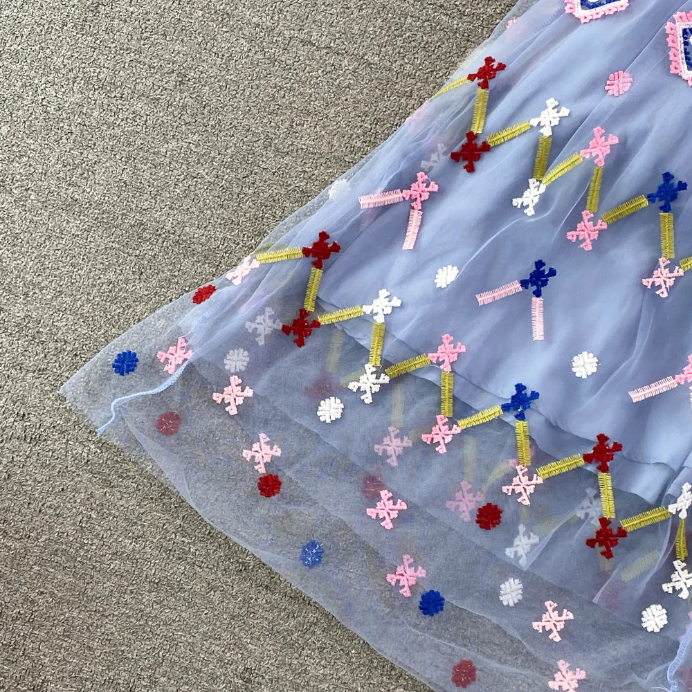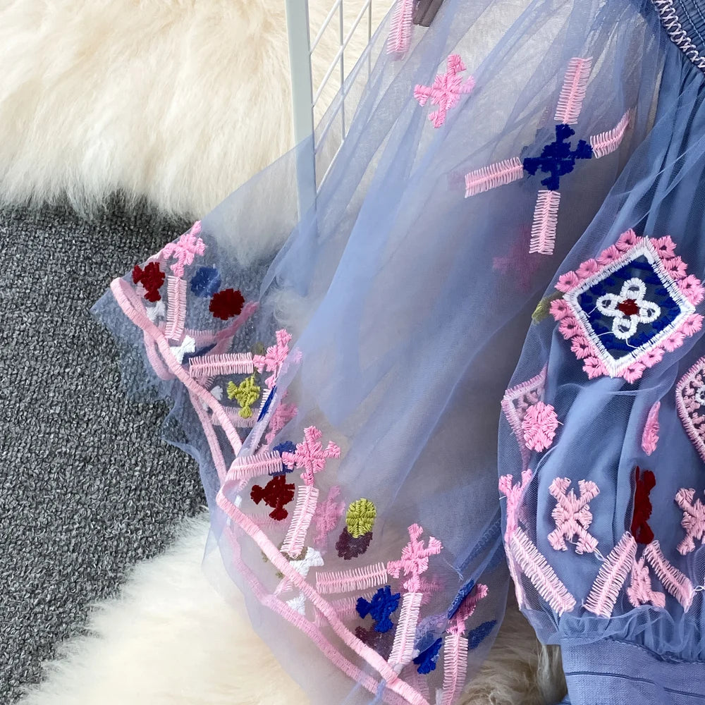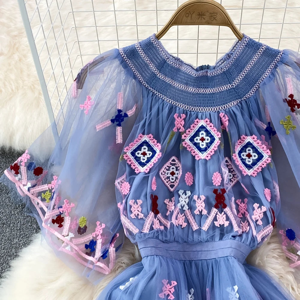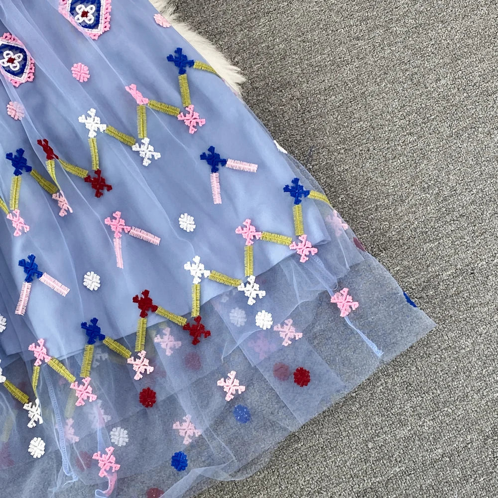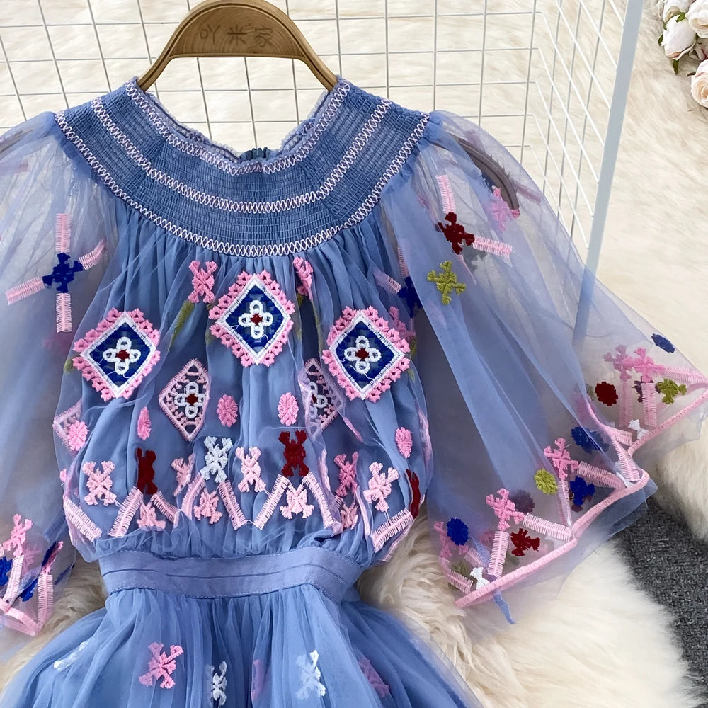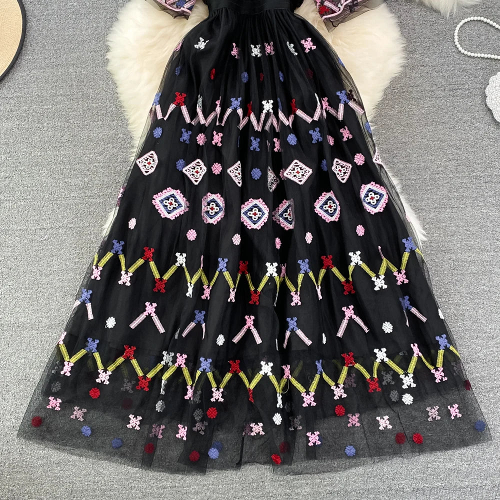 Summer Designer Fashion Runway Maxi Dress Women Short Sleeves Vintage High Quality Mesh Embroidery Long Party Dress