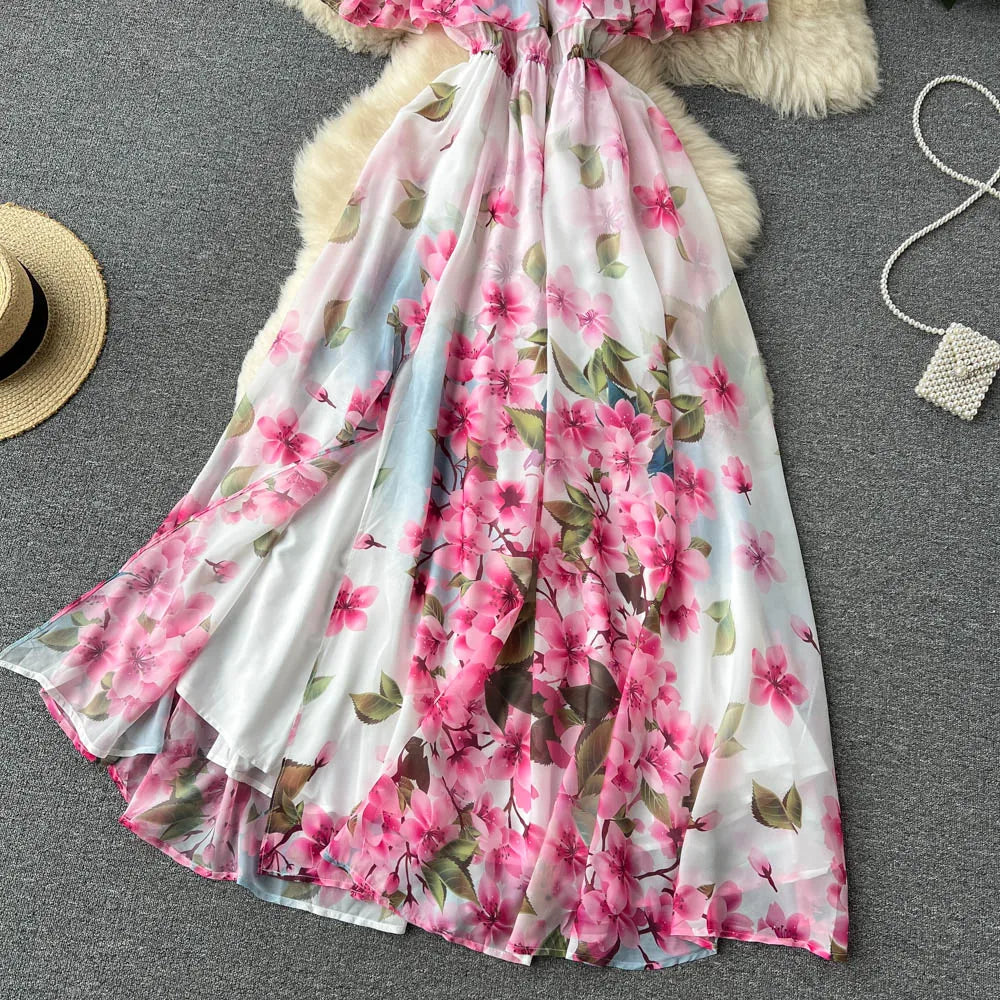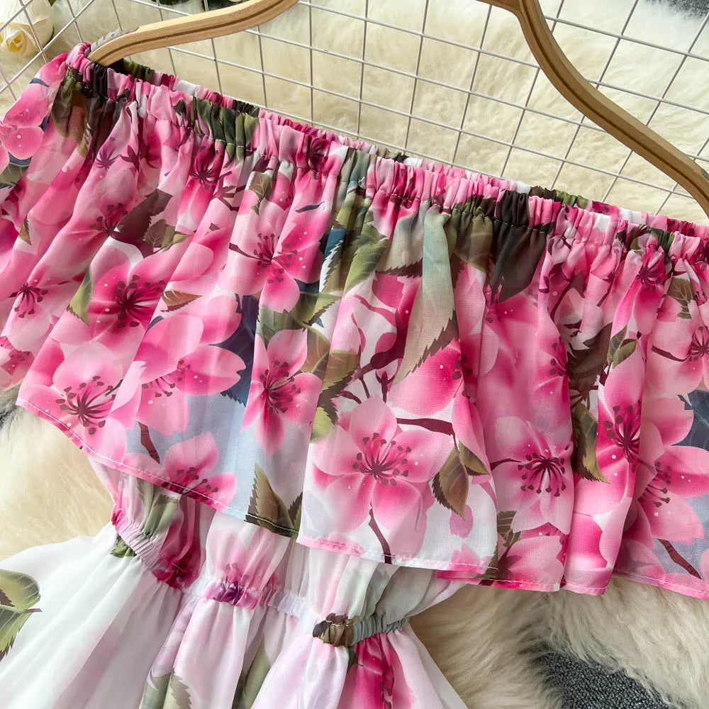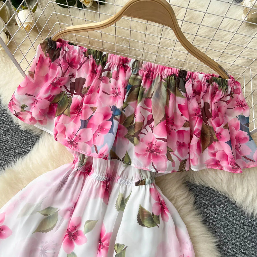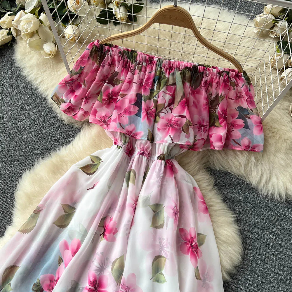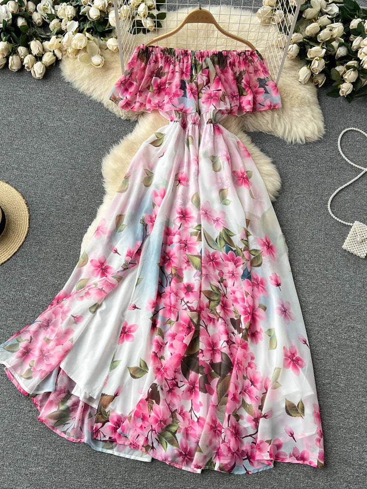 Summer Ruffle Off The Shoulder Chiffon Dress Women Sexy Slim A-line Printed Dresses Ladies Viantage Beach Split Maxi Dress