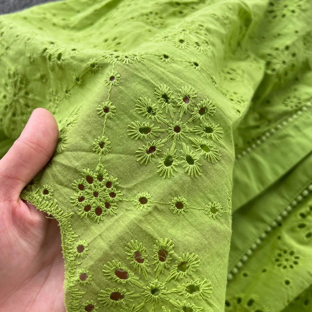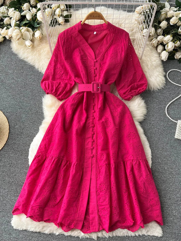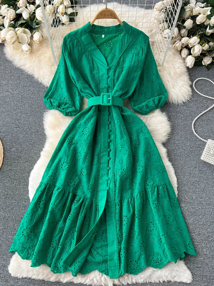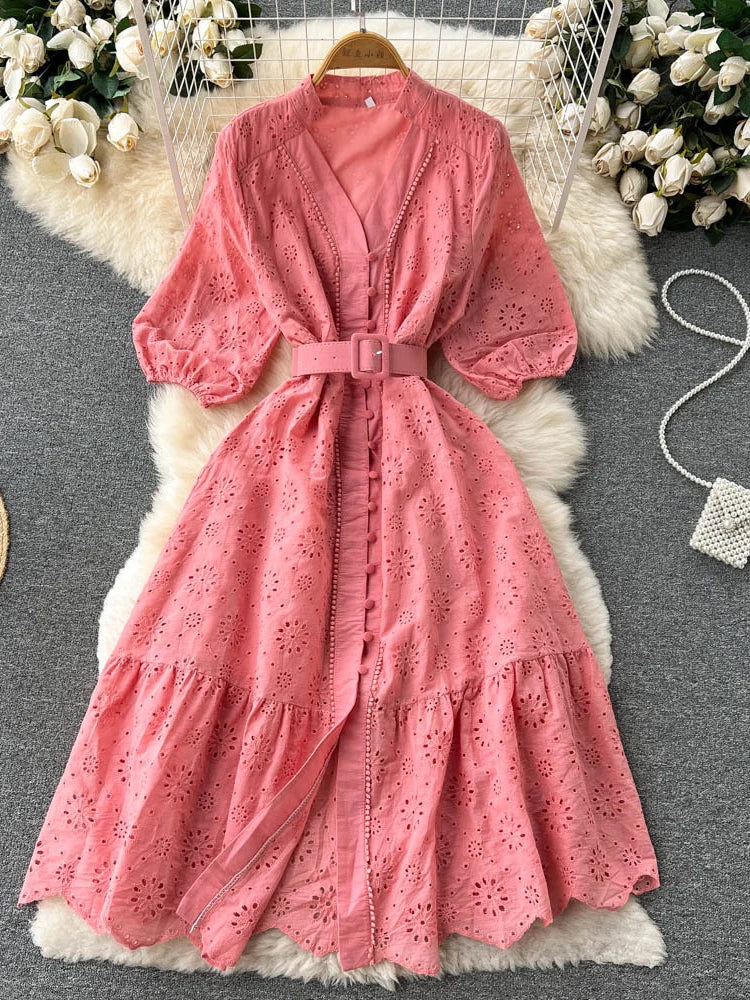 Summer V-neck Hollow Out Dress Women Bubble Sleeves Loose Embroidered Ruffle Edge Long Dresses Ladies Elegant Casual Long Robe