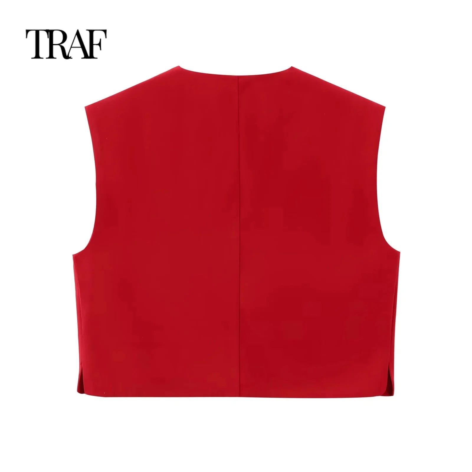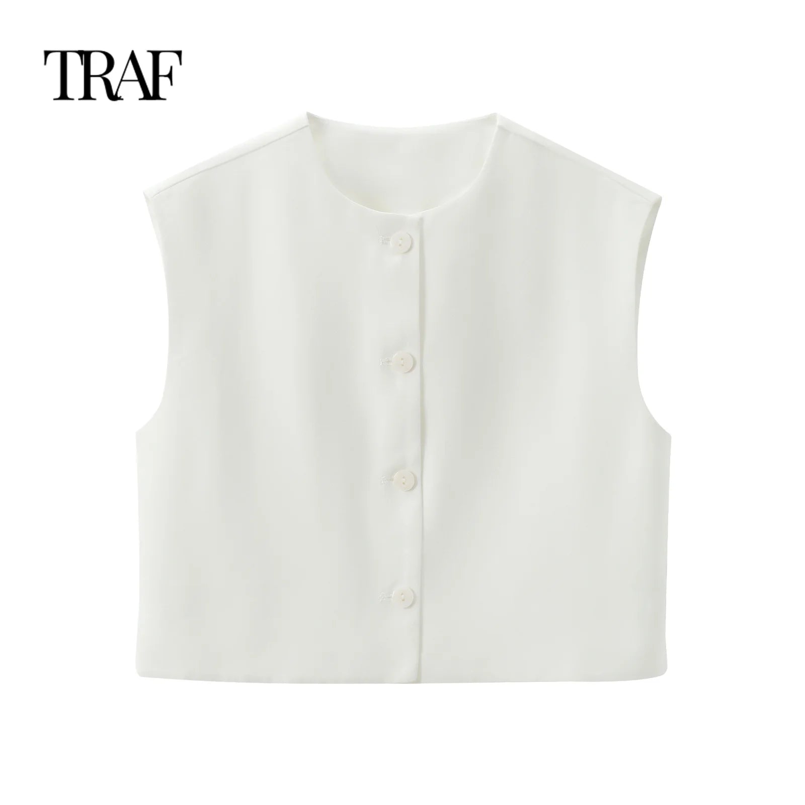 TRAF Women's Clothing Summer New Casual Sleeveless Round Neck Single-breasted Vest Style Shirt Chic Office Ladies Tops Mujer