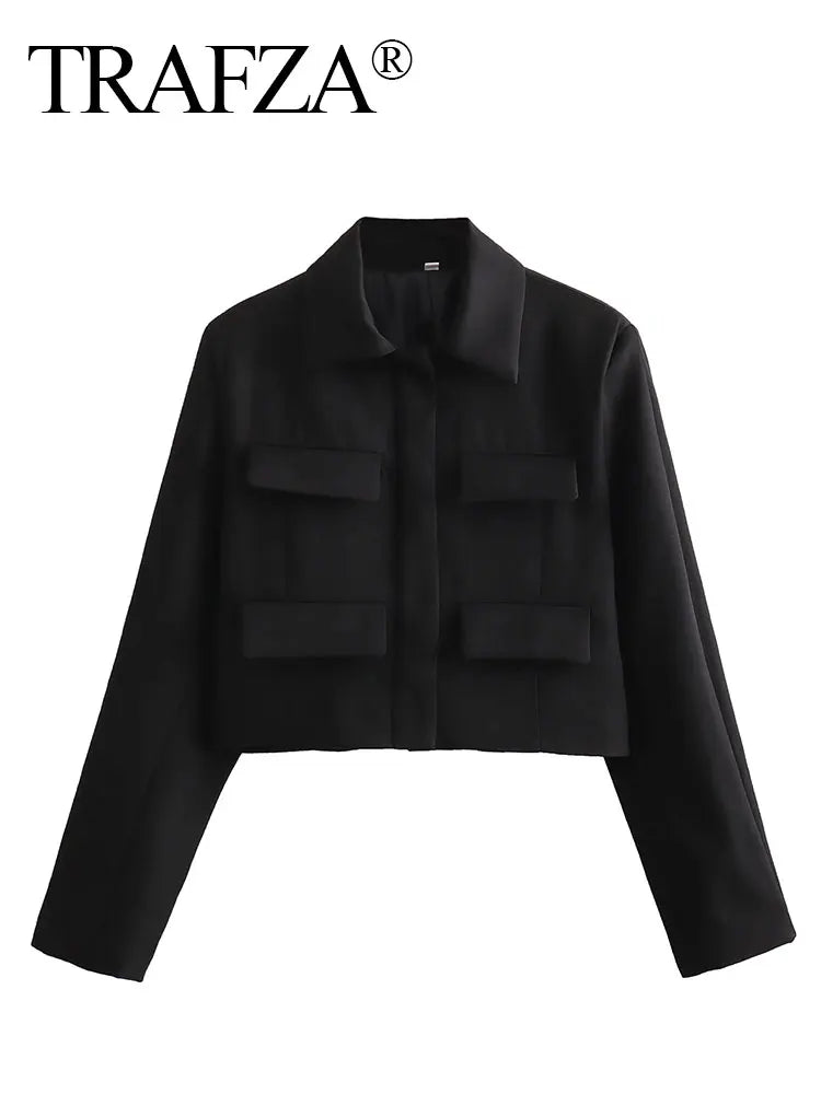TRAFZA Spring Jacket For Women Slim Cropped Coat Elegant Solid Long Sleeve Jacket Front Flap Pocket Outerwear Fashion Streetwear