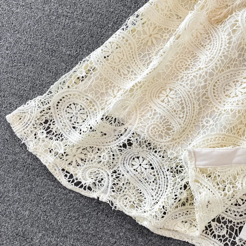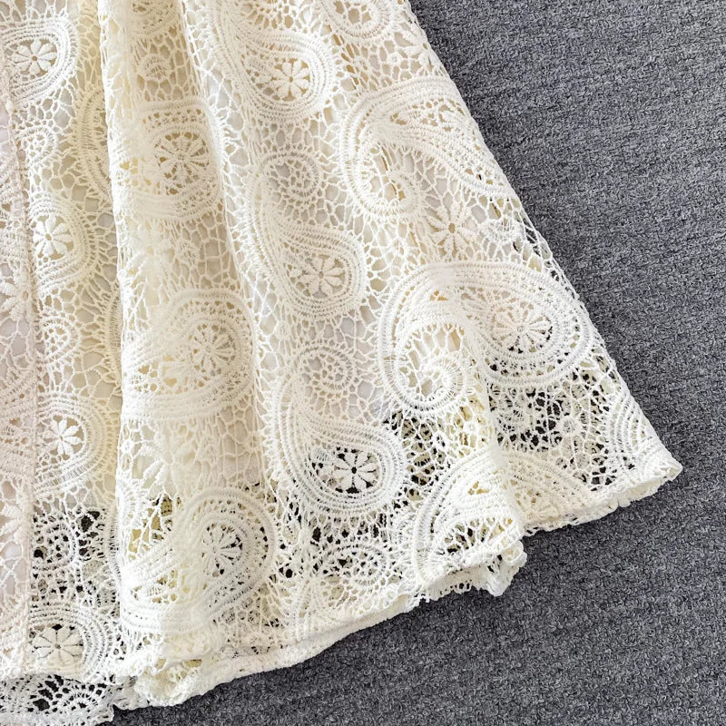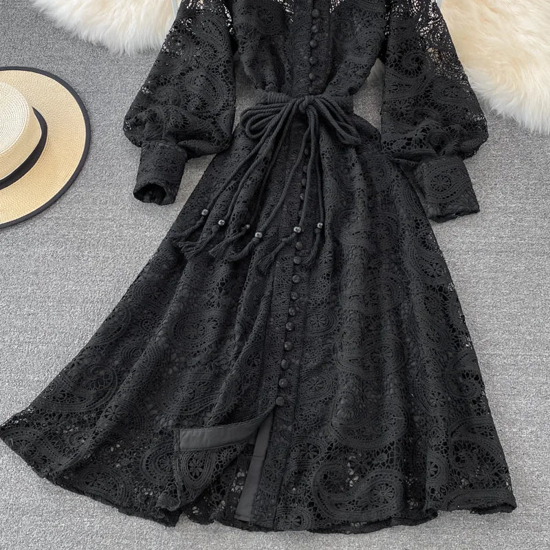 Vintage Court Style Lace Dress Women Elegant Hollowed Out Lantern Long Sleeve Slim Party Dresses Ladies Beige Black Long Robe