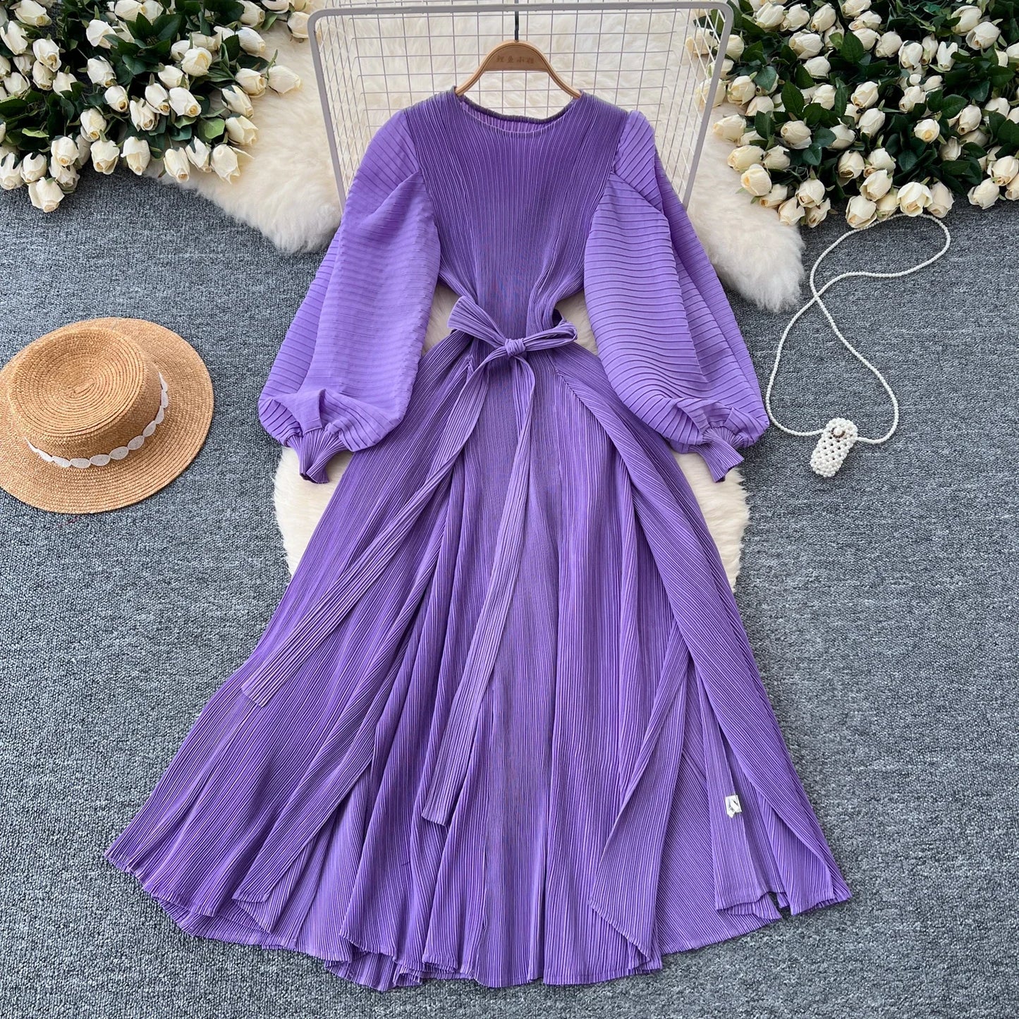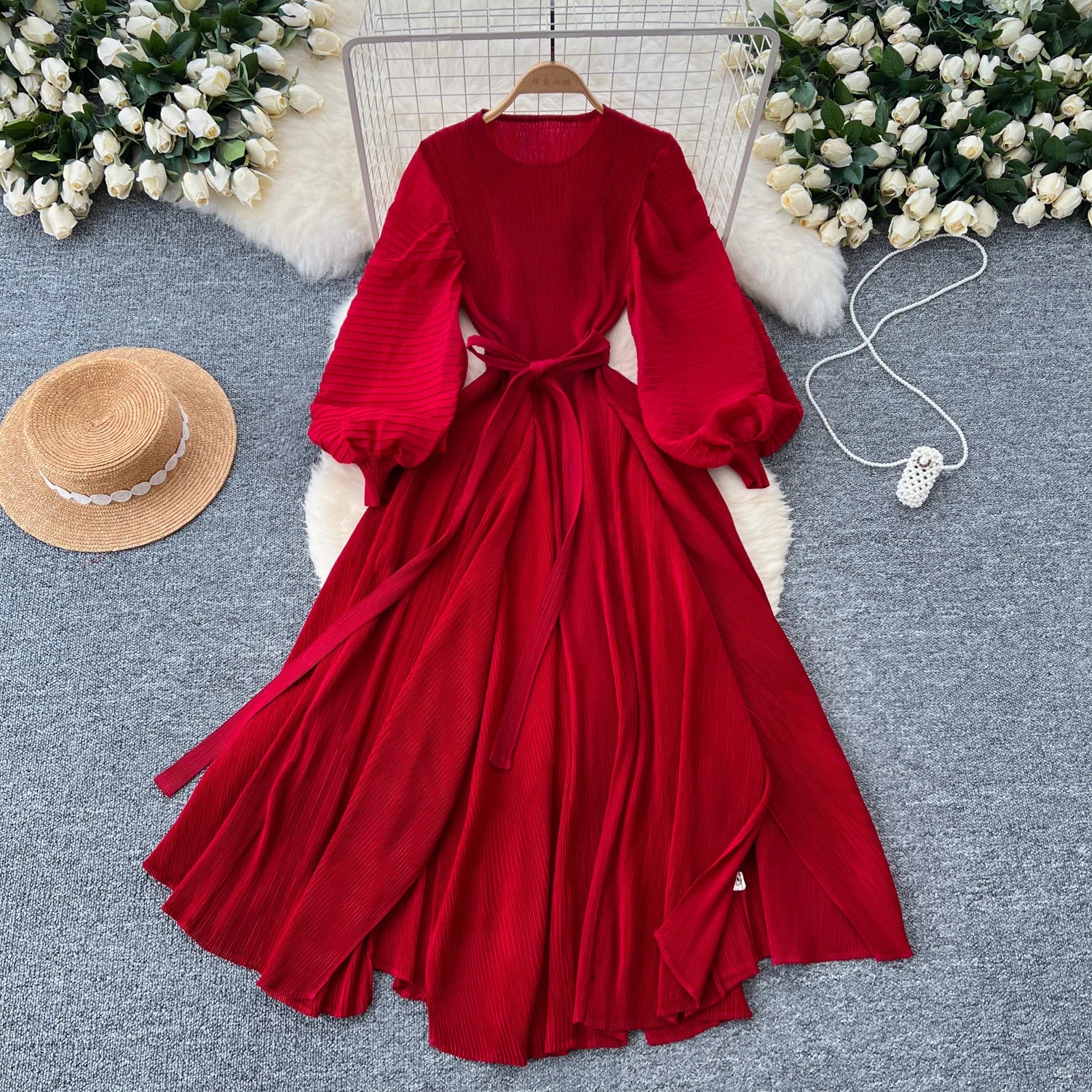Vintage Elegant Lantern Sleeve Sweet Pleated Dress Women Basics Fashion Summer Spring Dresse