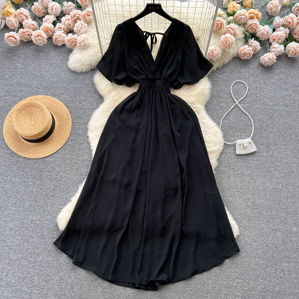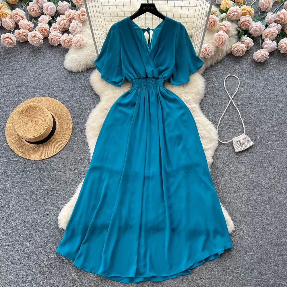 Vintage Elegant V-neck chiffon Dress A-line Fashion Beach Spring Summer Vestidos Women Bandage Sweet dresses