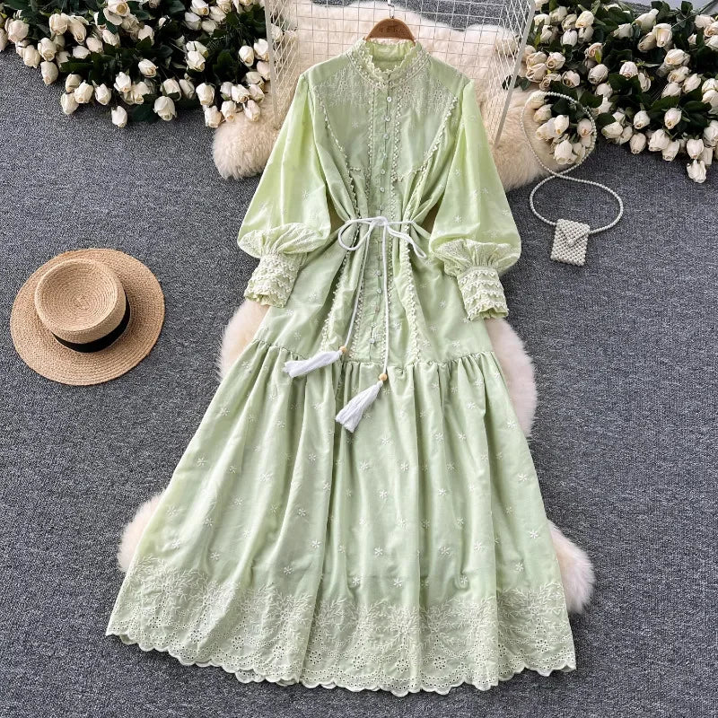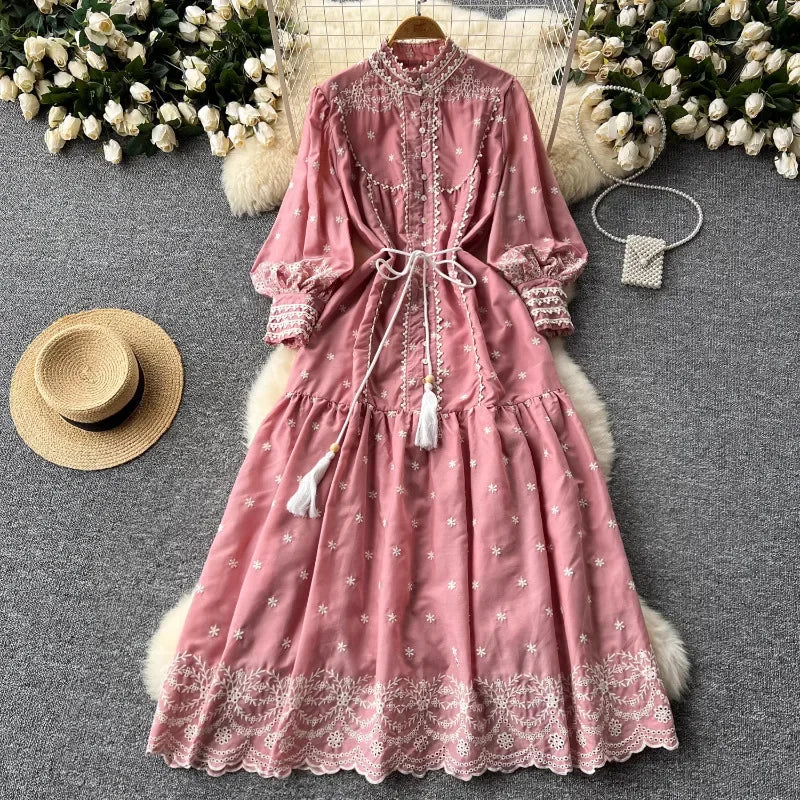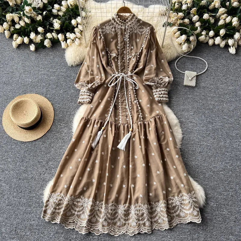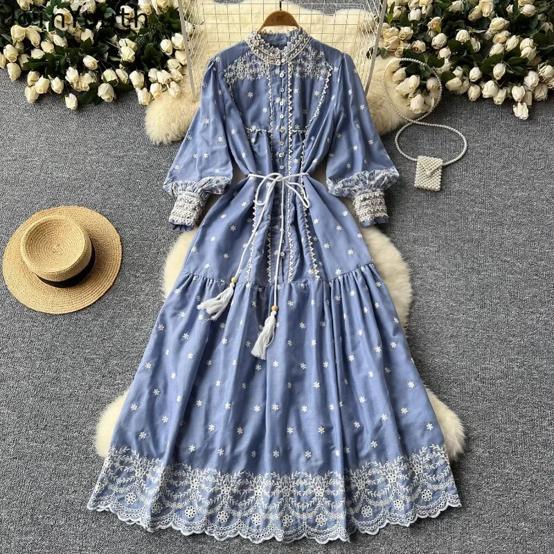 Vintage Embroidery Stand Collar Dresses for Women 2024 Summer New Robe Femme Heavy Elegant Lantern Sleeve Chic Vestido Feminino