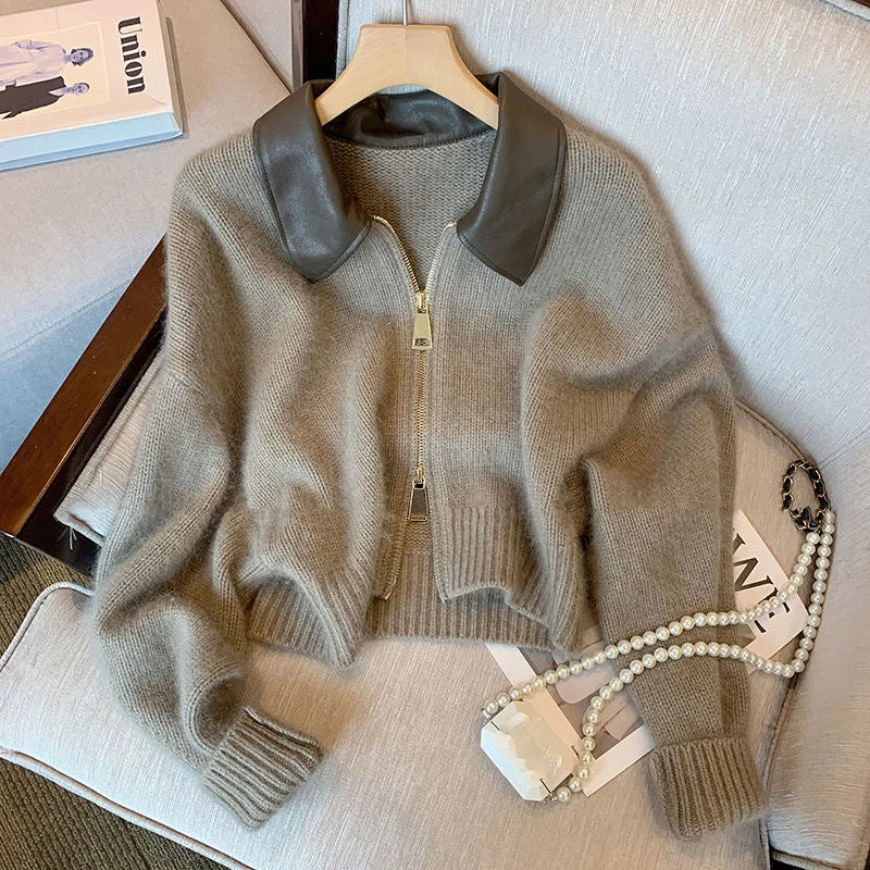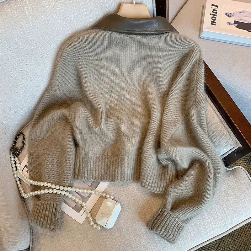 Vintage Leather Spliced Knitted Cardigan Coat Women Spring Lapel Collar Sweater Jacket Long Sleeve Loose Fitting Cropped Outwear
