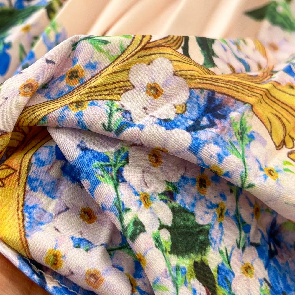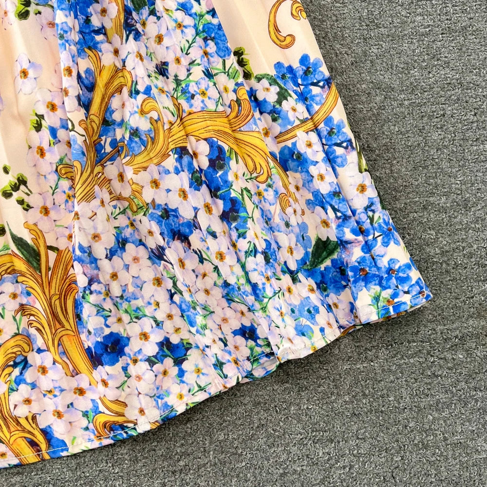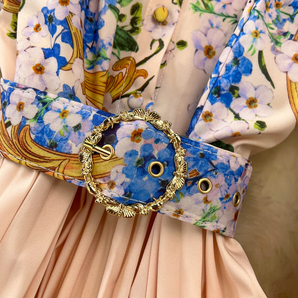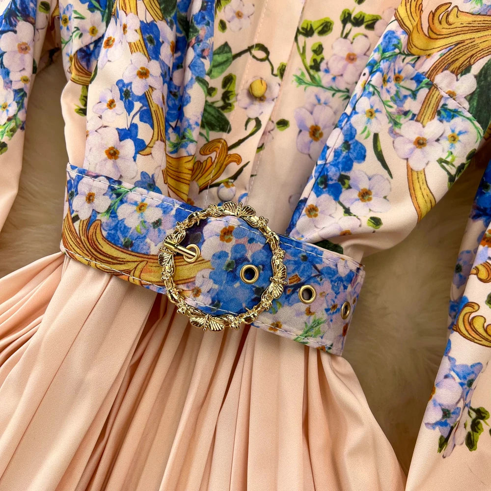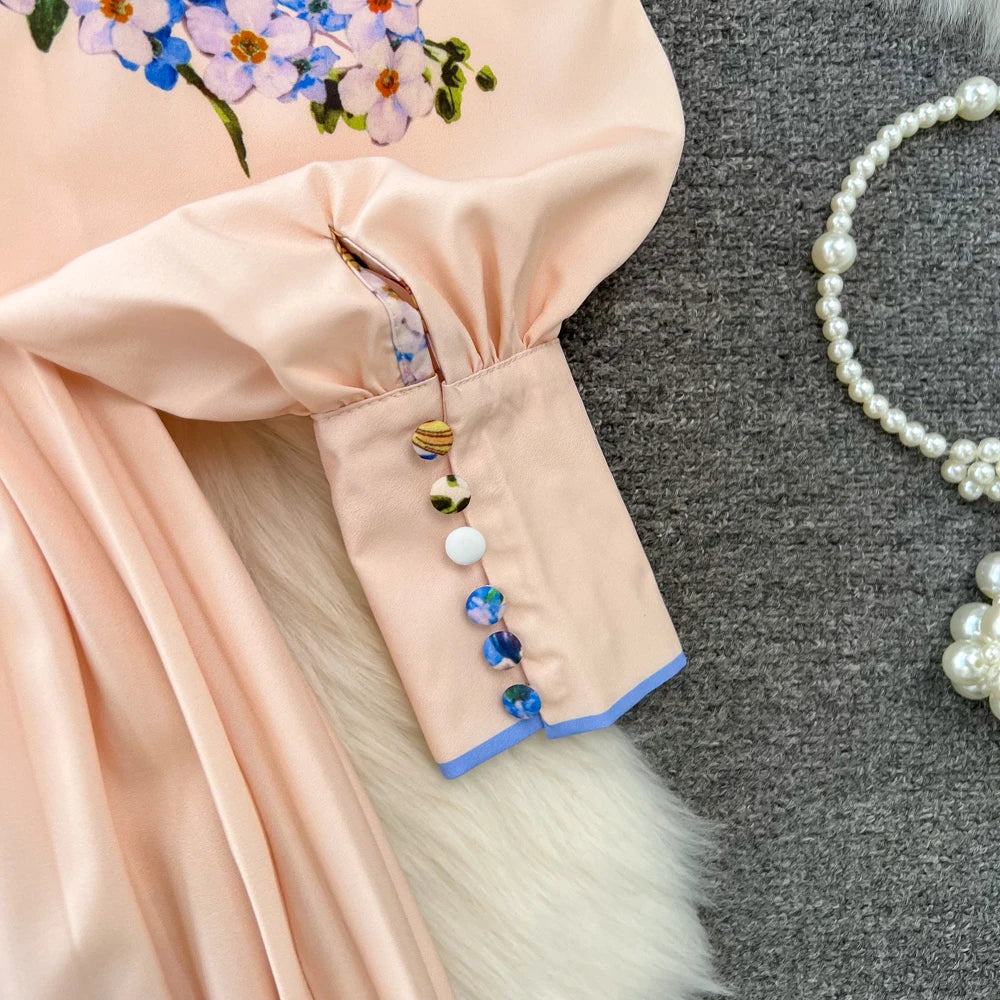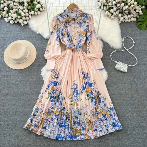 Vintage Print Elegant Lantern Long Sleeve Lapel A-line Dress Casual Women Fashion Autumn Spring Dress