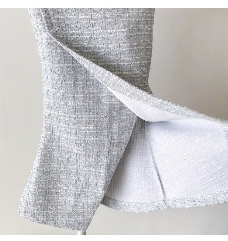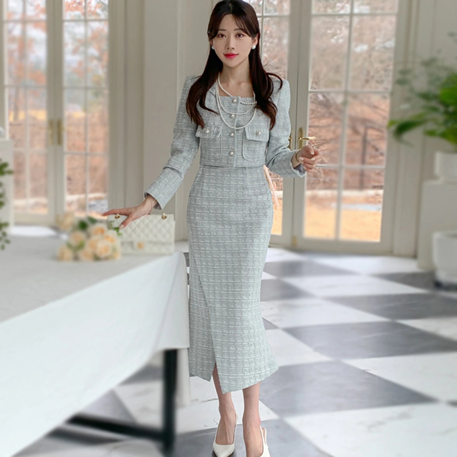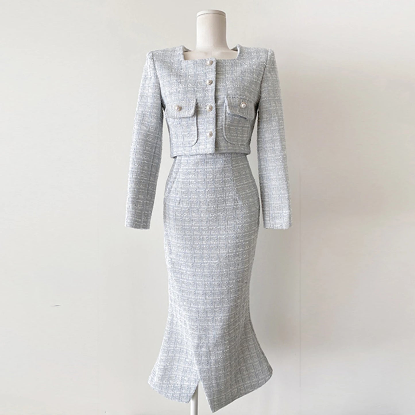 Vintage Tweed 2-piece Spring Autumn Women’s Elegant Two Pieces Set Pearl Buckle Cropped Coats+Pencil Skirt Small Fragrant Suits