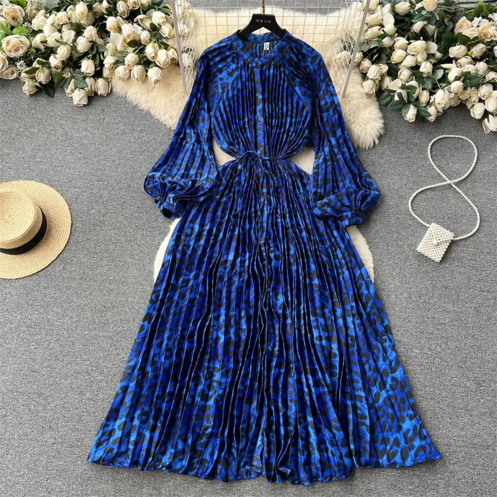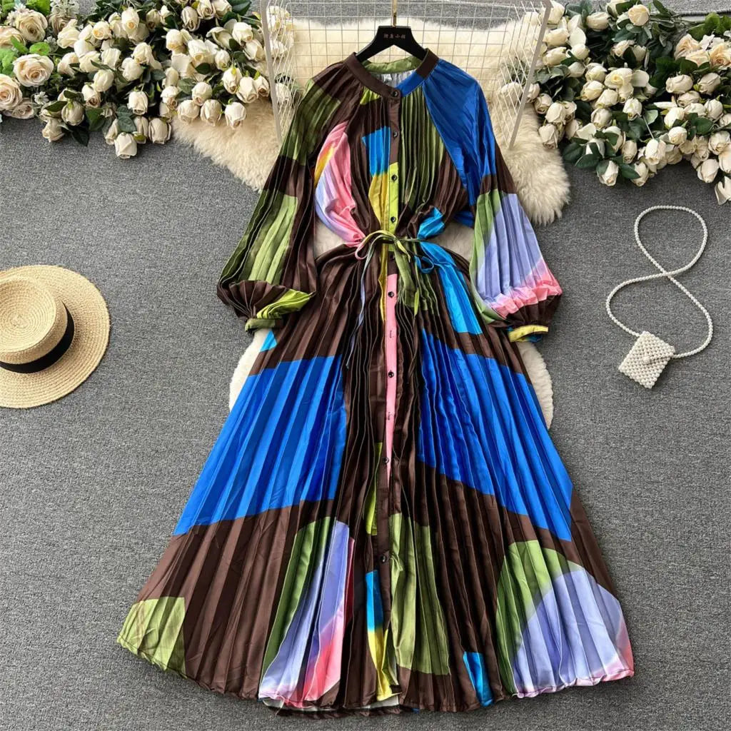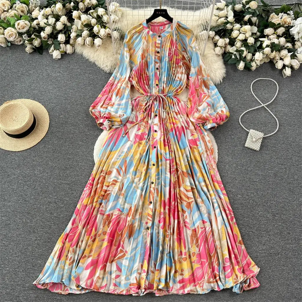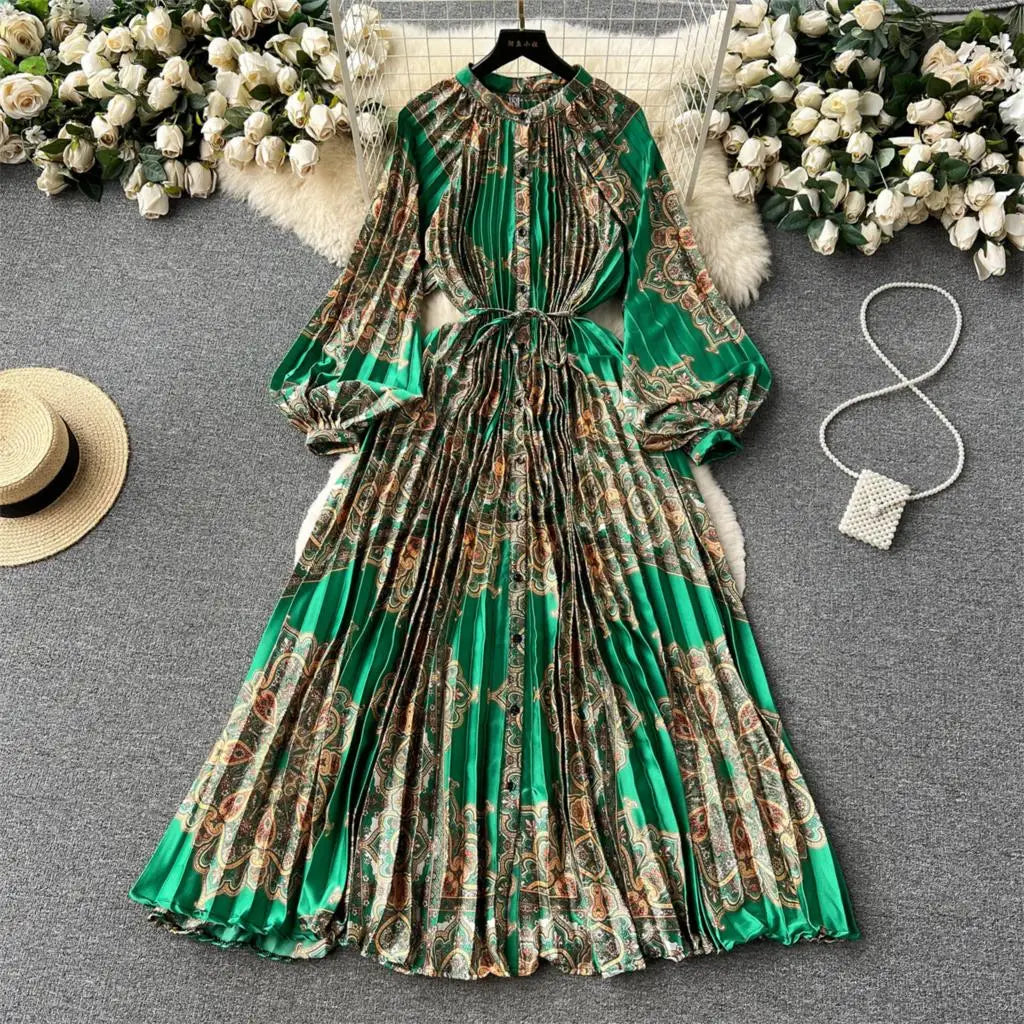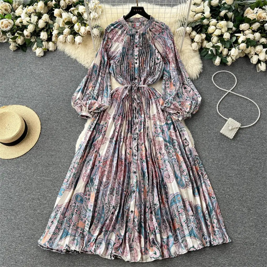 Vintage Women Casual Floral Print Long Party Dress Elegant and Chic A-Line Pleated Prom Birthday Clothes Female Fashion Robe