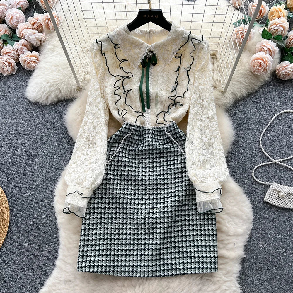 Winter Clothes Women Dresses Long Sleeve Lace Patchwork Textured Tweed Dress Ruffled Trim Lapel Collar Bow Elegant Mini Dress