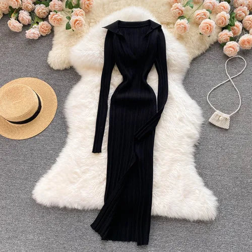 Women Chic Elegant Long Sleeve Split Bodycon Midi Dress Sexy French Fashion Knit Wrap Vestidos Elastic Slim Pencil Sweater Dress