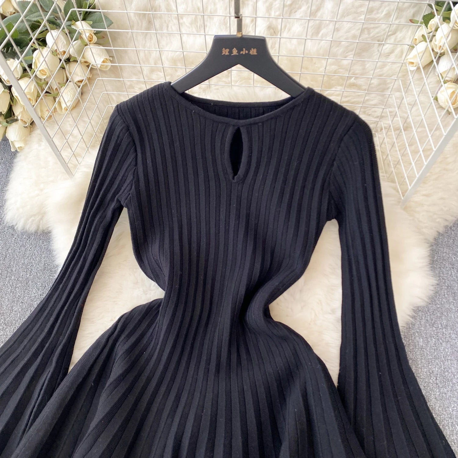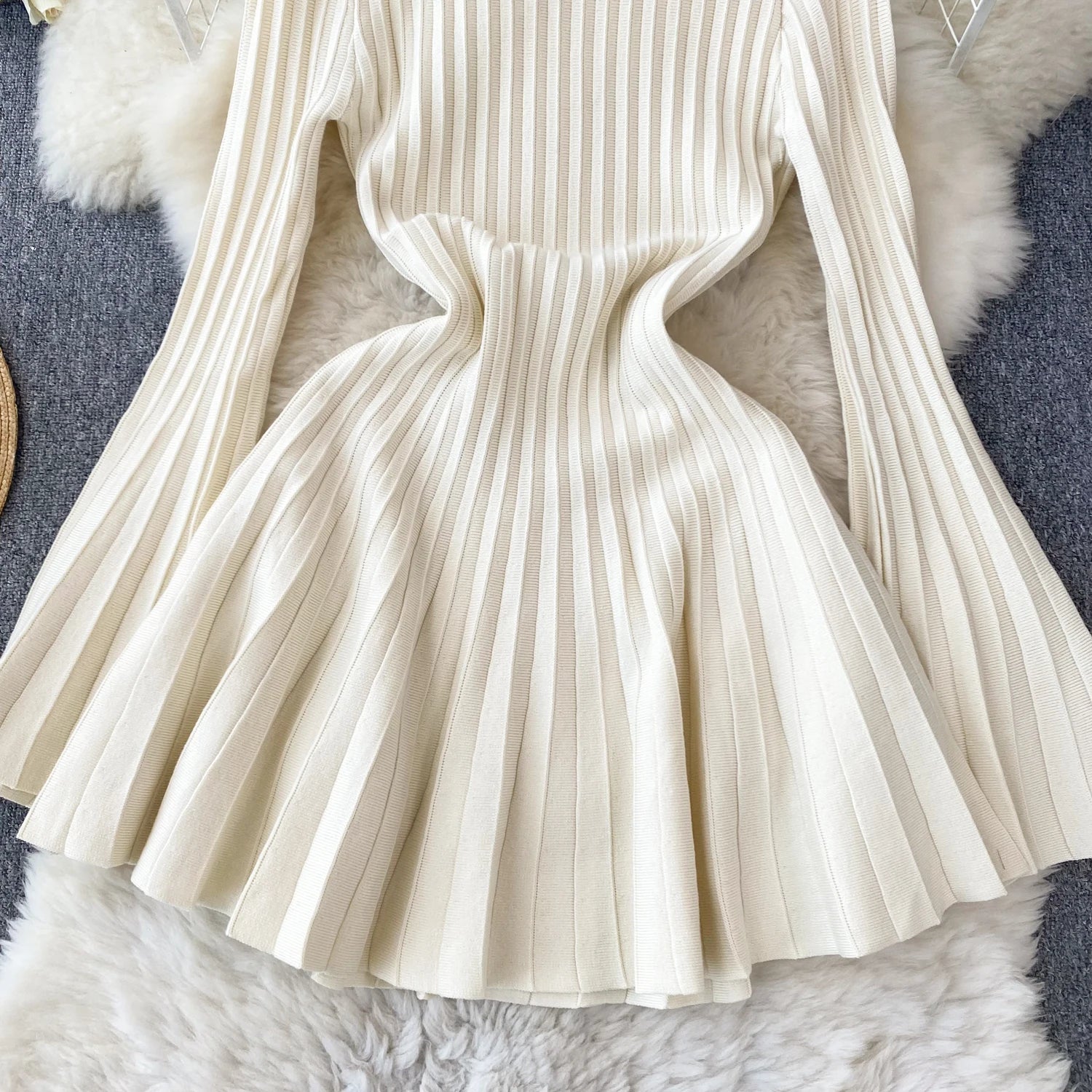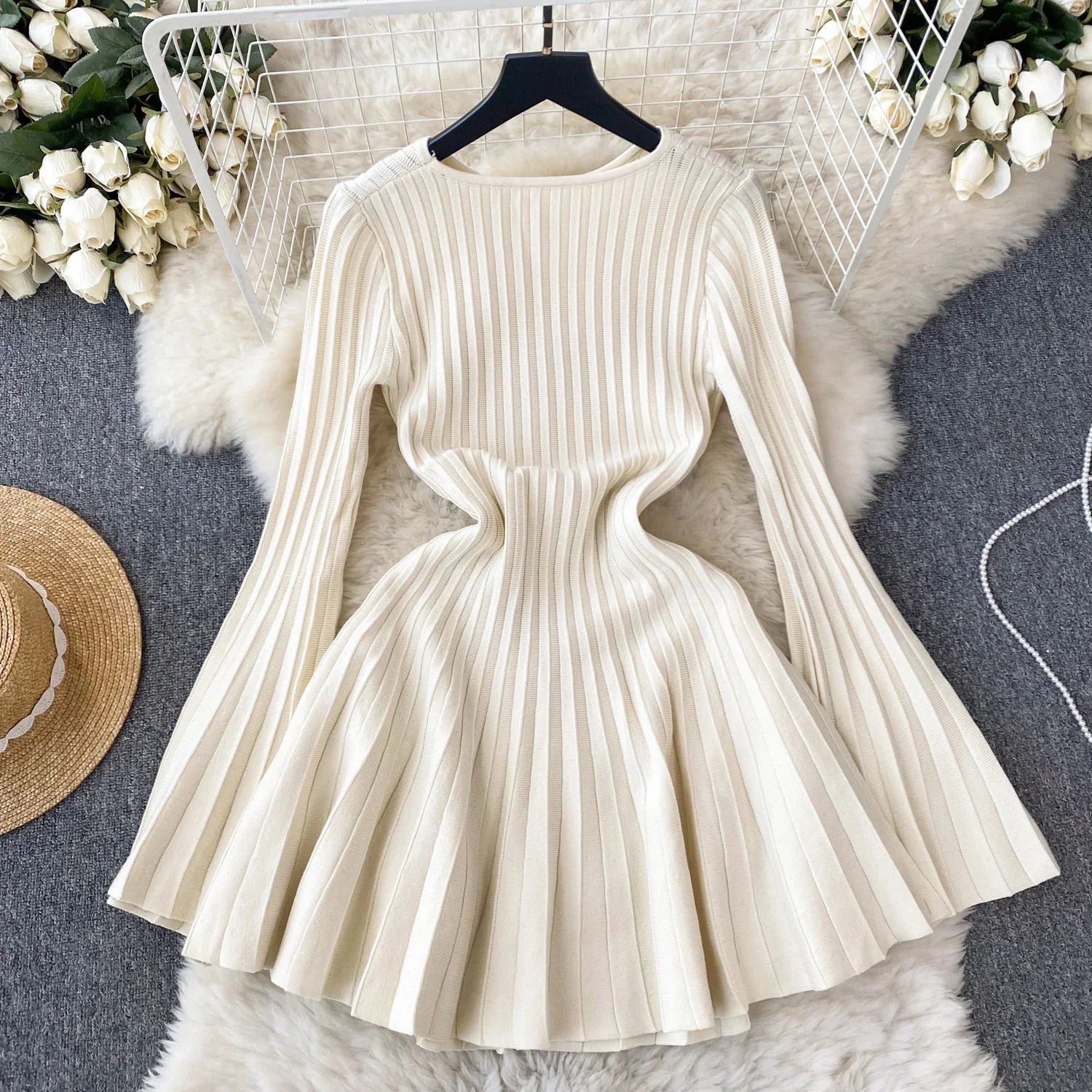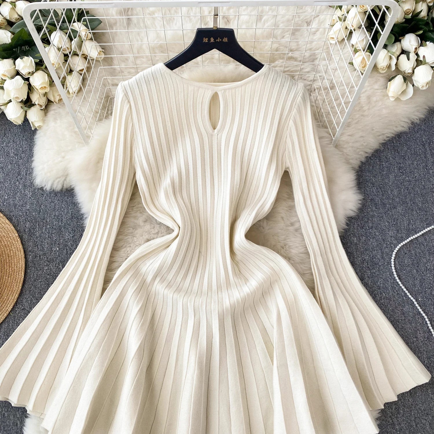 Women Chic Elegant O Neck Long Sleeve Dress French Sexy Fashion Knit Elastic Slim A-line Mini Dress