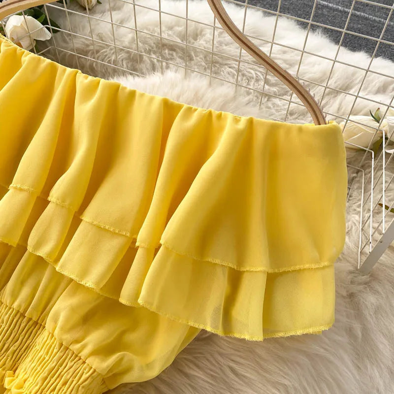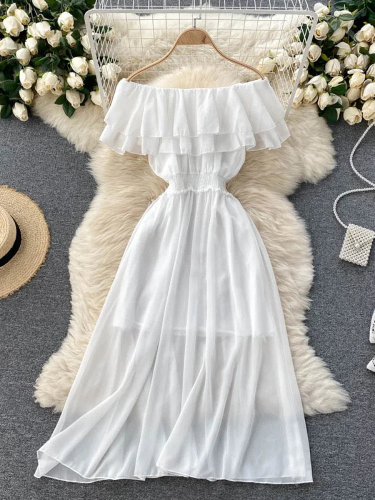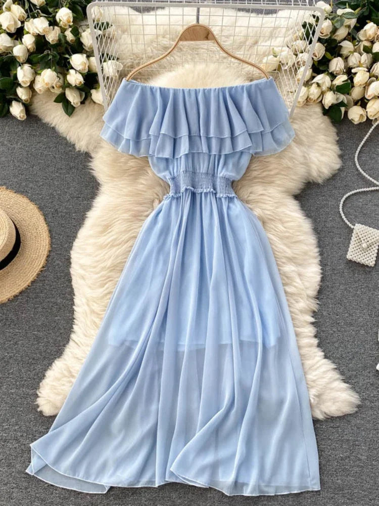 Women Chiffon Beach Dress Sexy Double Layer Ruffled Off The Shoulder Boho Dresses Ladies Sweet Slash Neck Long Dress
