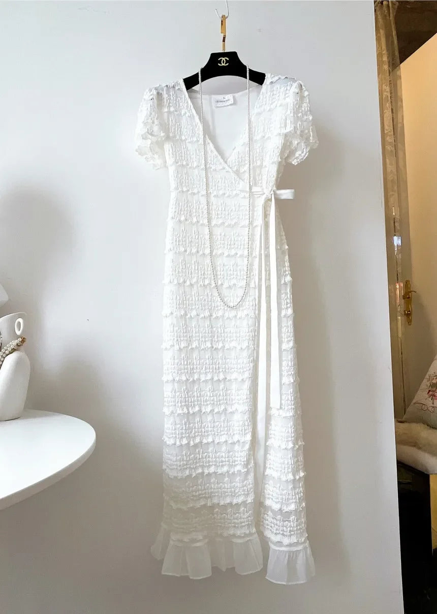 Women Elegant Bodycon Dress Summer Sexy V-neck Short Sleeve Korean Long Dresses Ladies Vintage Solid White Black Long Robe