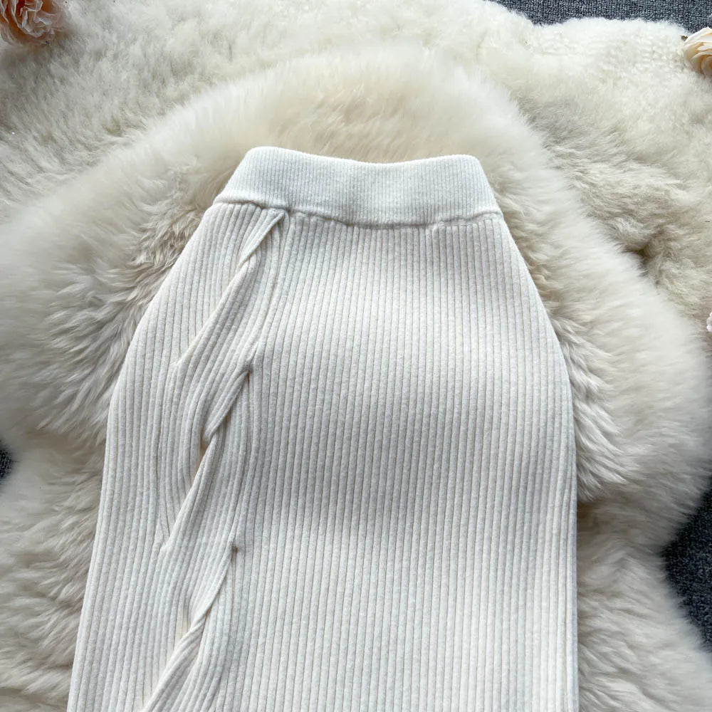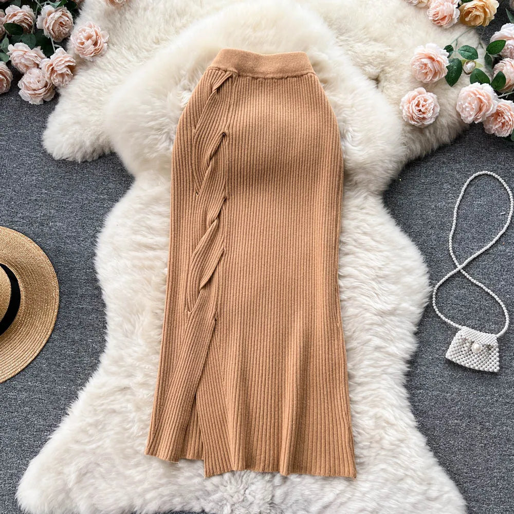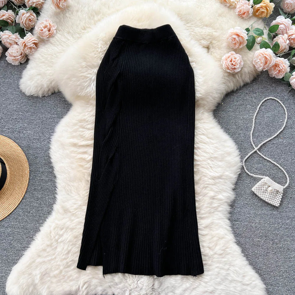 Women Elegant Chic Split Sexy Skirt Elastic Knit High Waist Fashion Vintage Pencil Skirt Black White Spring Autumn Clothing