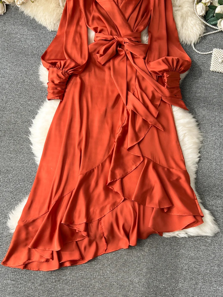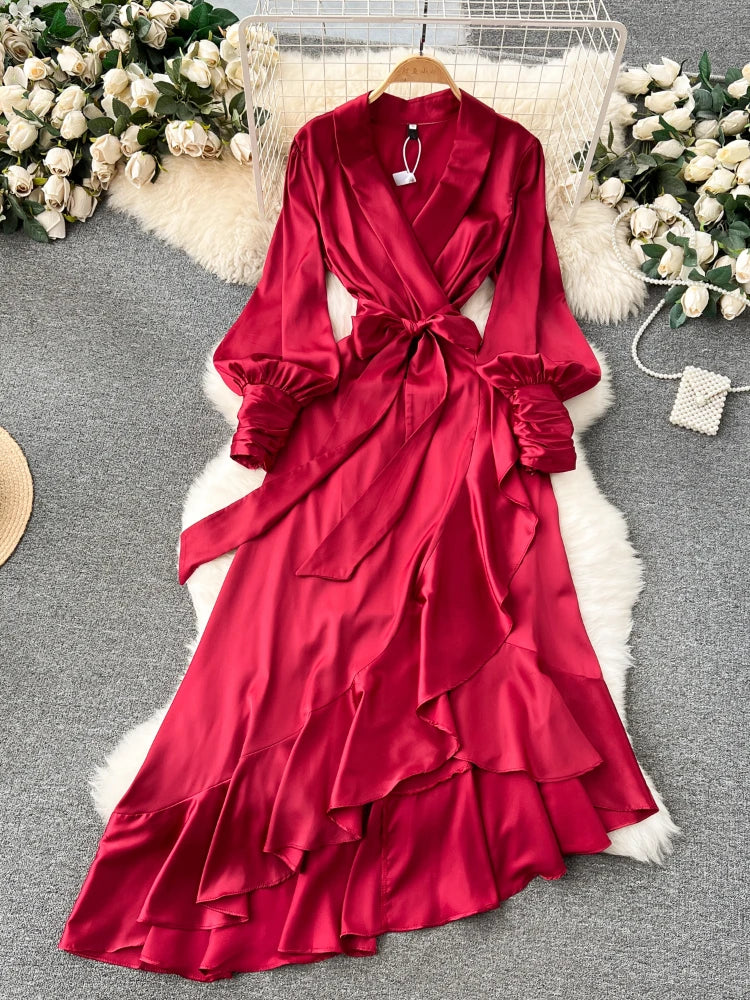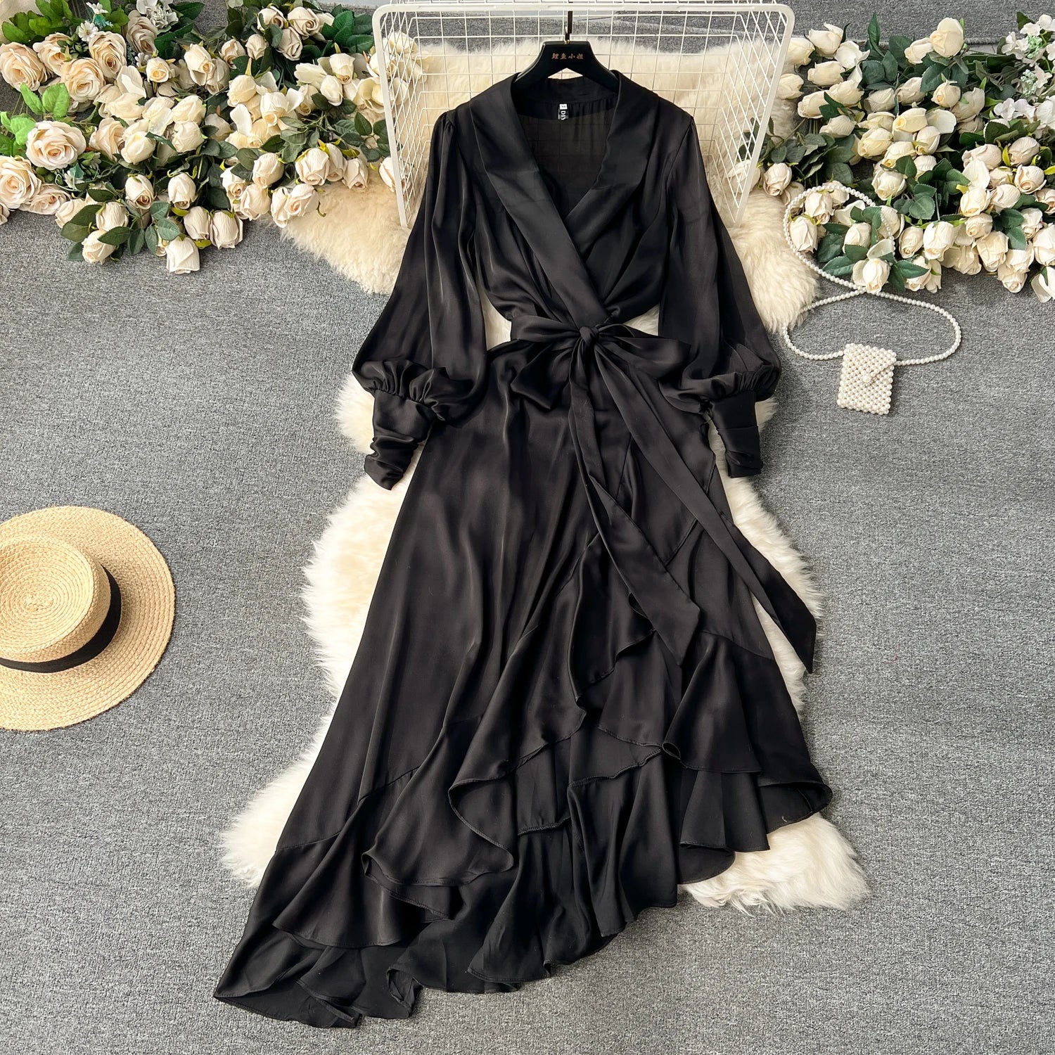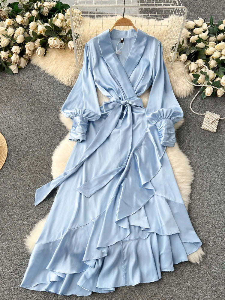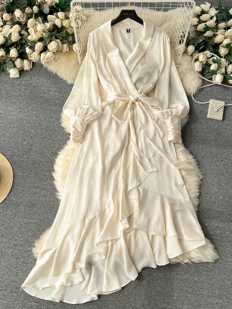 Women Elegant Satin Dress Summer Bandage High Waisted Ruffled Irregular Blazer Dresses Ladies A-line Vintage Party Long Robe