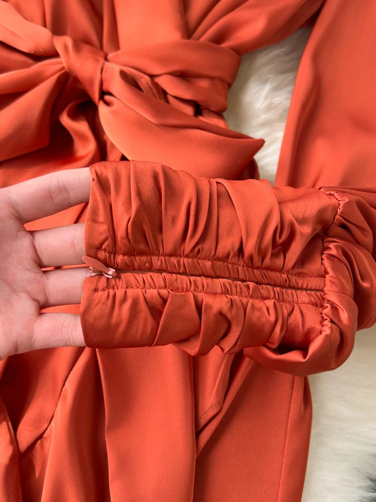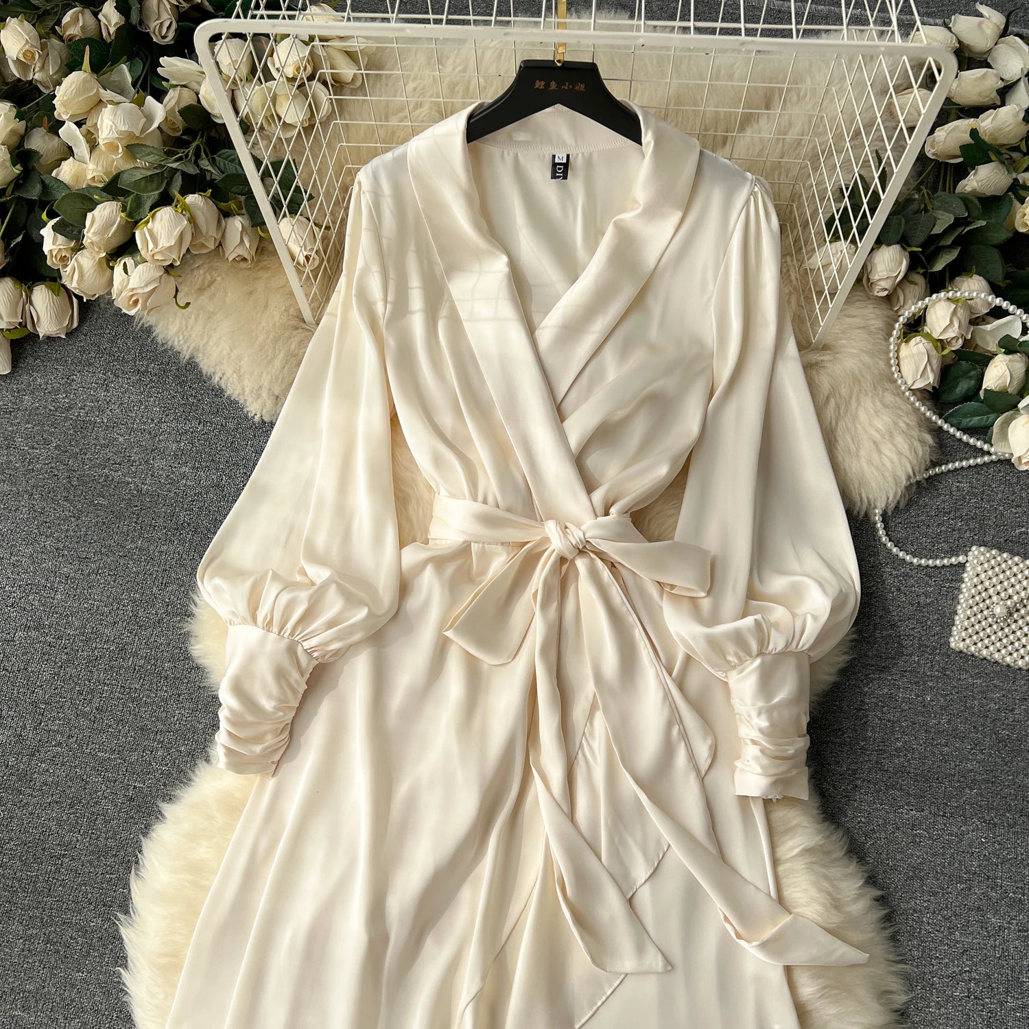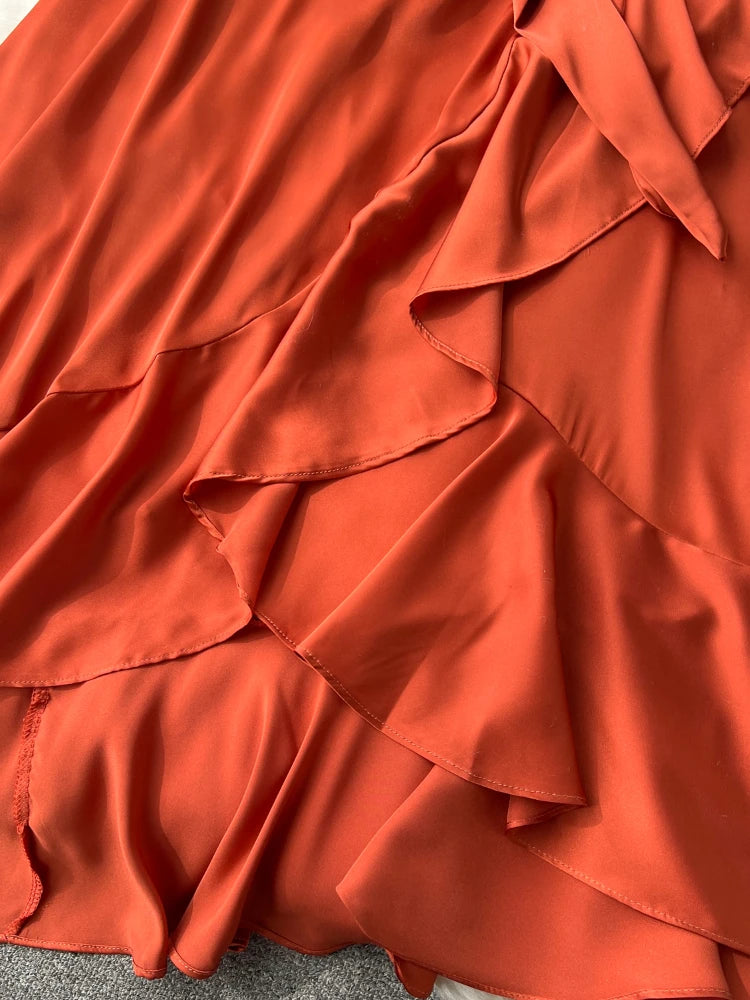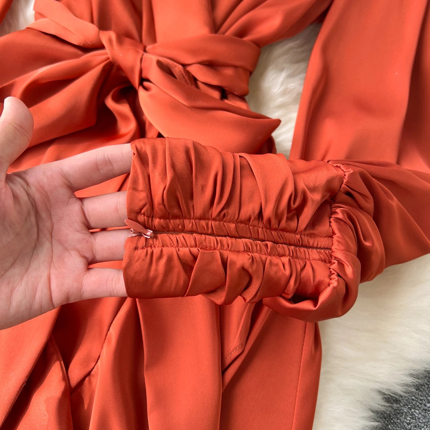 Women Elegant Satin Dress Summer Bandage High Waisted Ruffled Irregular Blazer Dresses Ladies A-line Vintage Party Long Robe